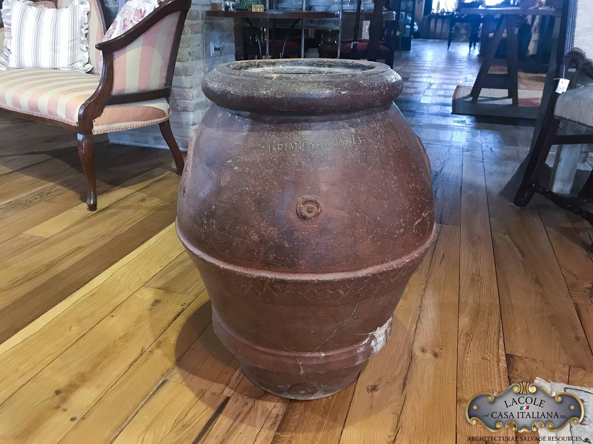 Antique terracotta jar, signed by Falciani Mariano companyImpruneta. Greek relief in the central part, enameled inside. Second half of 1800.