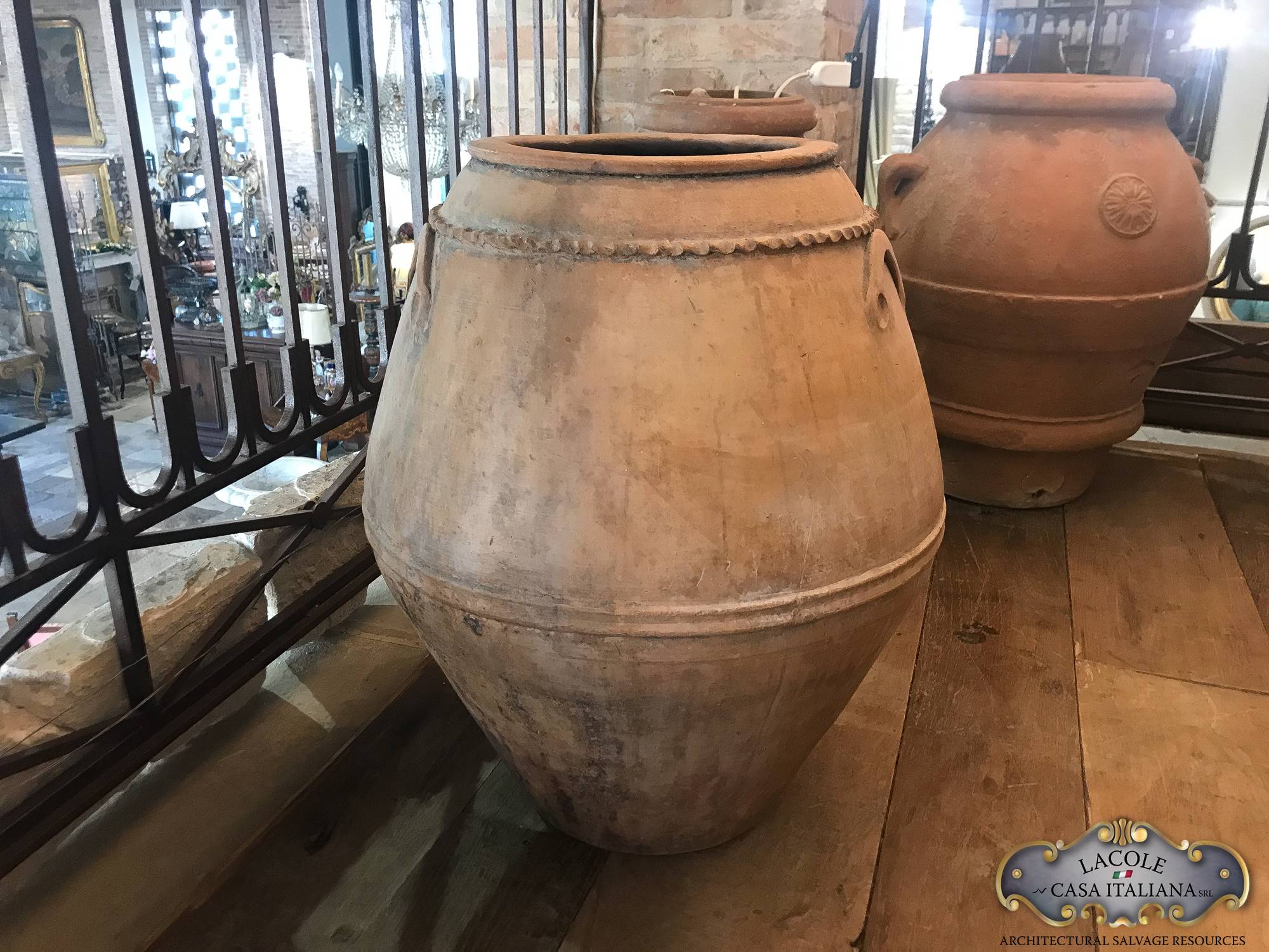 Antique jar made in terracotta, with a ‘pot-bellied’ shape and greek relief.