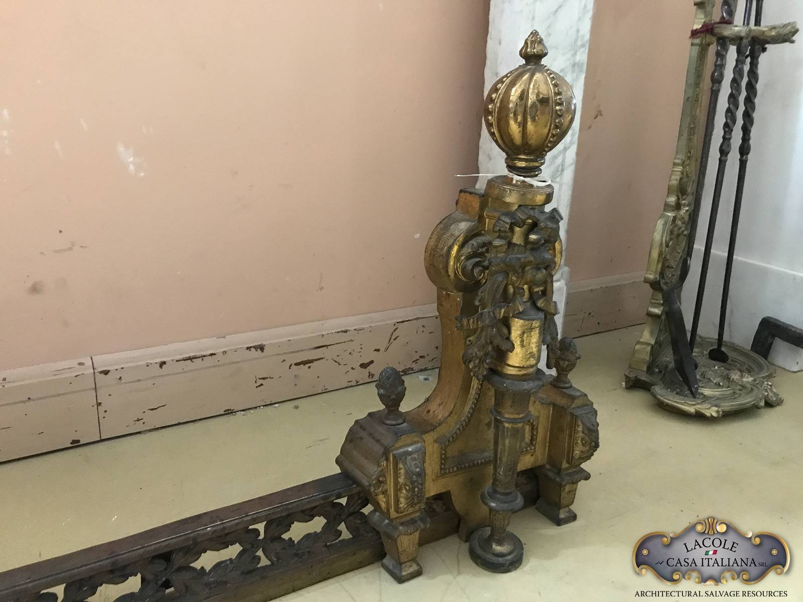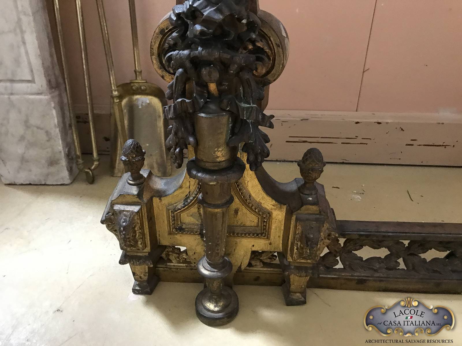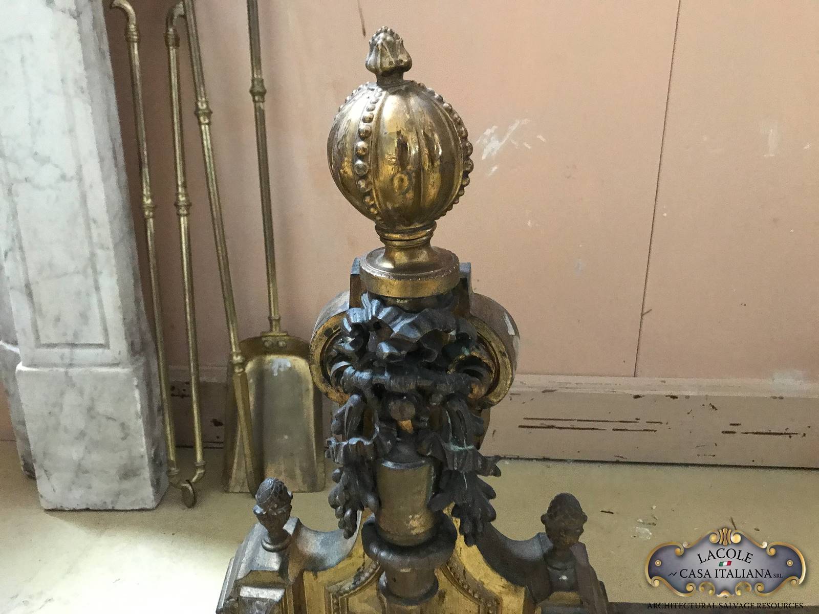 Antique pair of fire dogs, with ashtray flounce, finely embossed in bronzed and chiseled brass. Half 1800.