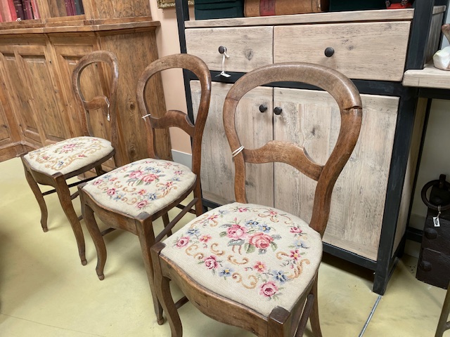 Set of antique walnut chairs with upholstered seats. Three pieces available. Conservative restoration completed.