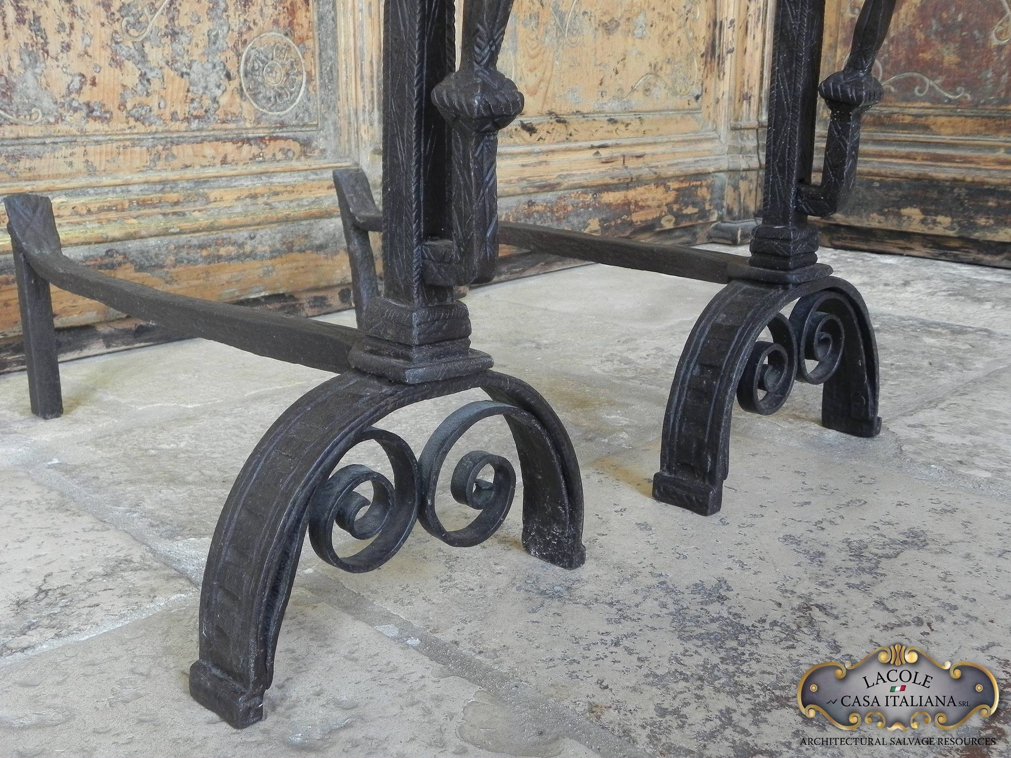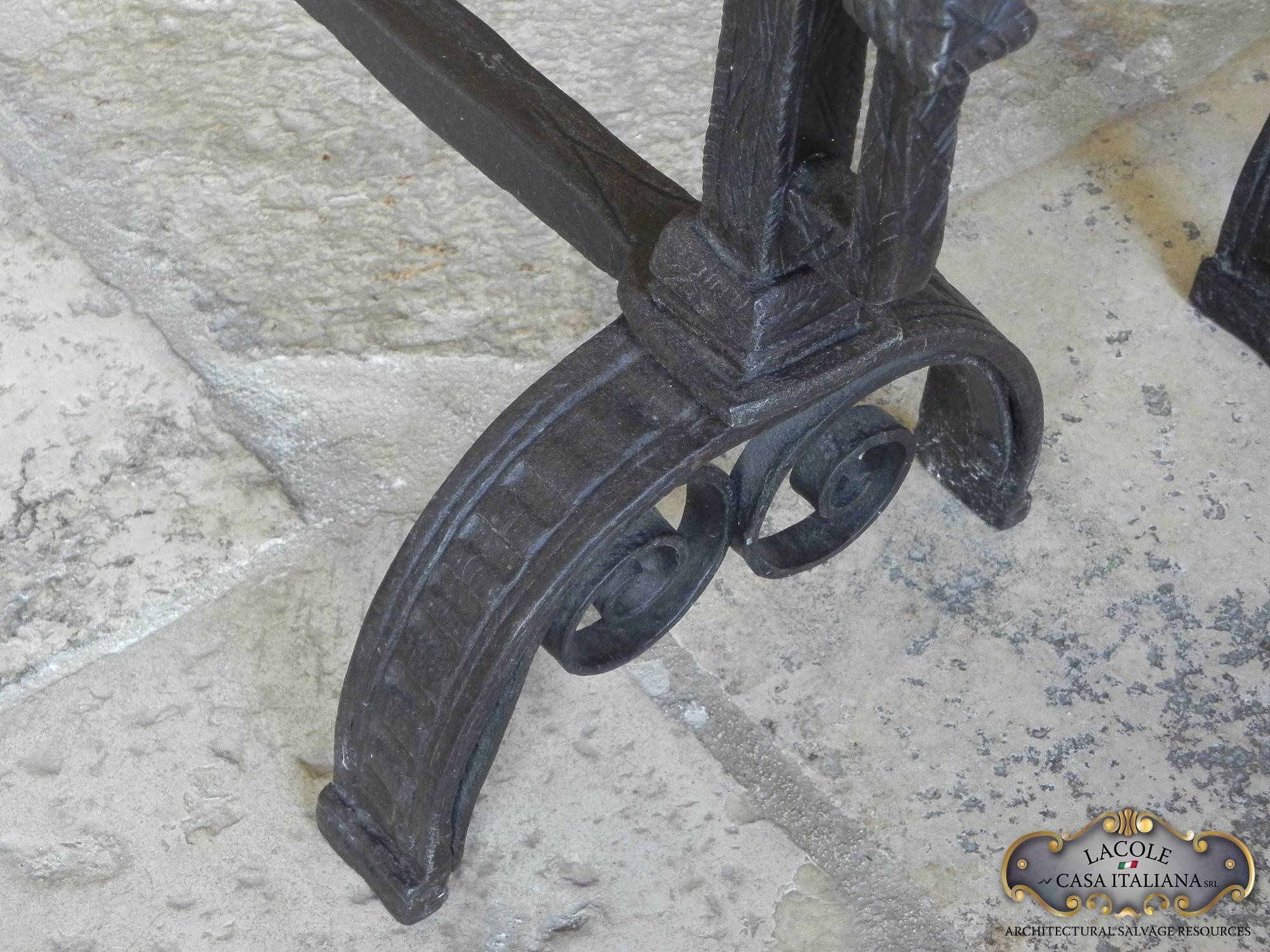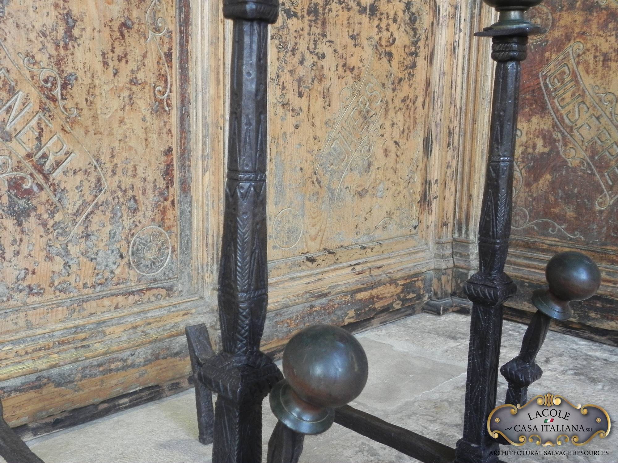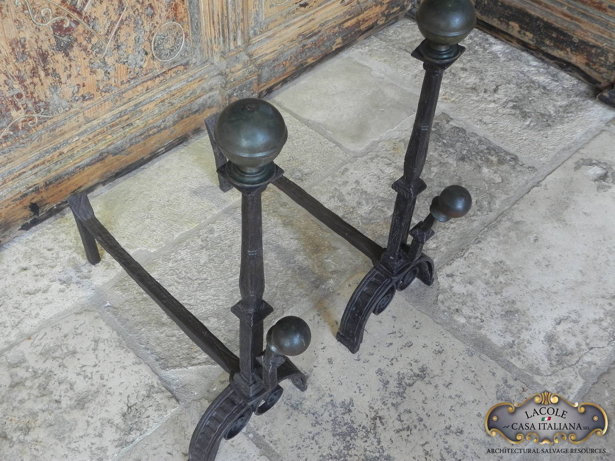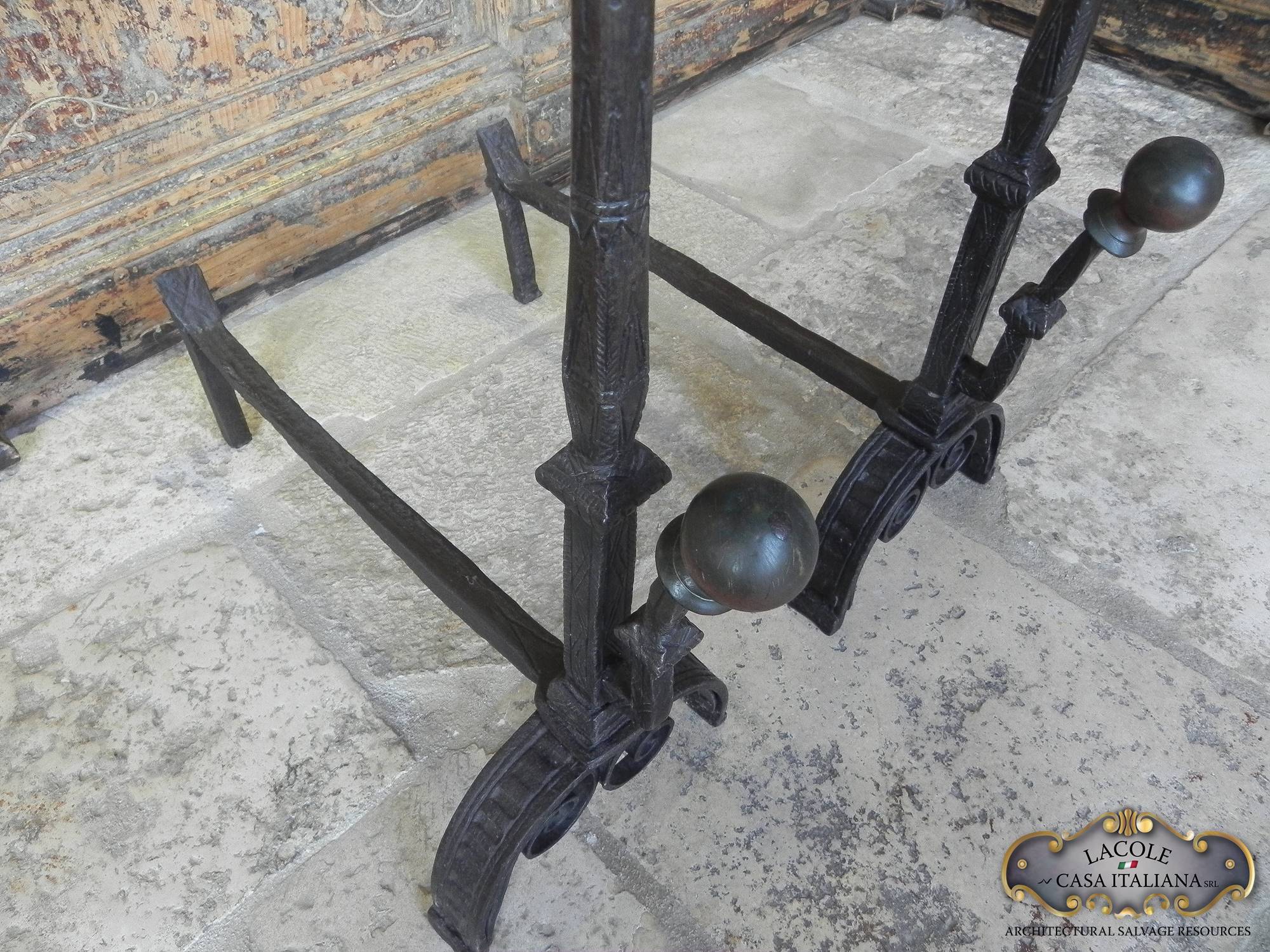 Antica coppia di alari in ferro battuto incisi con lavorazioni di particolare pregio; struttura a quattro pomelli in bronzo originali.