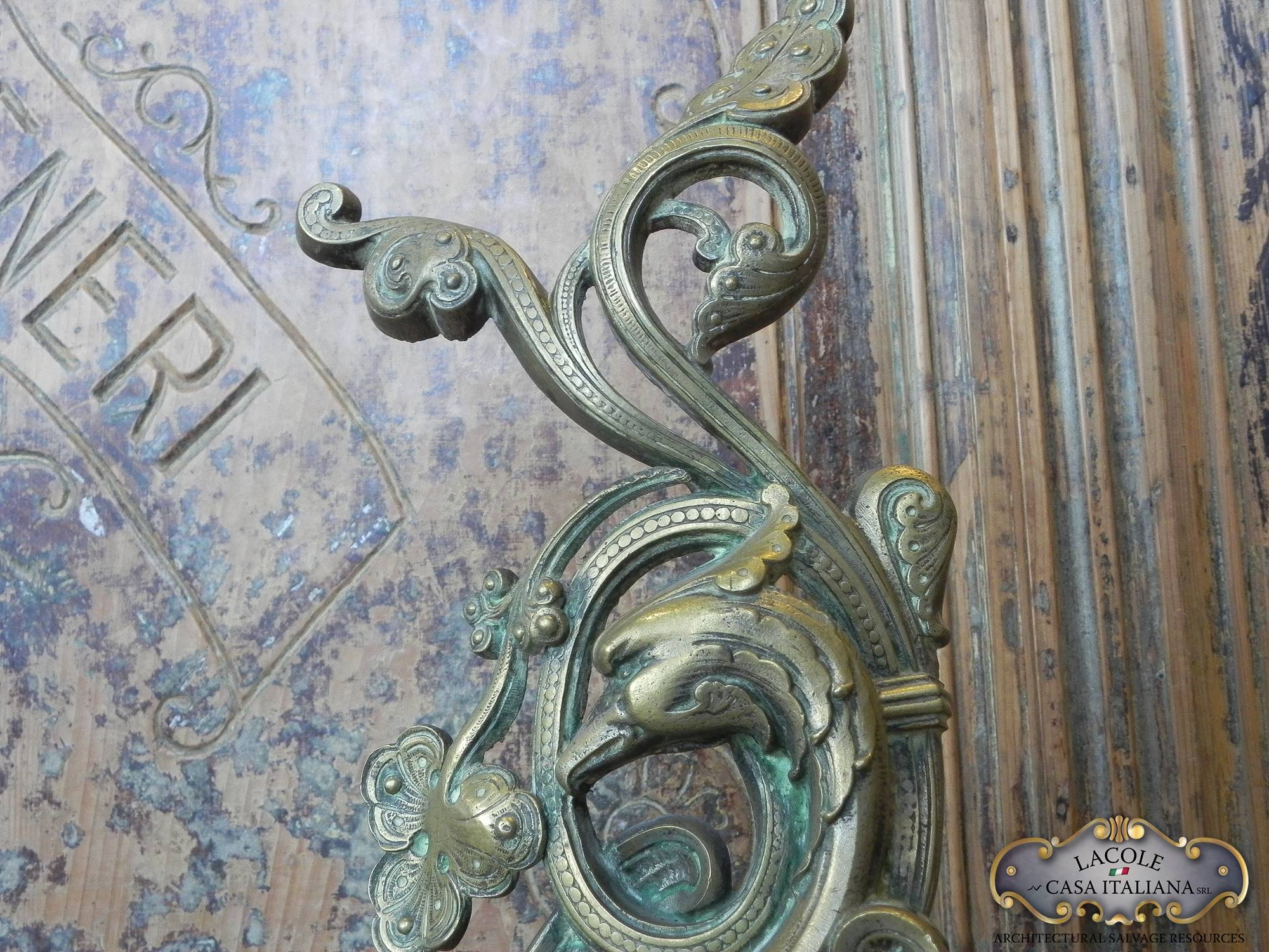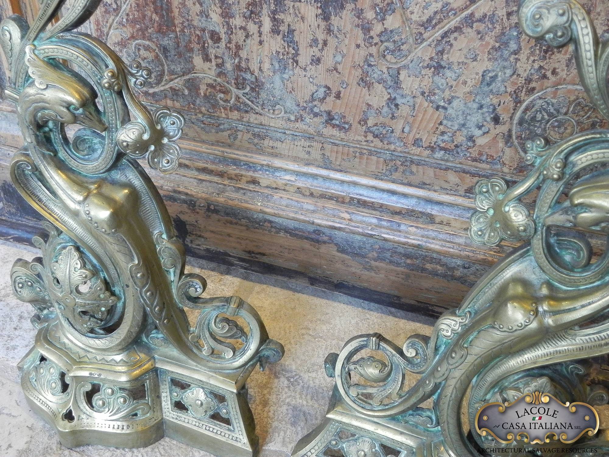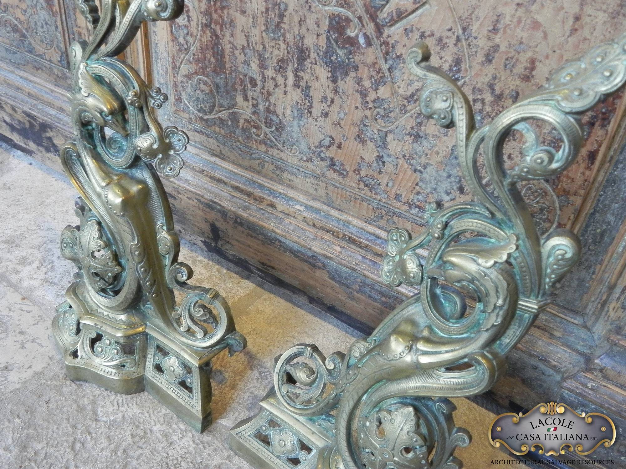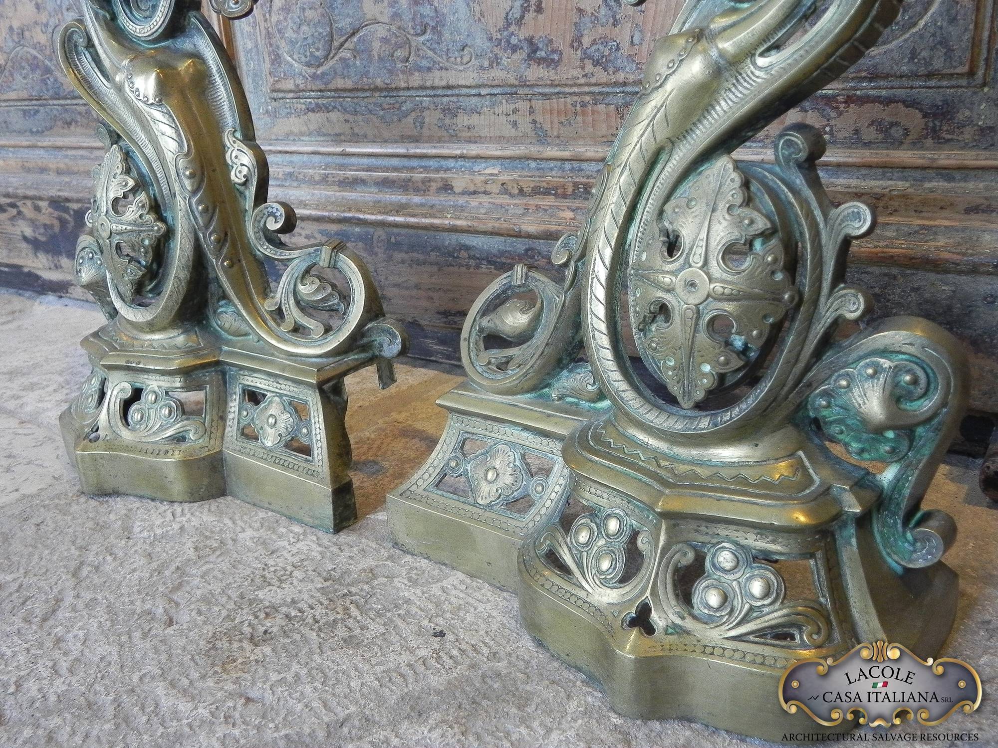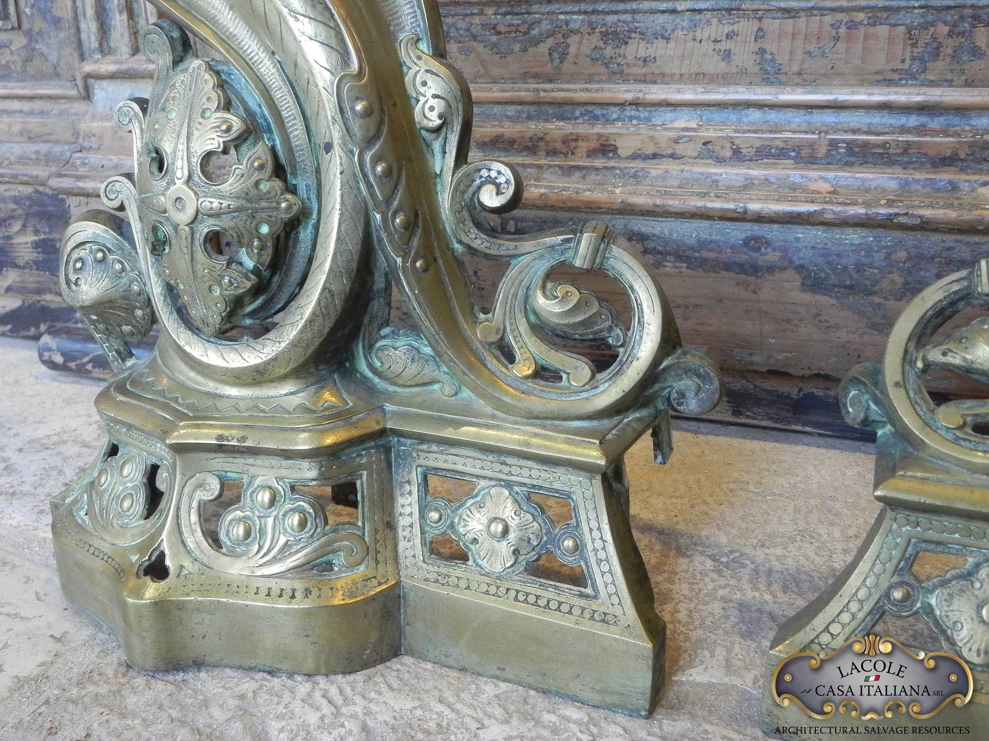 Coppia di importanti alari in bronzo sbalzati ed incisi.