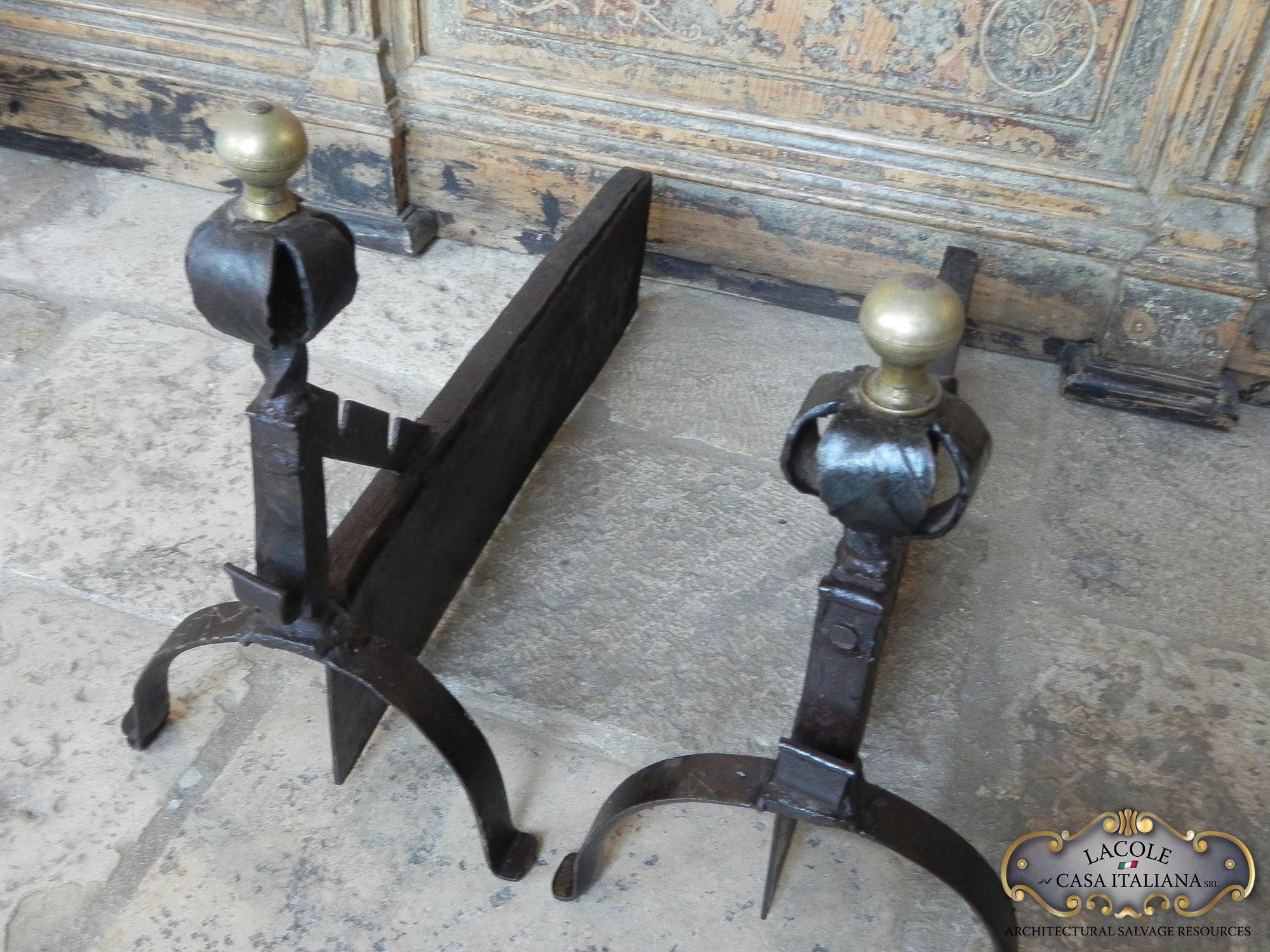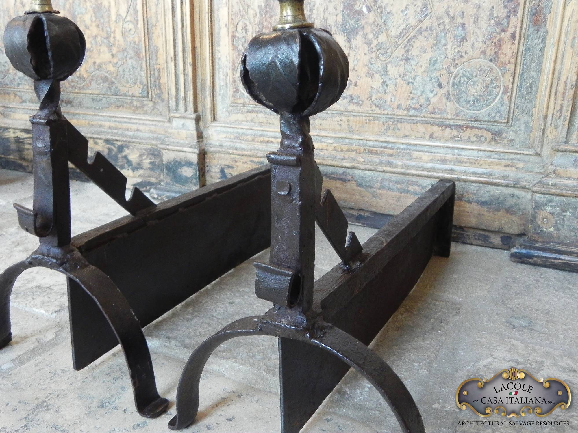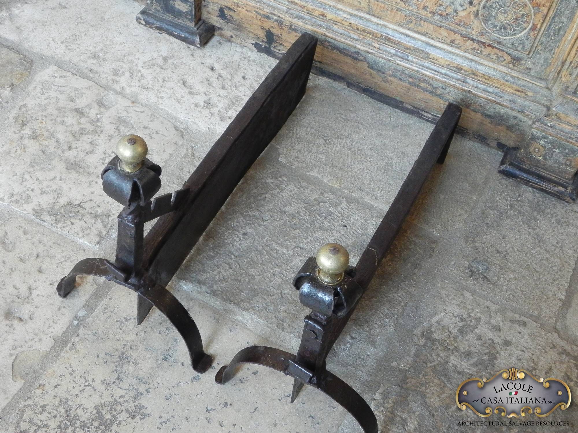 Antica coppia di alari in ferro battuto e pomelli di ottone.