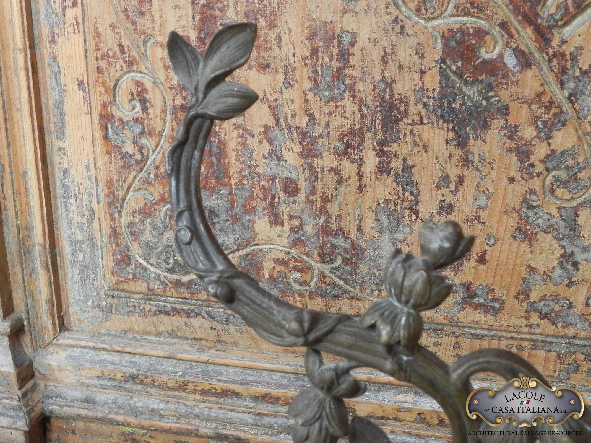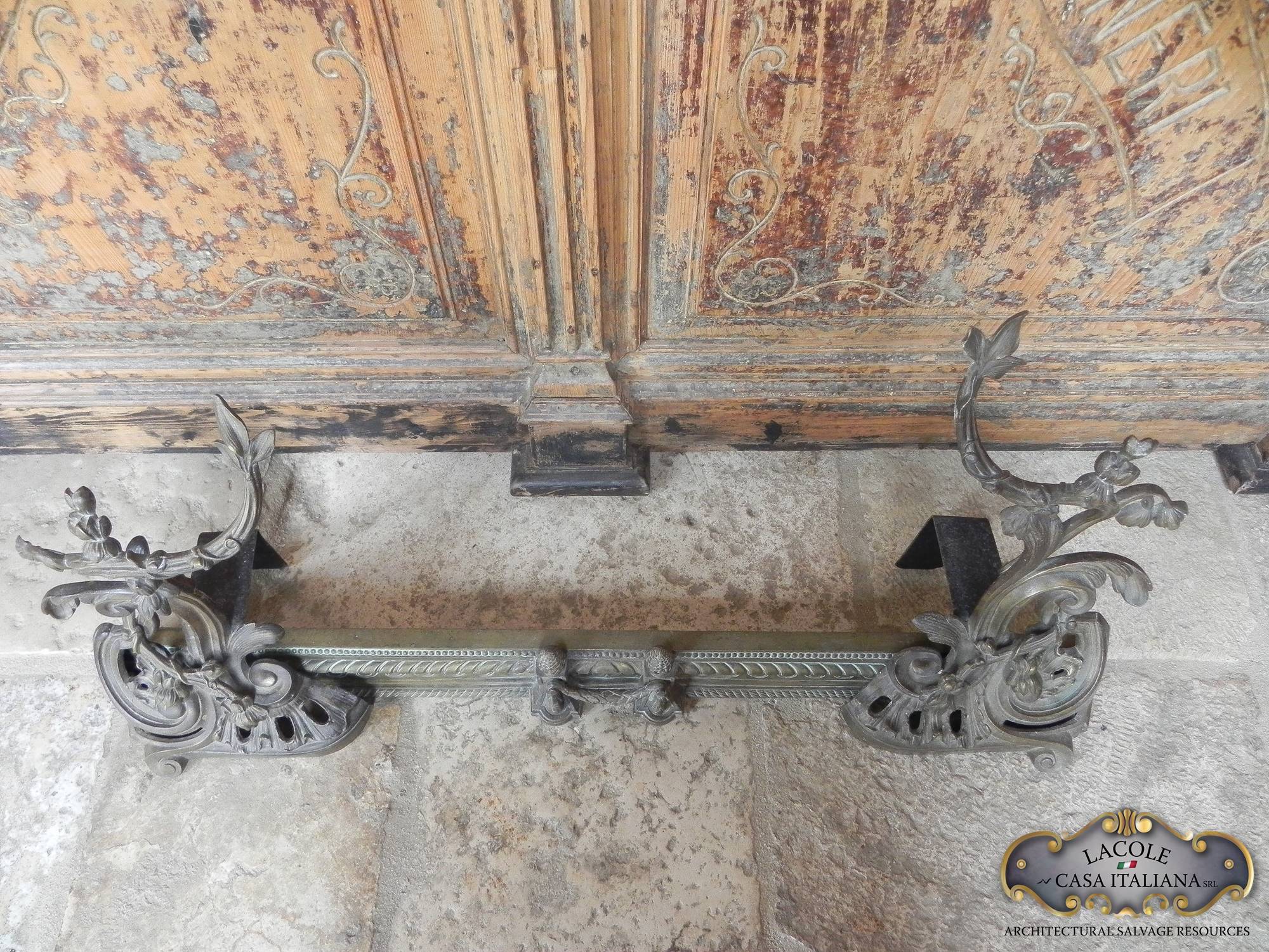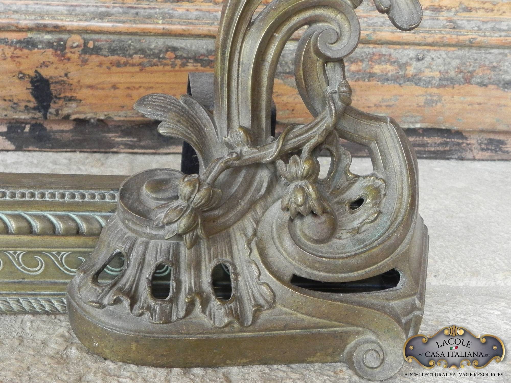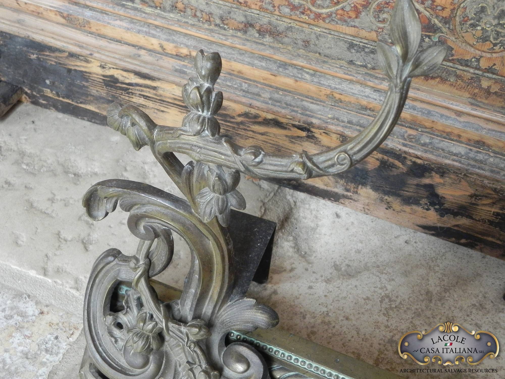 Antica barra parafuoco da camino in bronzo e ferro con decorazioni floreali nei laterali.