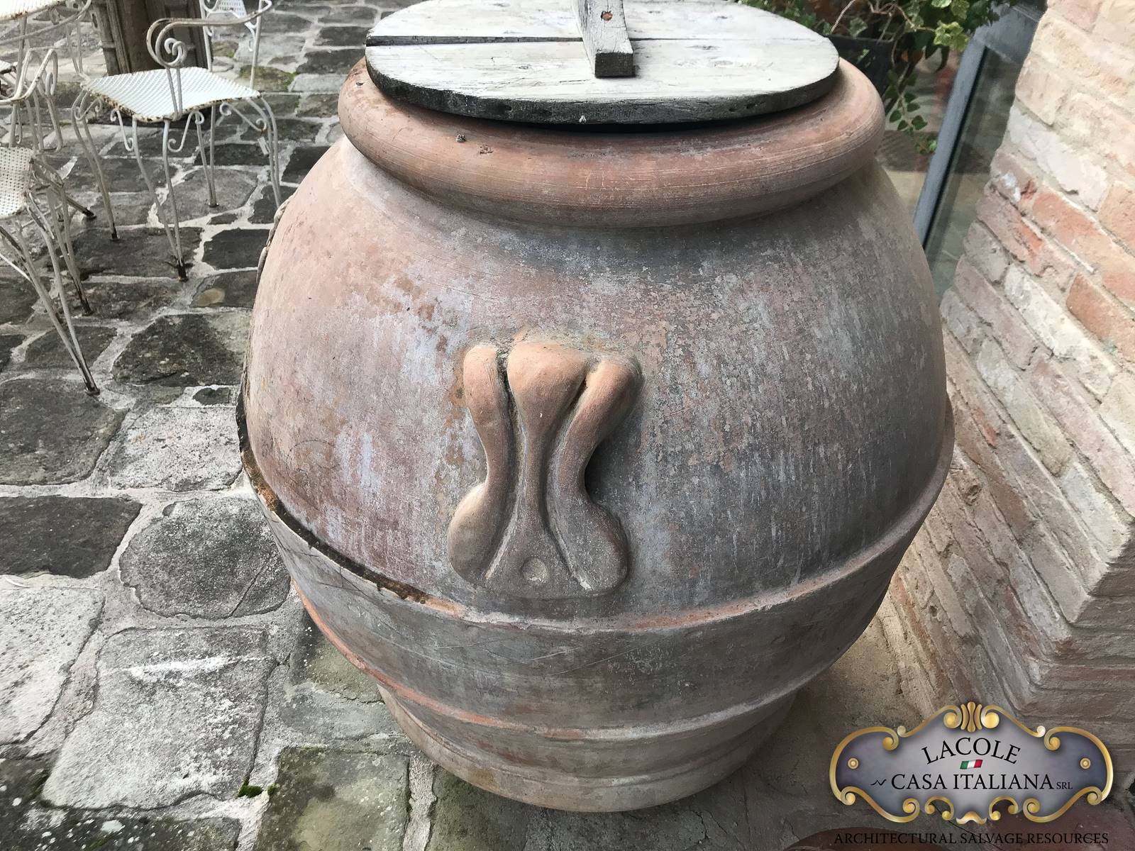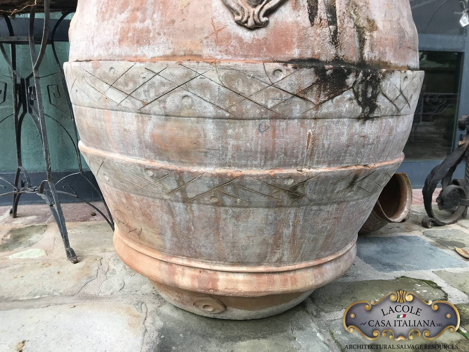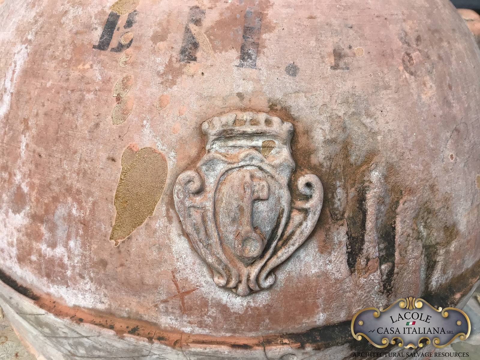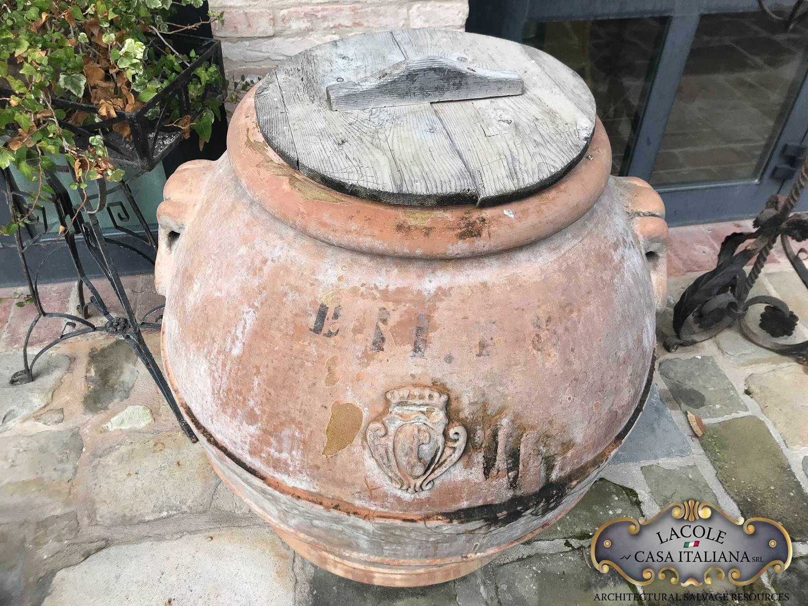 Antico orcio in terracotta con stemma in rilievo e fascioni centrali decorati a motivo geometrico.
