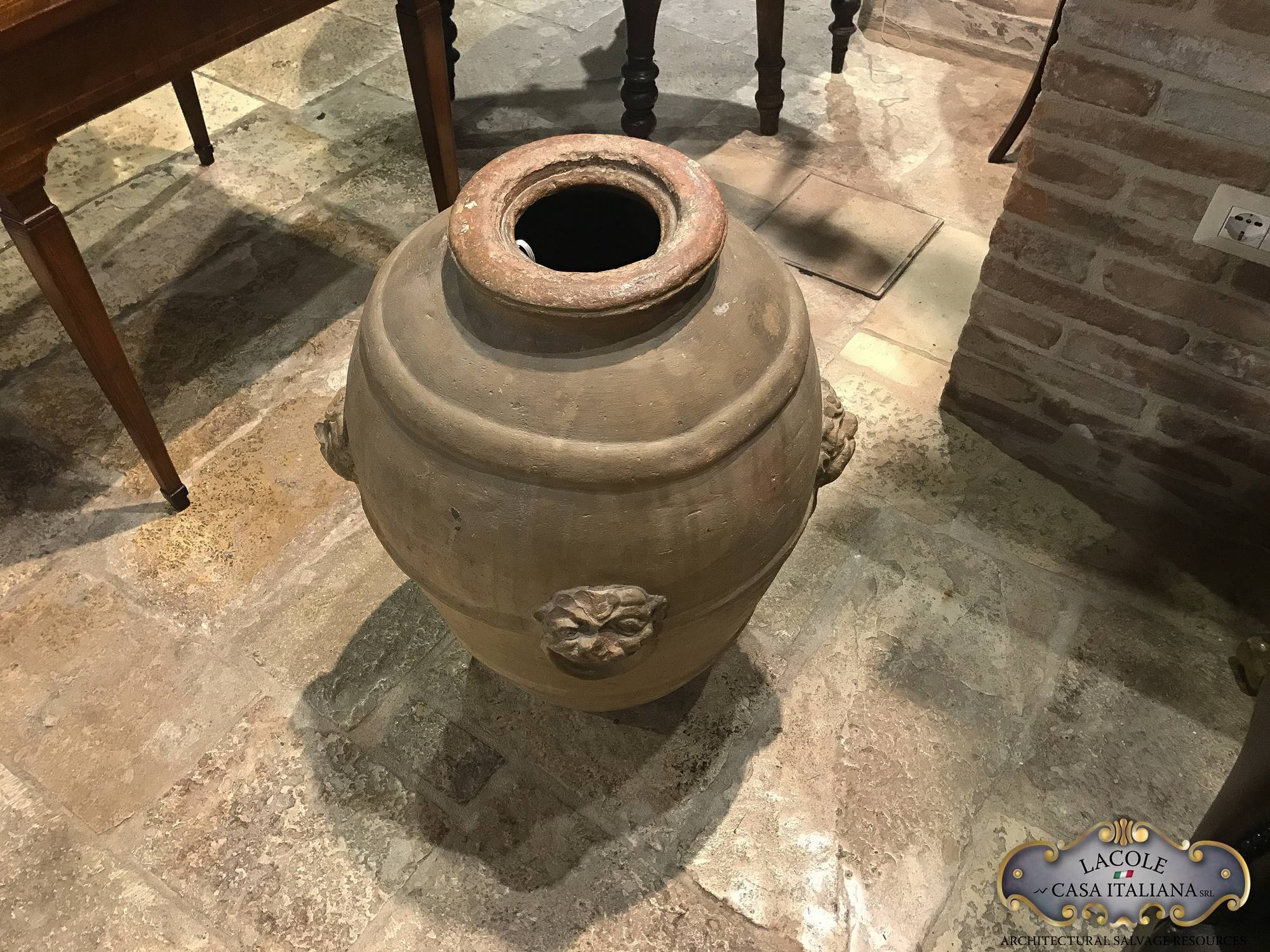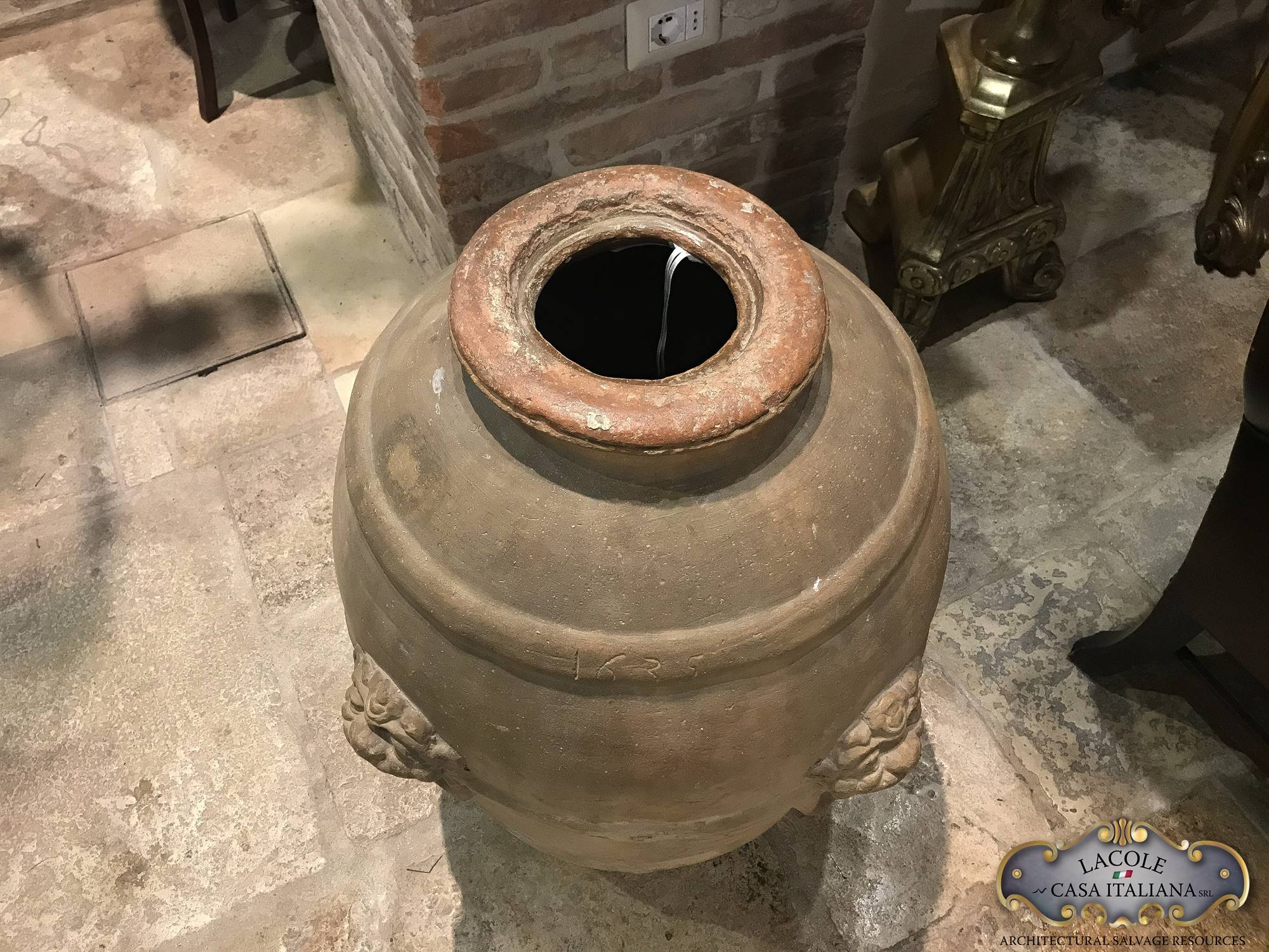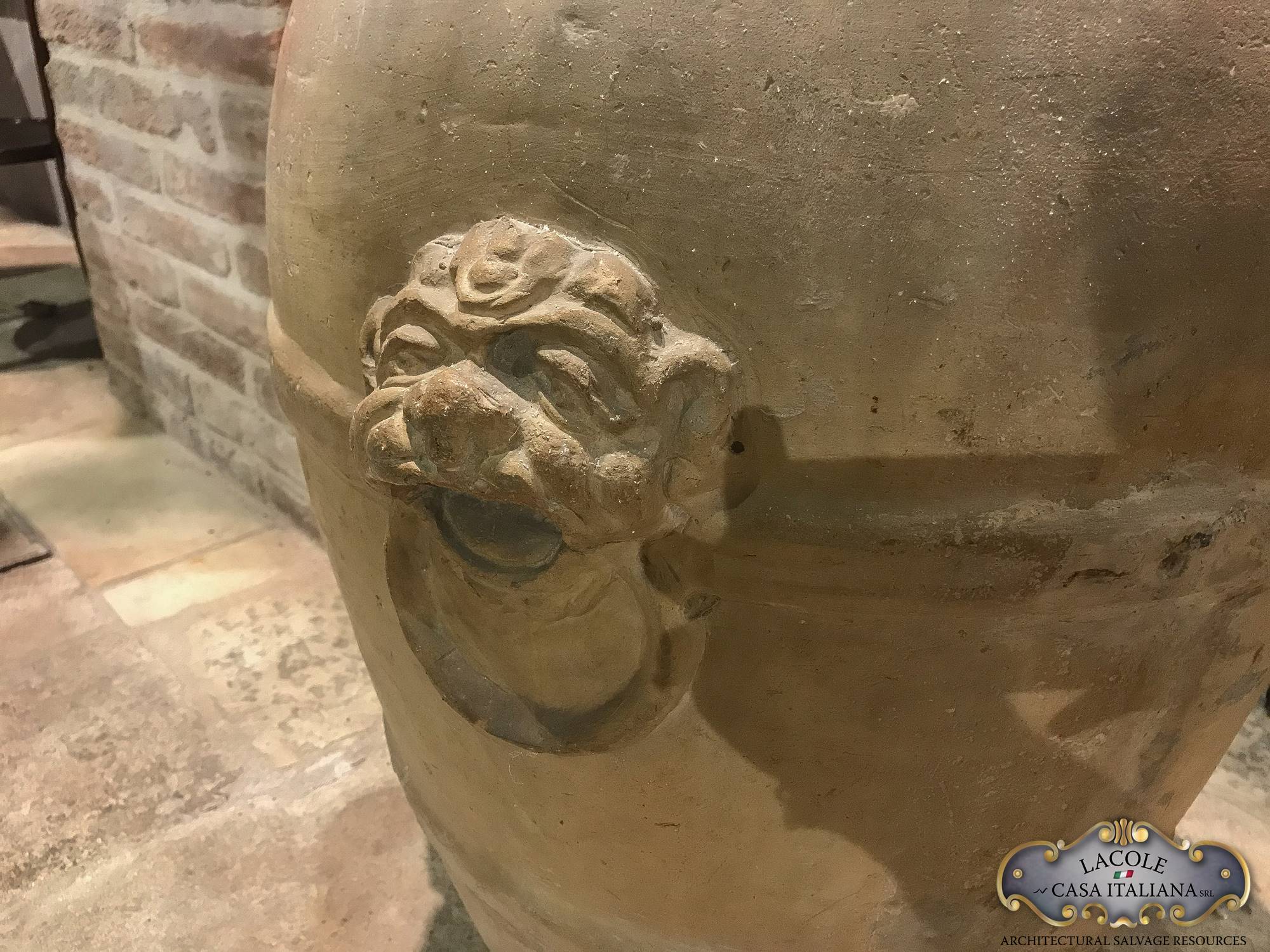 Antico orcio in terracotta, arricchito da figure grottesche. E’ inoltre incisa la data 1635. Con la dicitura ‘orcio’ si intende un vaso panciuto in terracotta, lavorato completamente a mano. Anticamente venivano utilizzati per la conservazione di liquidi, quali vino e olio. Per la loro indiscussa bellezza, gli orci sono diventati oggetti di pregio per arredare non solo gli spazi esterni, quali giardini e portici, ma anche quelli interni, donando un tocco di originalità agli ambienti dove sono collocati.