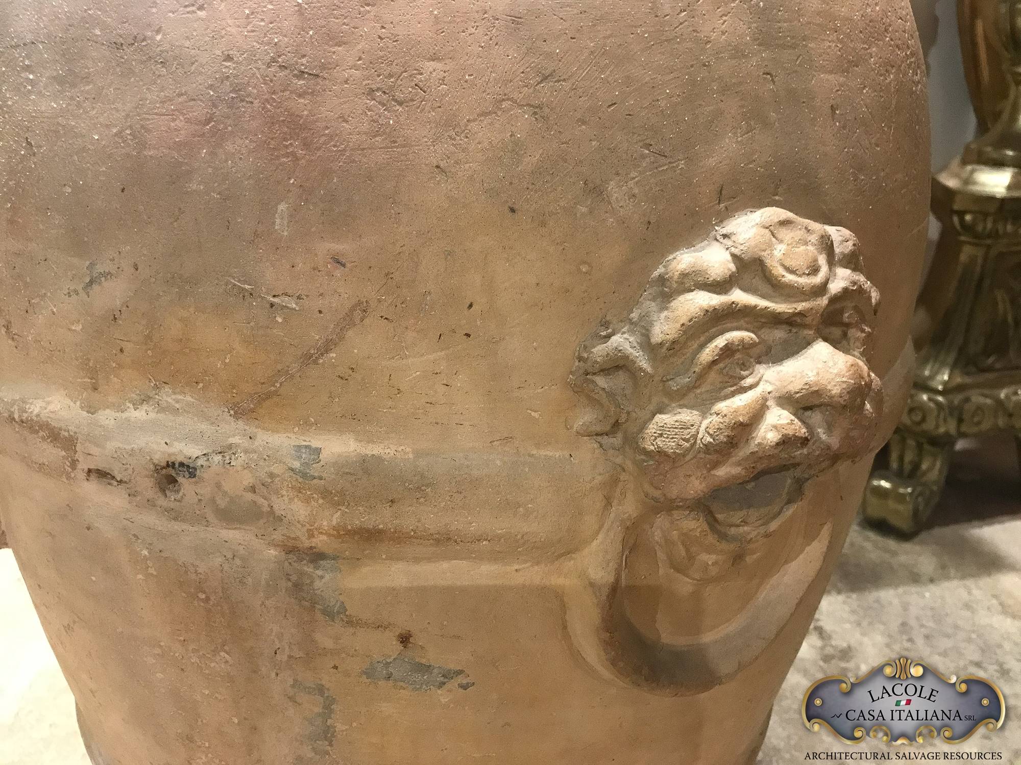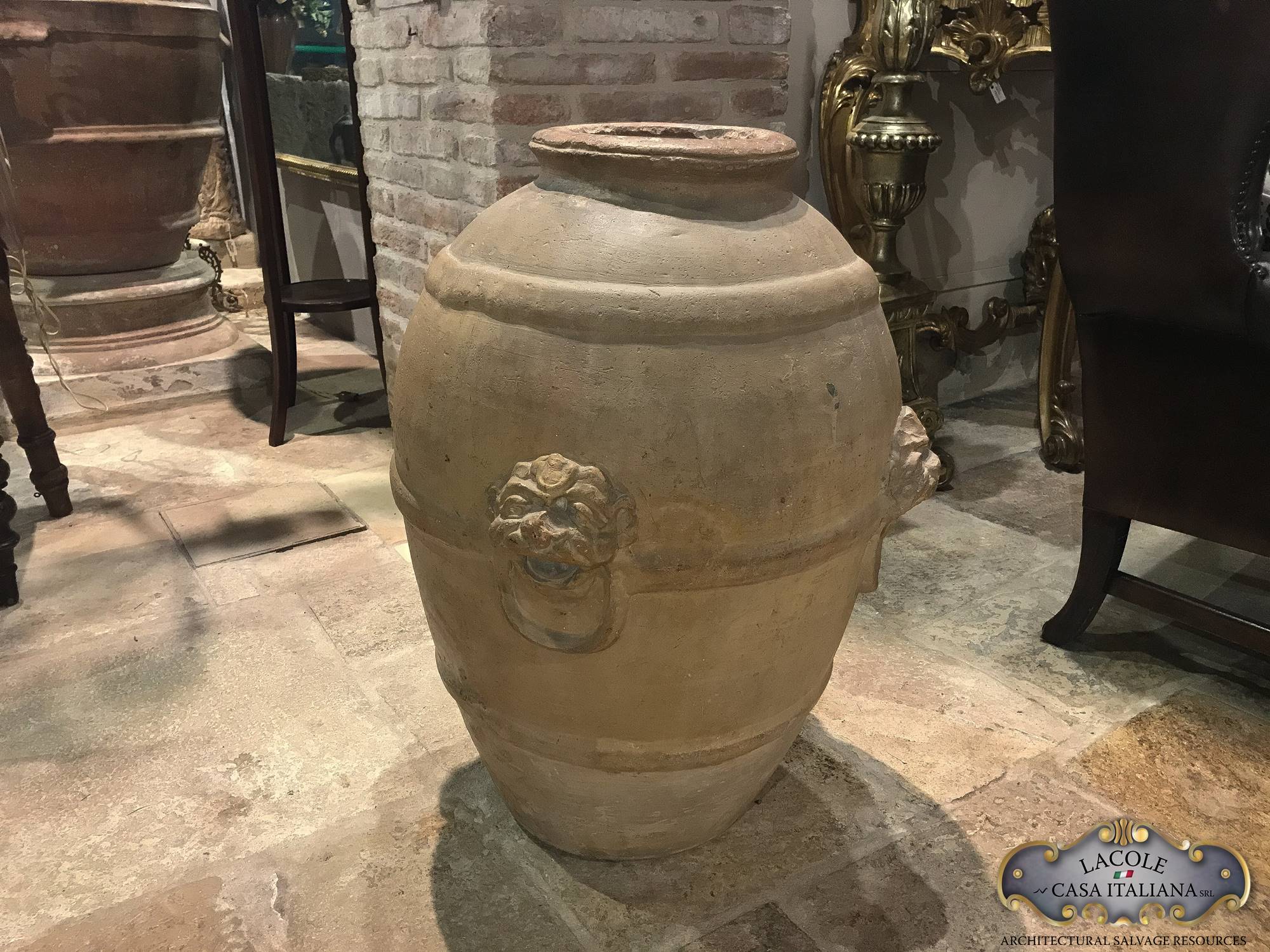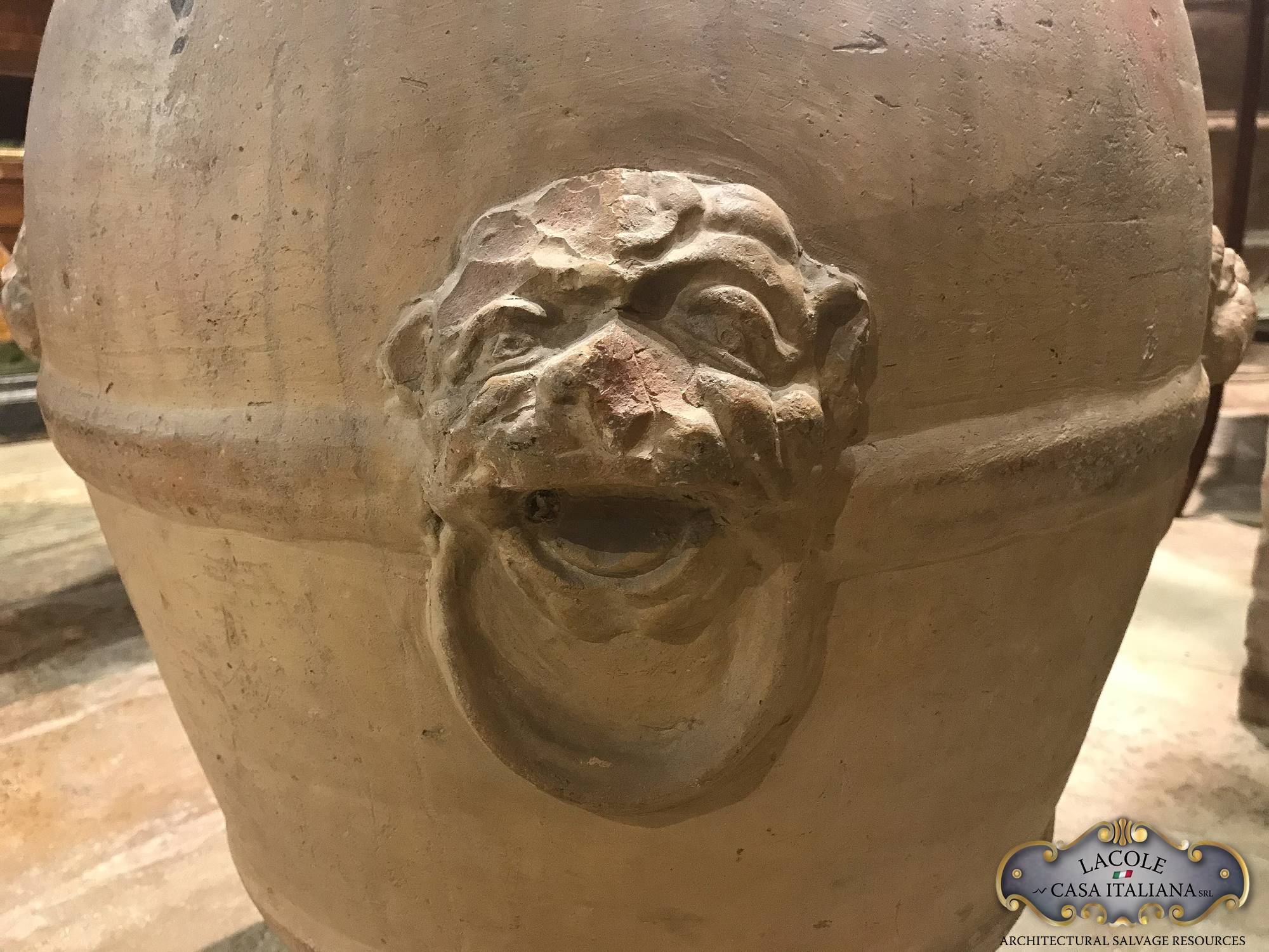 Antico orcio in terracotta, arricchito da figure grottesche. E’ inoltre incisa la data 1635. Con la dicitura ‘orcio’ si intende un vaso panciuto in terracotta, lavorato completamente a mano. Anticamente venivano utilizzati per la conservazione di liquidi, quali vino e olio. Per la loro indiscussa bellezza, gli orci sono diventati oggetti di pregio per arredare non solo gli spazi esterni, quali giardini e portici, ma anche quelli interni, donando un tocco di originalità agli ambienti dove sono collocati.