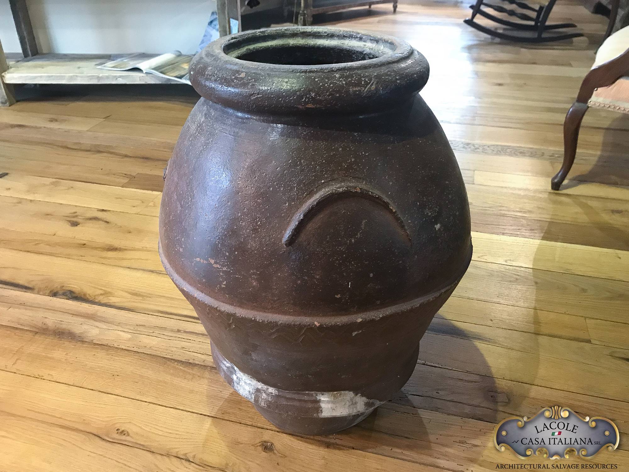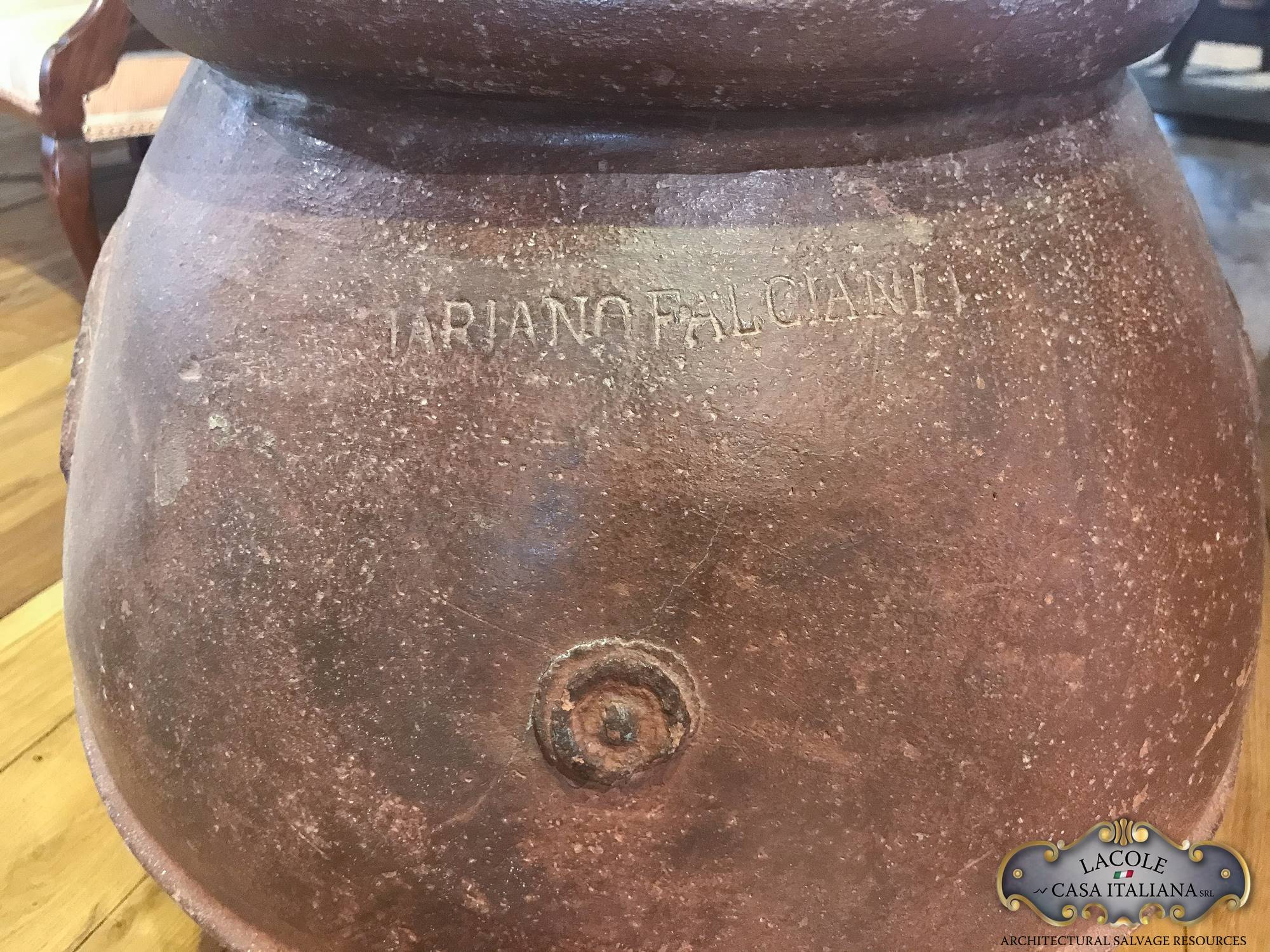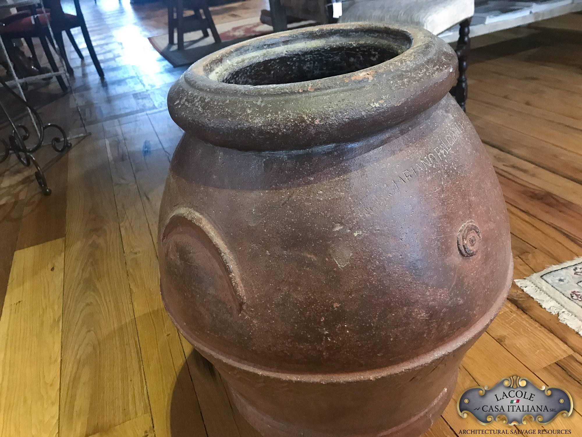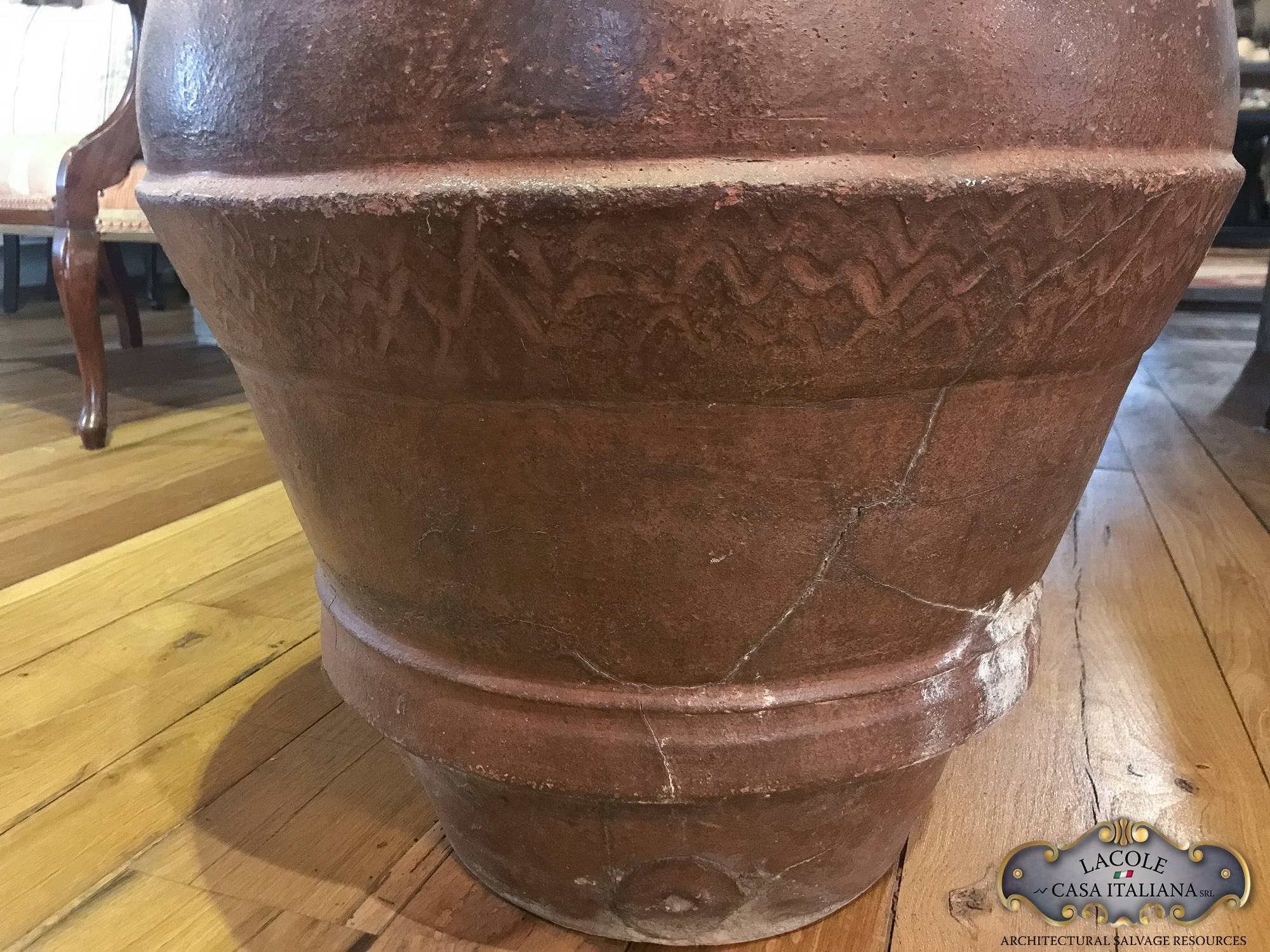 Orcio antico in terracotta, proveniente dalla vecchia fornace Falciani Mariano – Impruneta; greca nella parte centrale, smaltato al suo interno. L’orcio antico risale alla seconda metà del 1800.