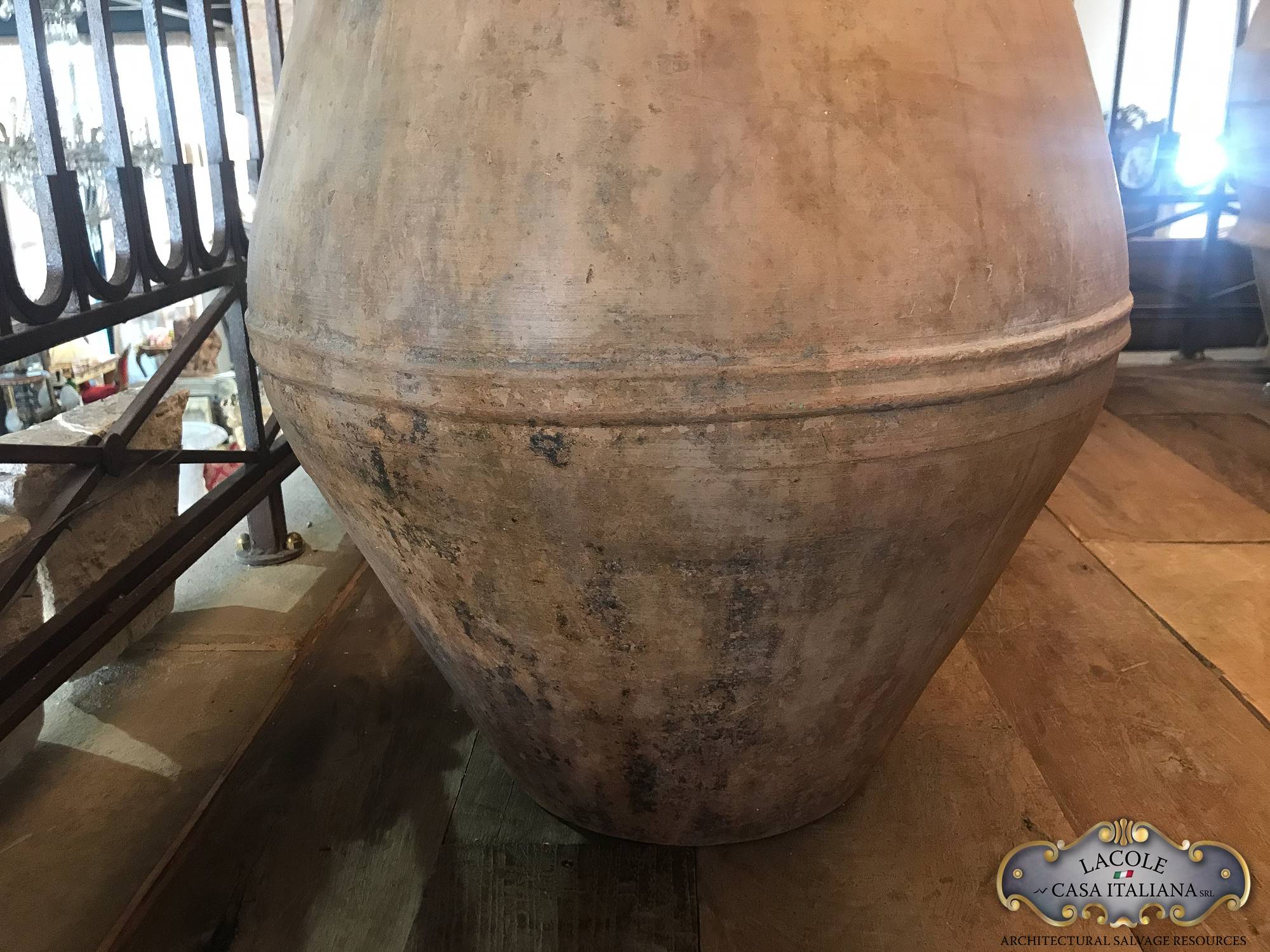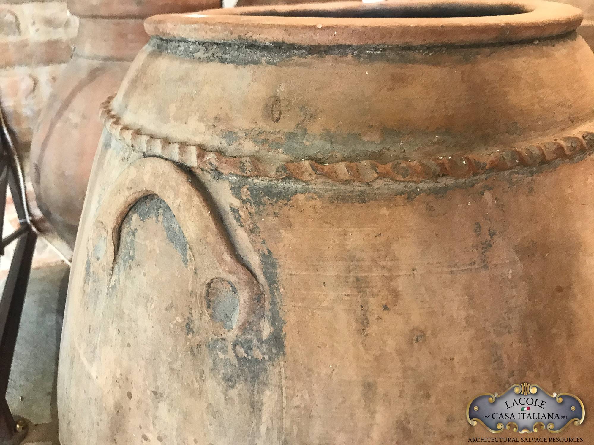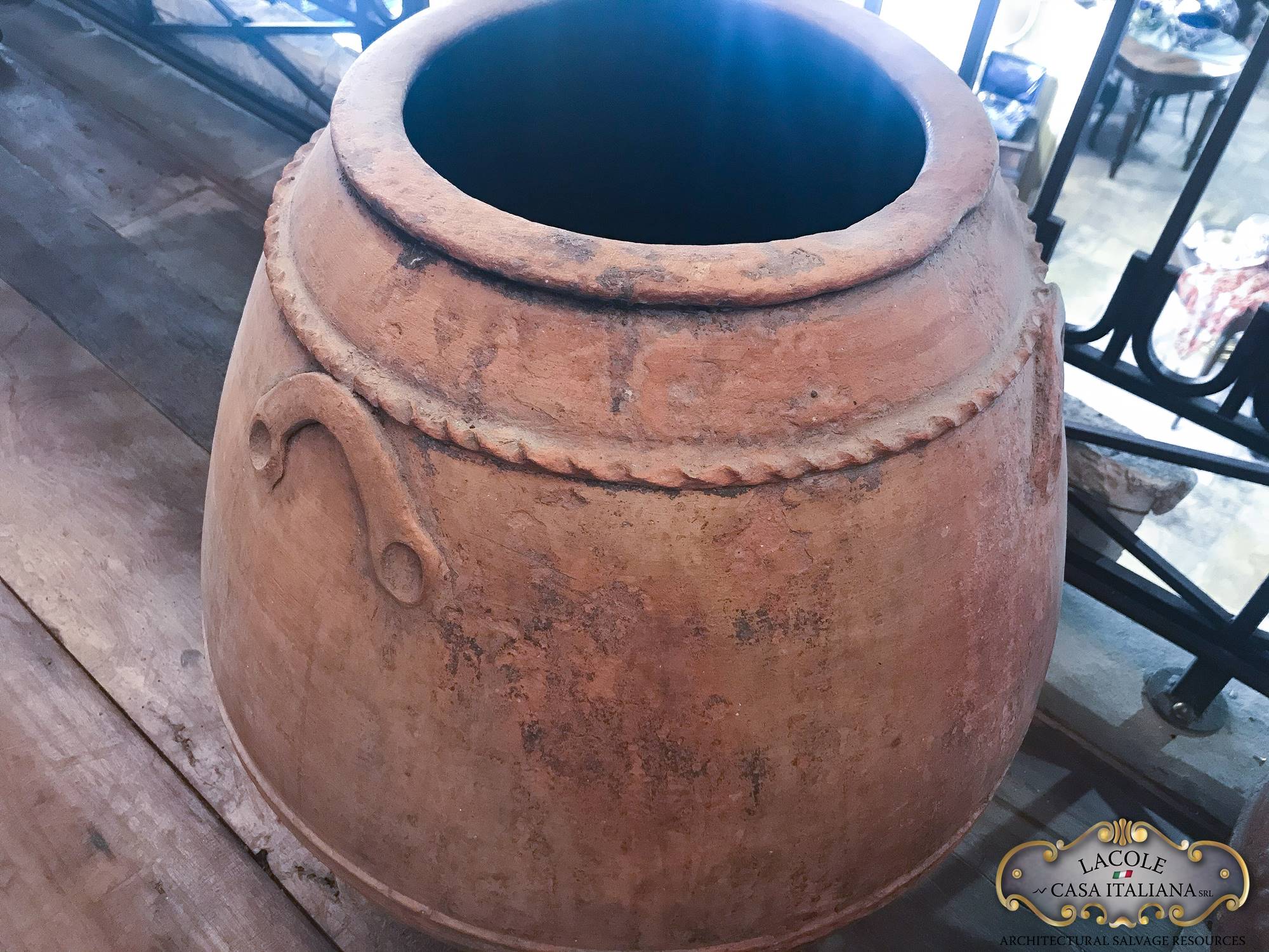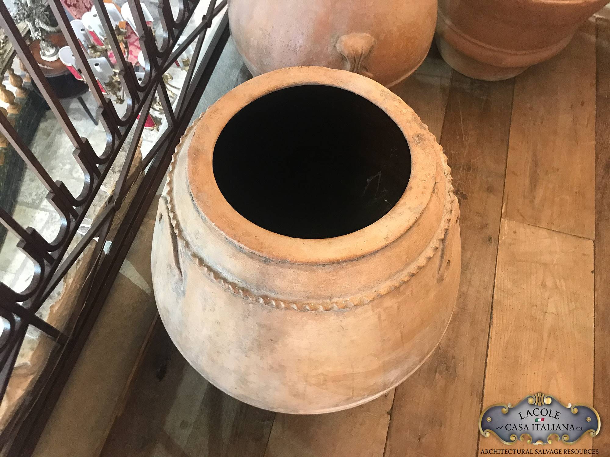 Orcio antico realizzato in terracotta, dalla forma ‘panciuta’, con una piccola greca in rilievo nella parte alta.