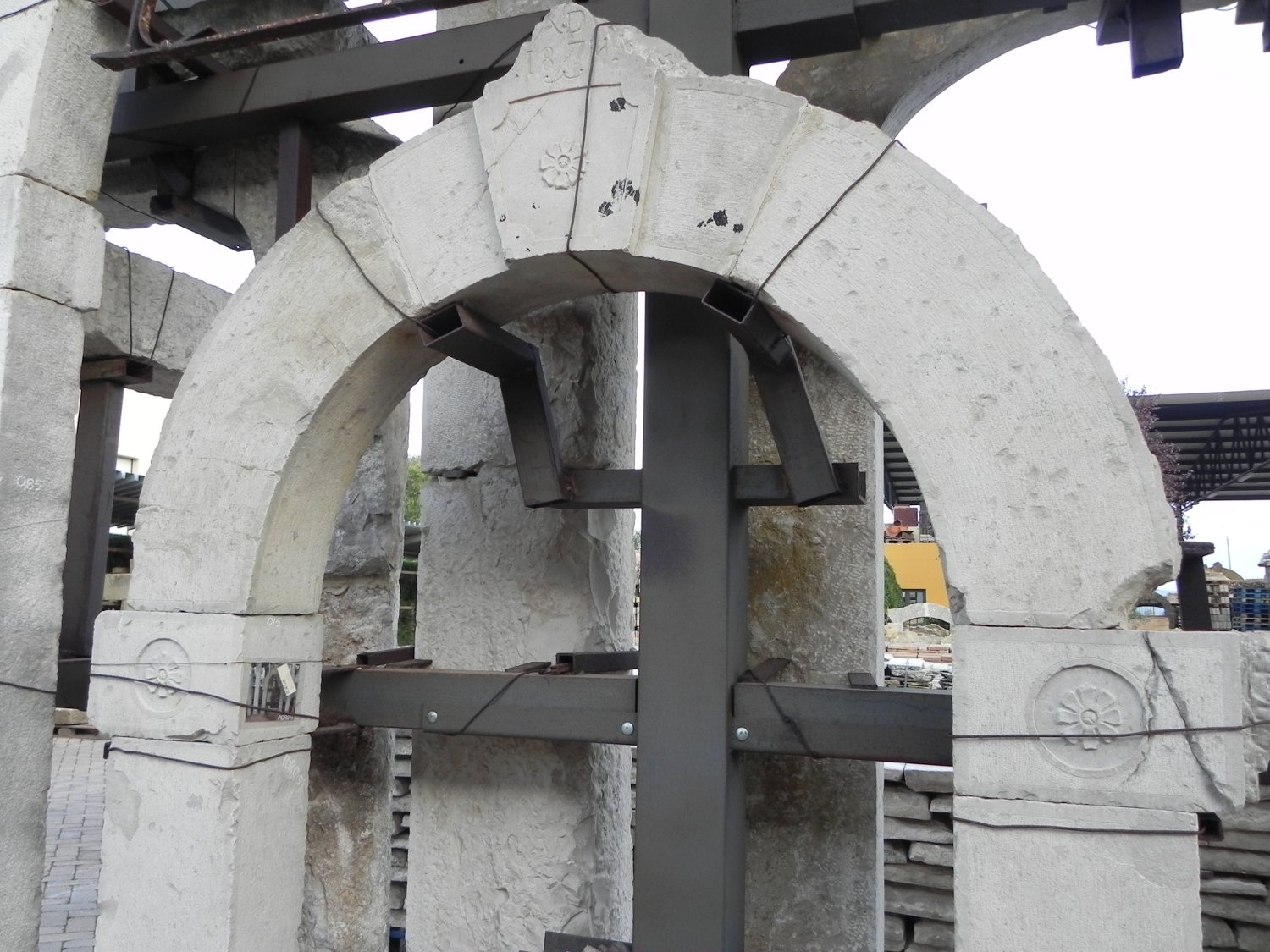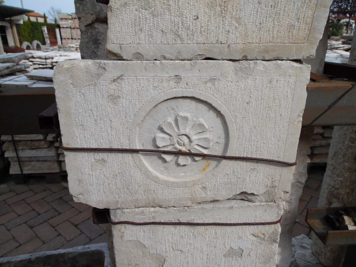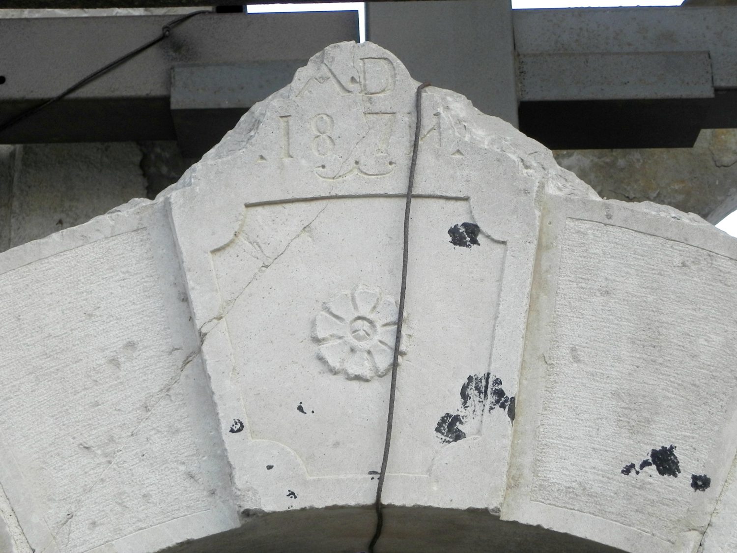 Portale antico POR015, in pietra chiata. La chiave di volta è decorata con un fiore scolpito e la data 1871.