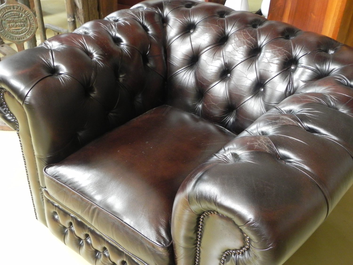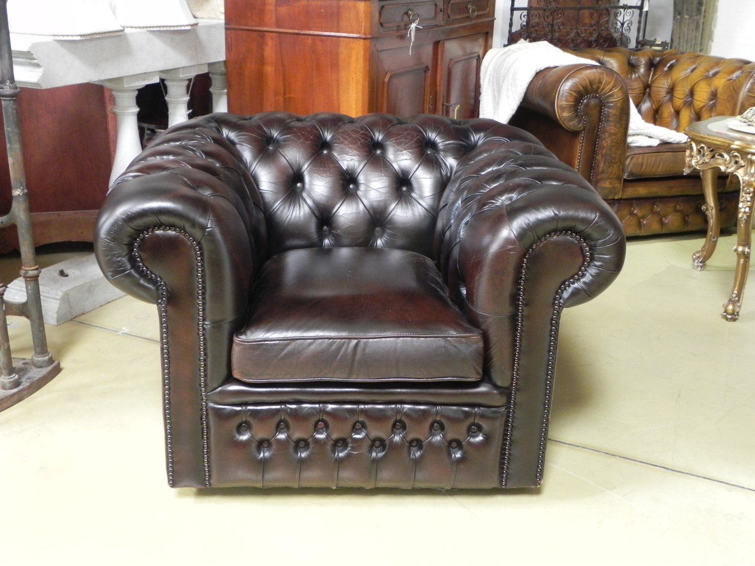 Poltrona antica originale chesterfield, risalente alla prima metà del 1900. Ottima condizione della struttura e pellame vintage originale del periodo, marrone testa di moro.