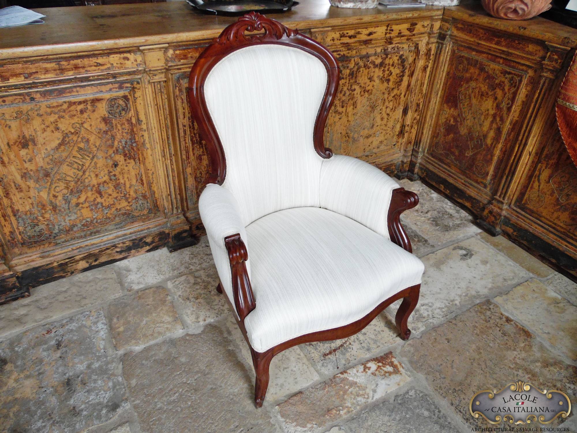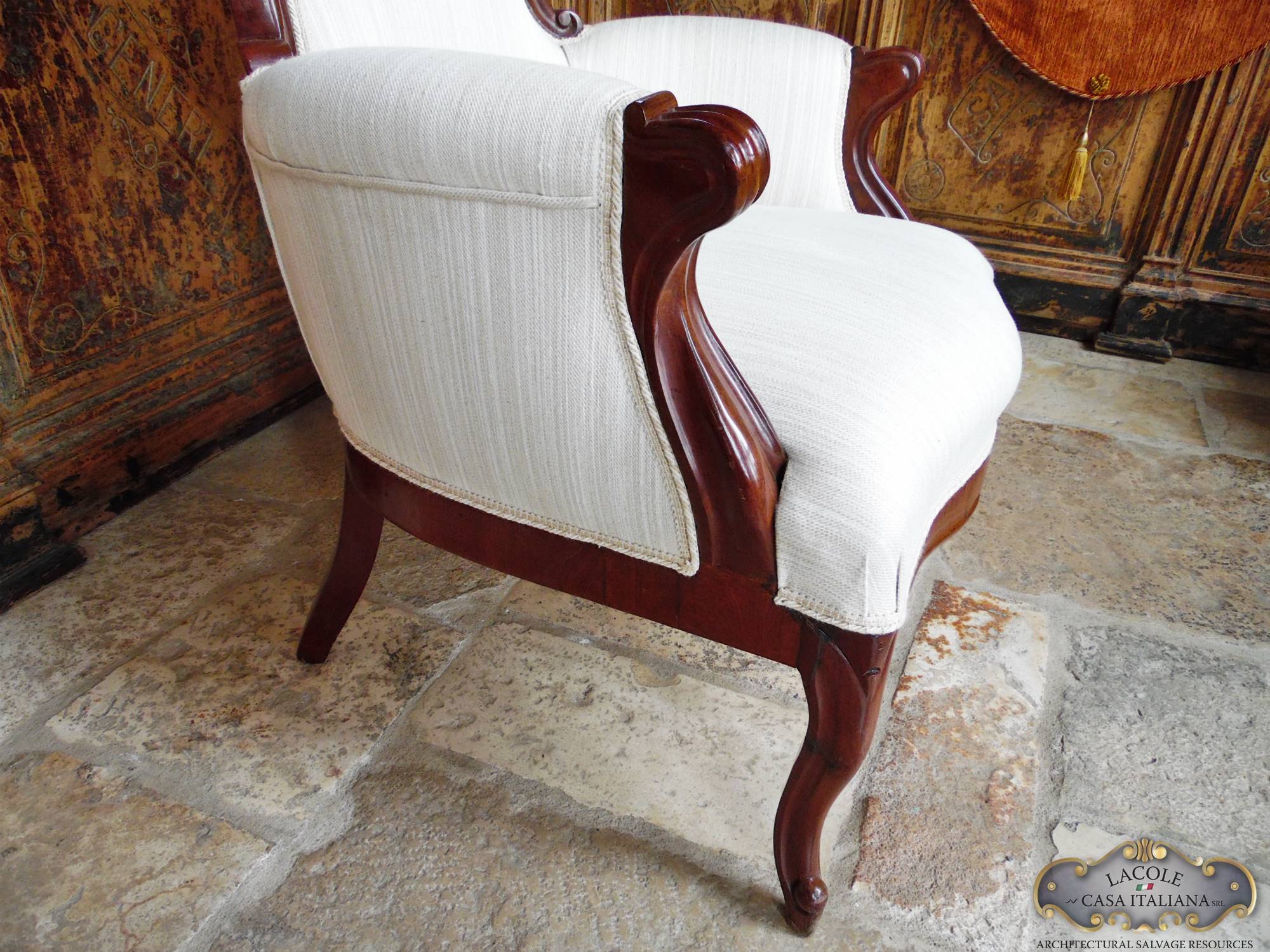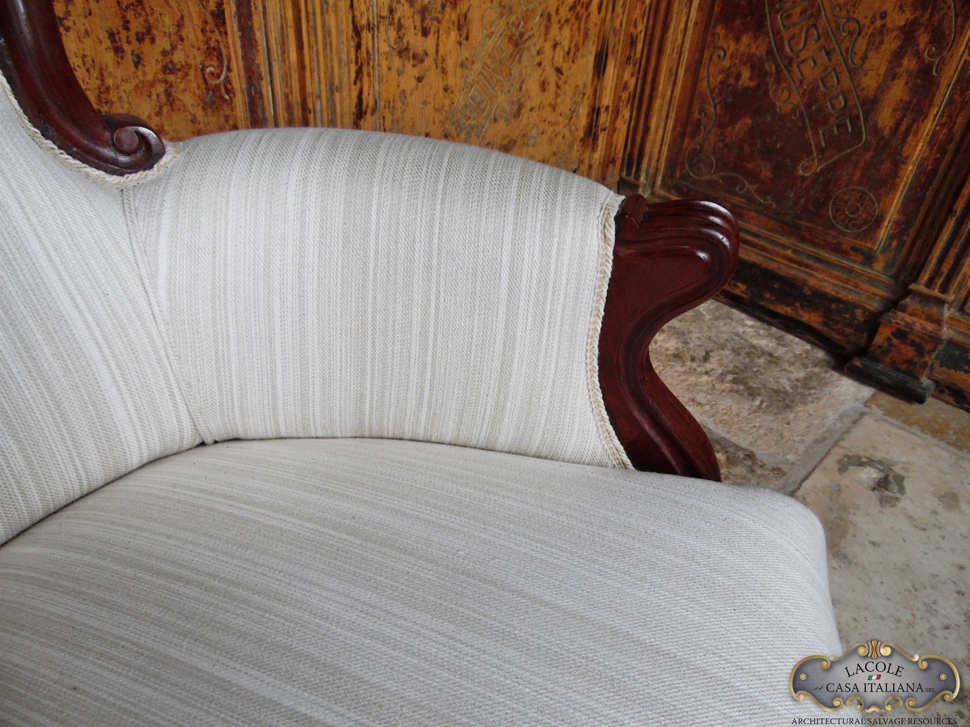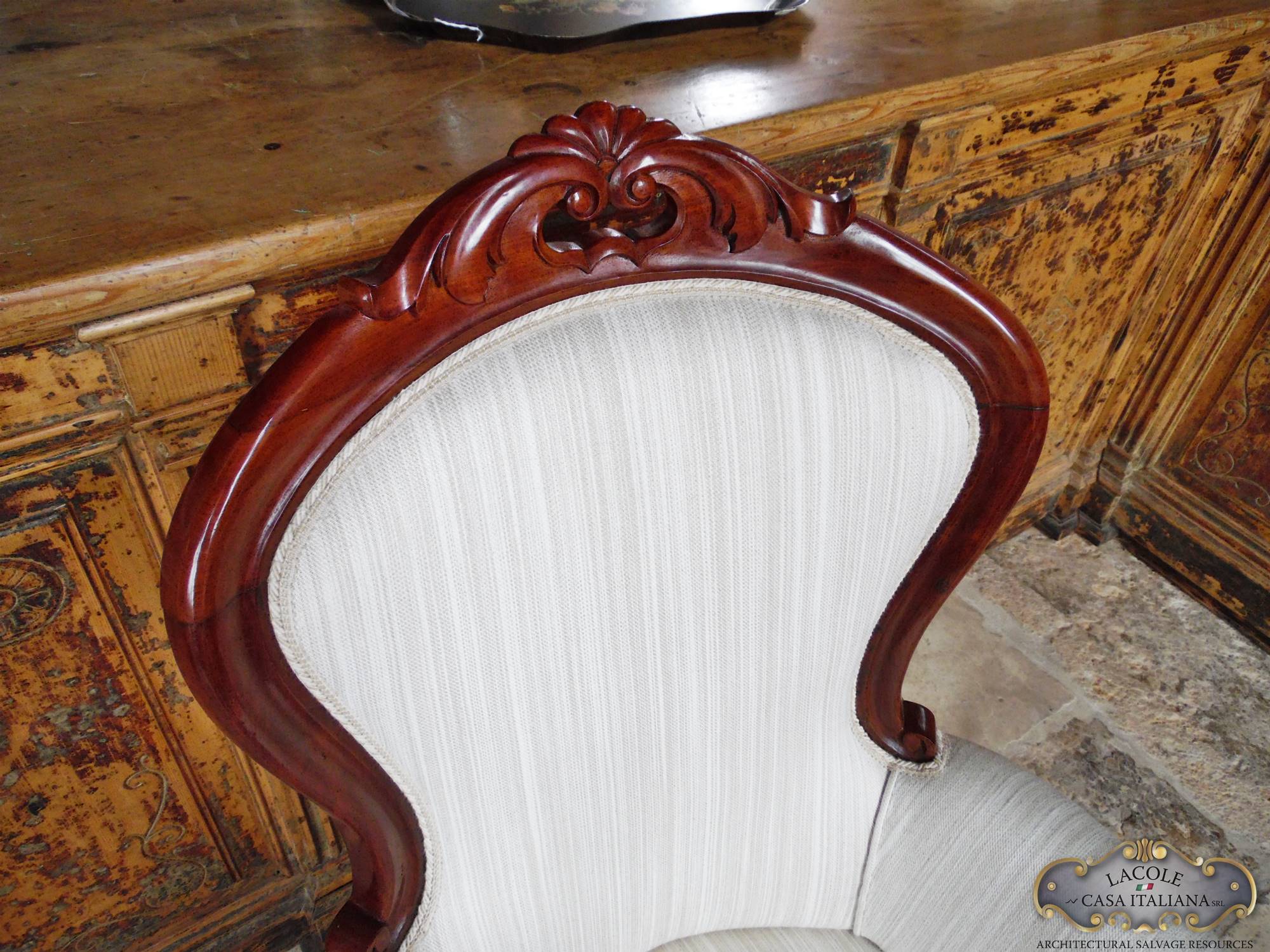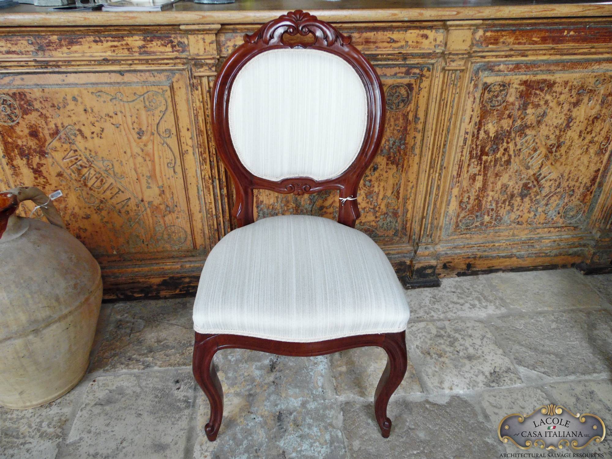 Salotto stile Luigi Filippo composto da poltrona e 4 sedie in mogano; tappezzeria di nuova manifattura in raso di contone