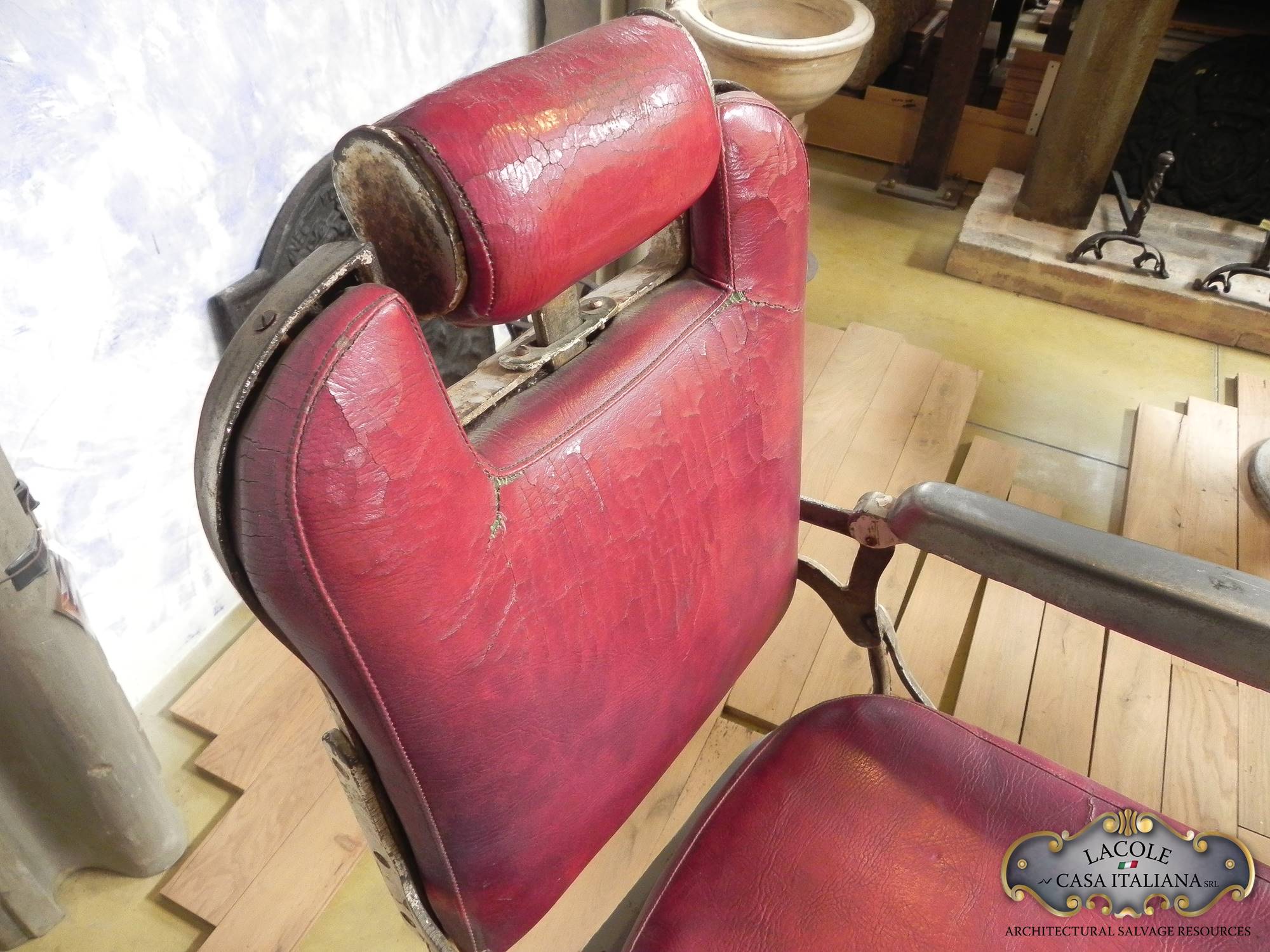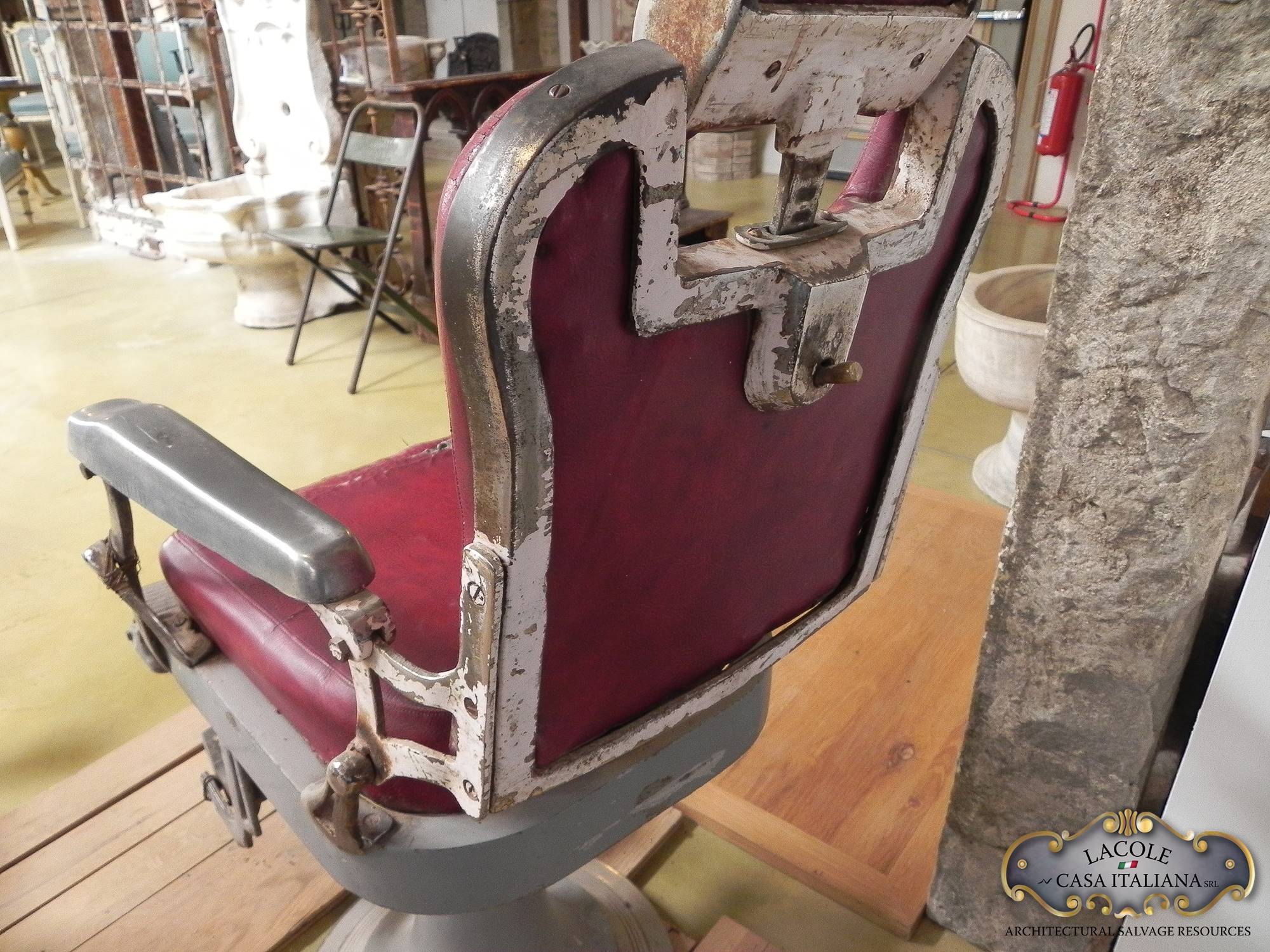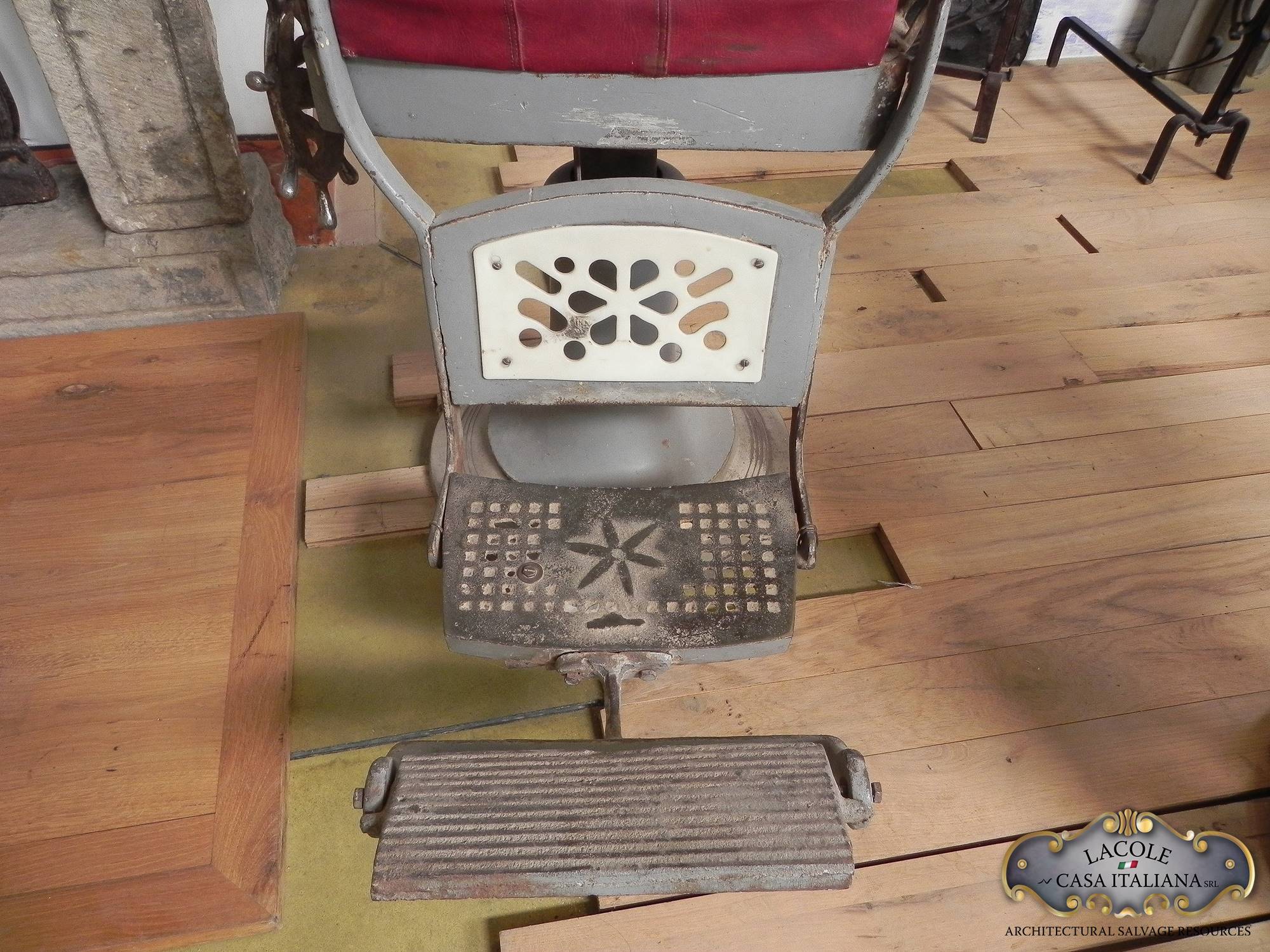 Sedia da barbiere, in metallo, seduta in pelle. Originale.