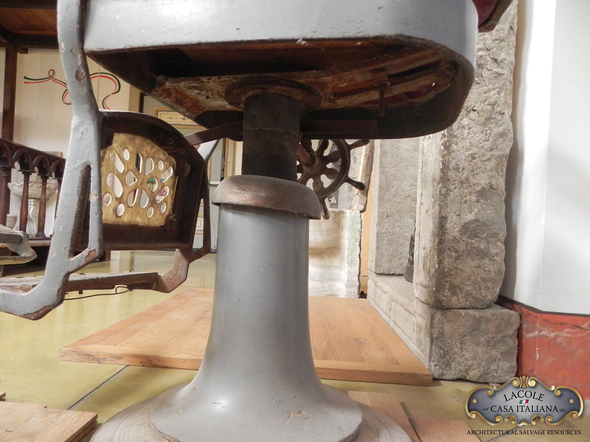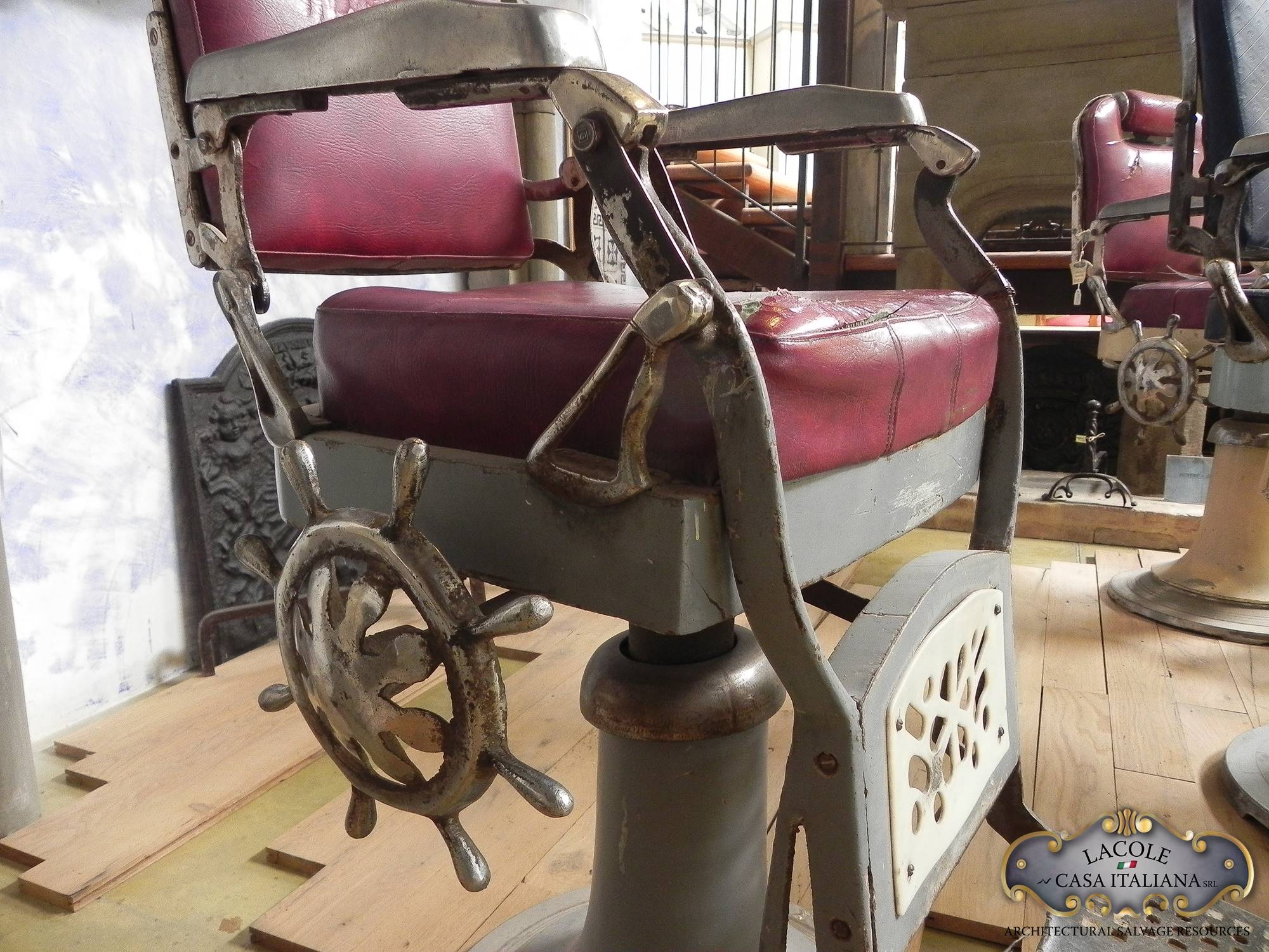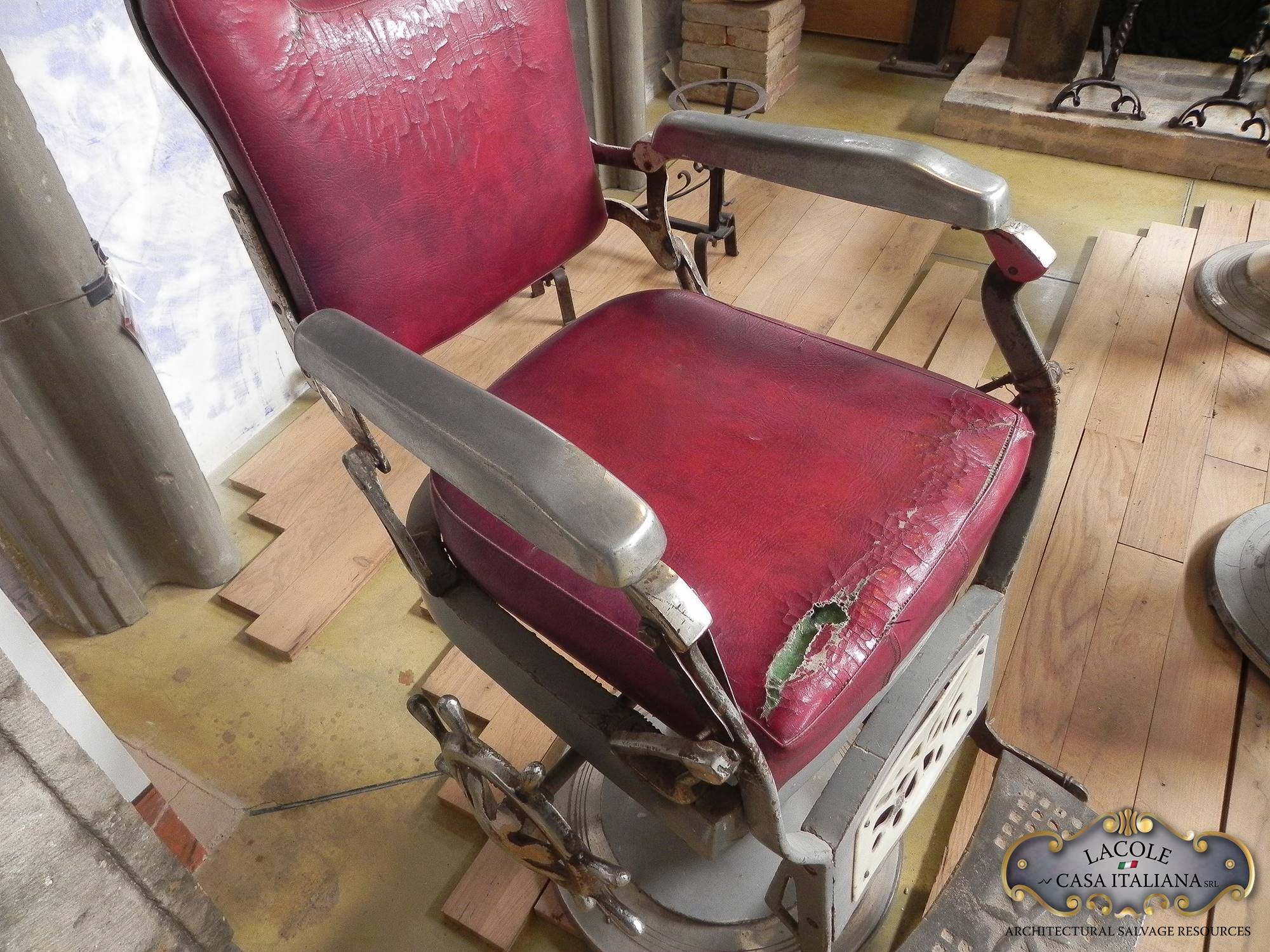 Sedia da barbiere, in metallo, seduta in pelle. Originale.