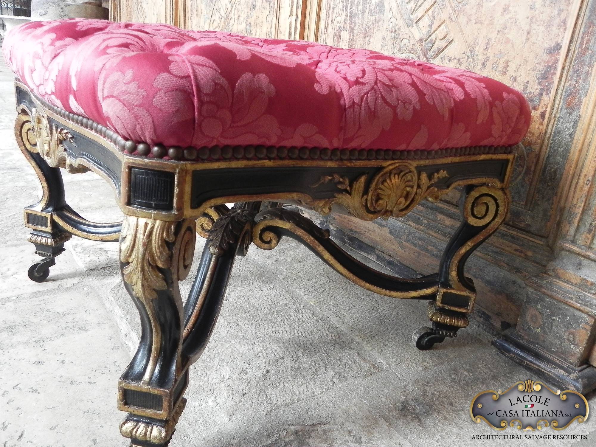 Poggiapiedi antico in legno ebanizzato, con finiture in oro. Epoca Napoleone |||.