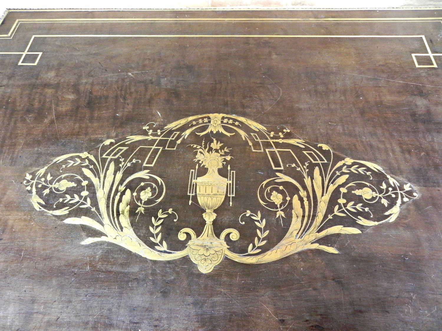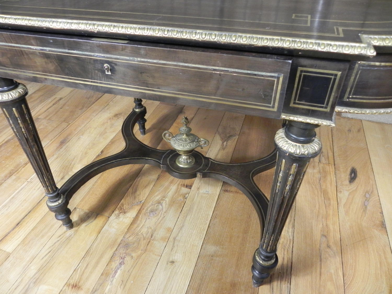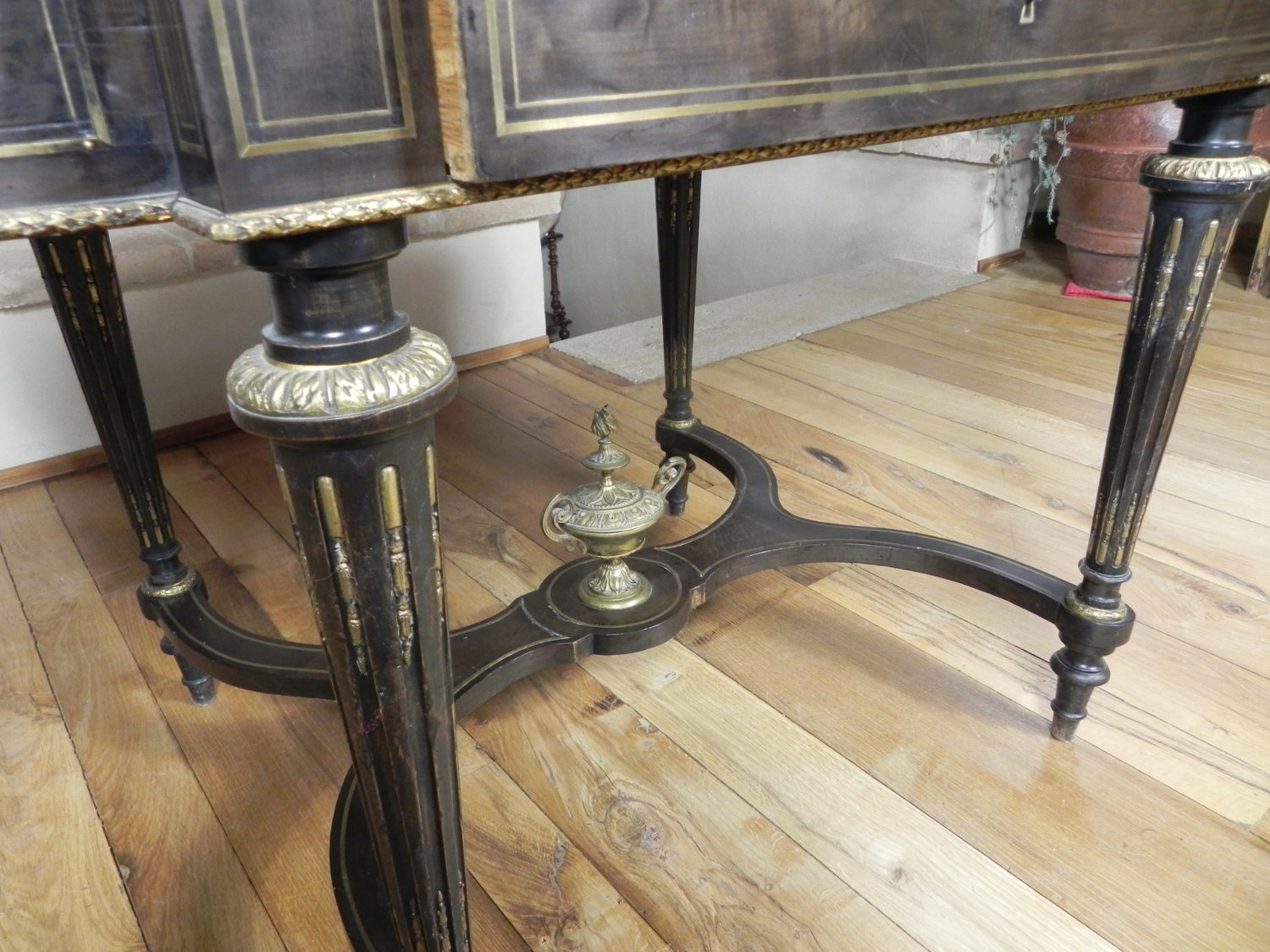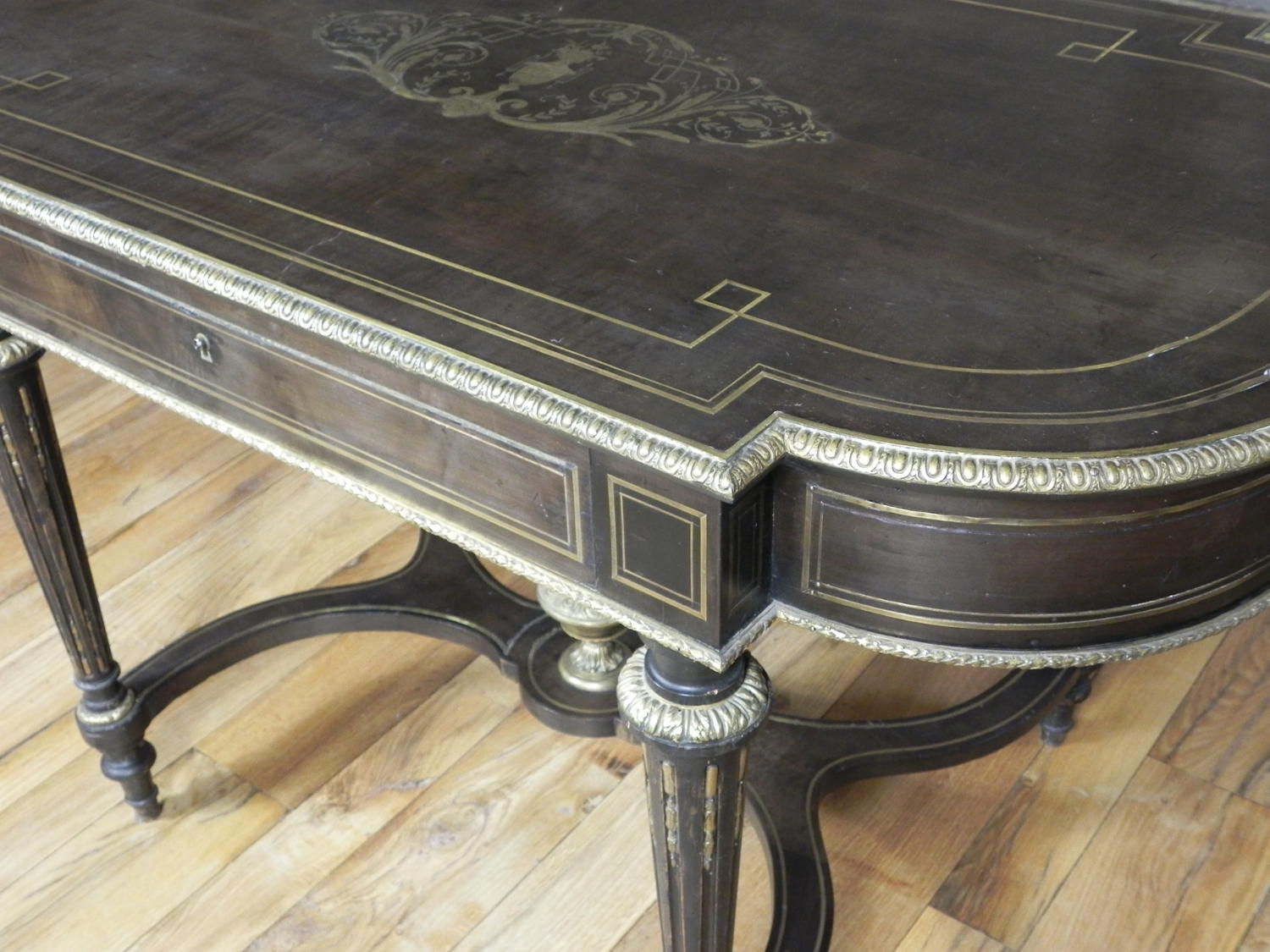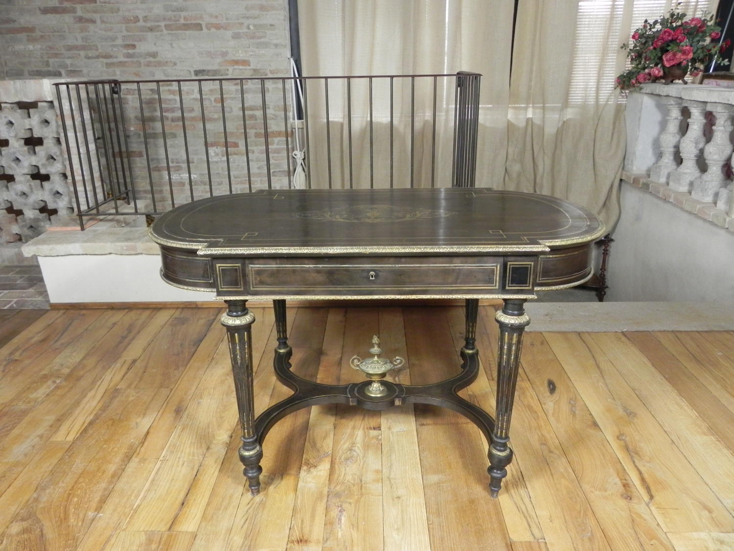 Antico tavolo ovale – consolle in stile Luigi XVI, ebanizzato in nero con preziosi intarsi sia nel piano, sia nella fascia sotto piano in metallo. Il tavolo antico è ulteriormente impreziosito da una bordatora in ottone bronzato finemente cesellato, lungo tutto il perimetro del piano. Epoca prima metà del 1800.