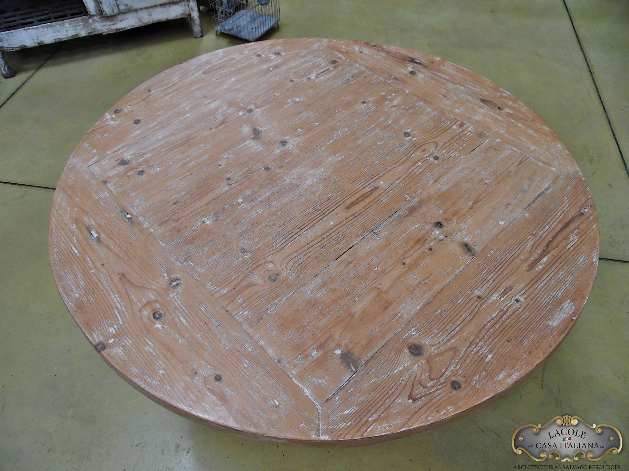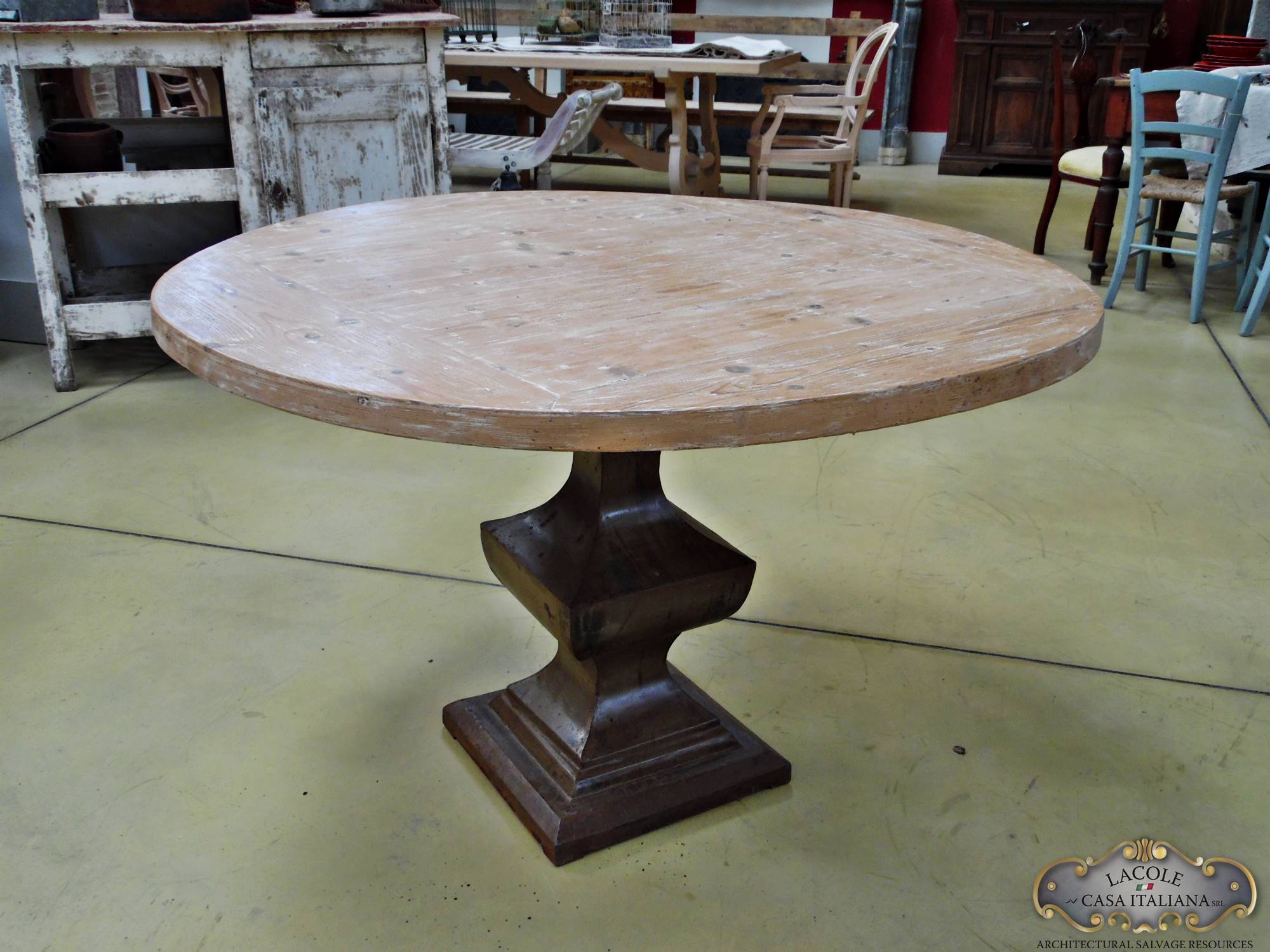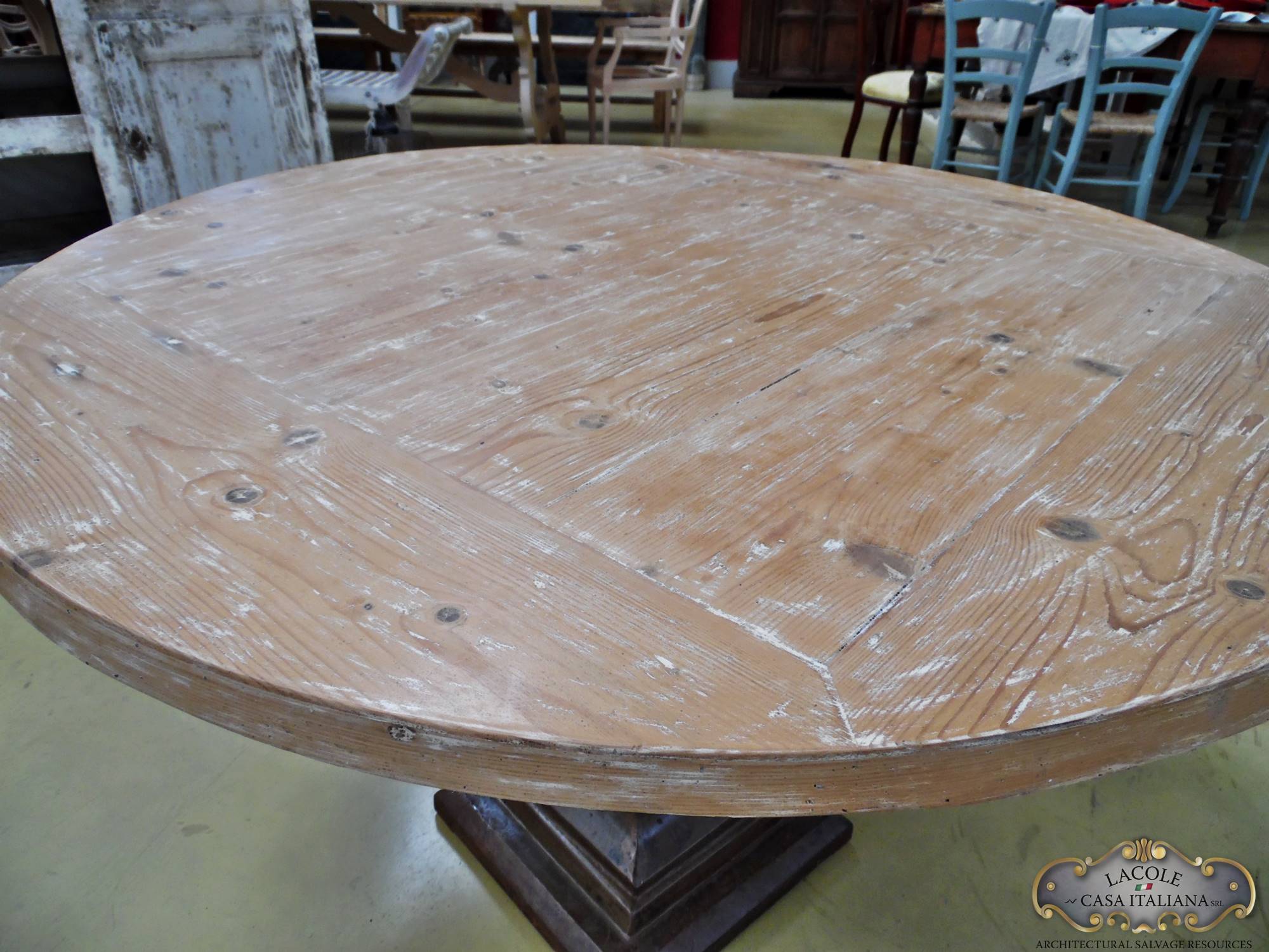 Particolare tavolo rotondo con gamba centrale in metallo brunito. Il piano è realizzato con anticoo tavolame in rovere decapato.