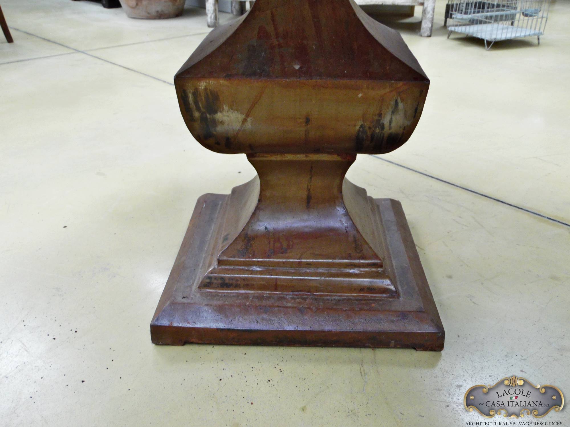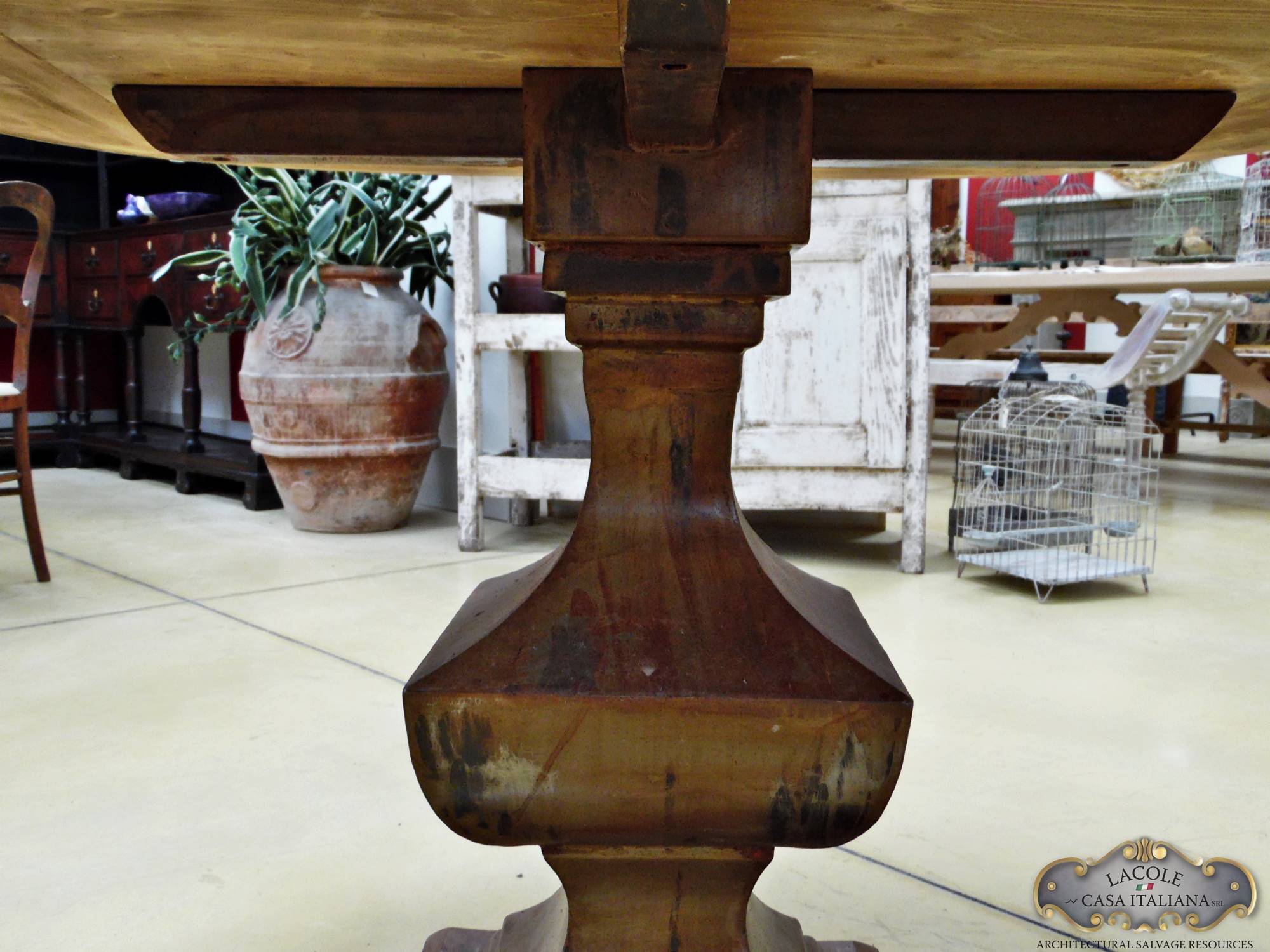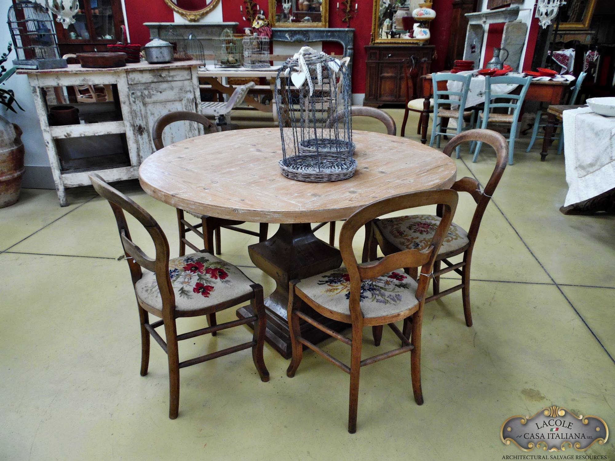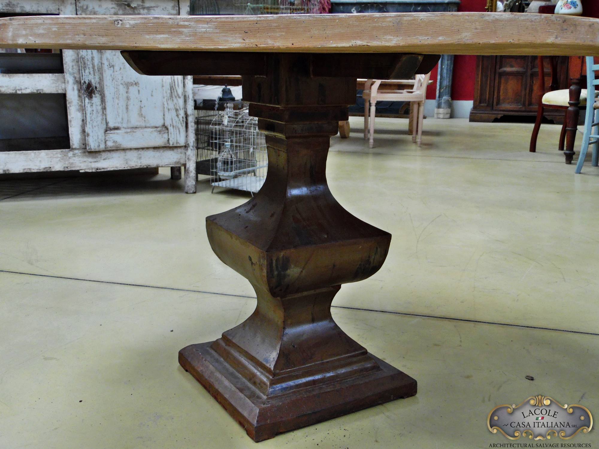 Particolare tavolo rotondo con gamba centrale in metallo brunito. Il piano è realizzato con anticoo tavolame in rovere decapato.