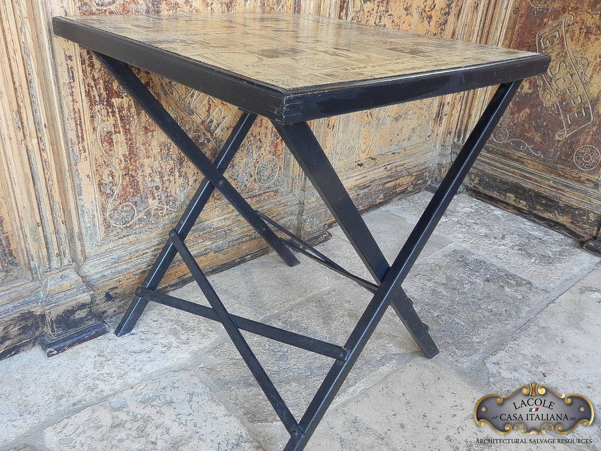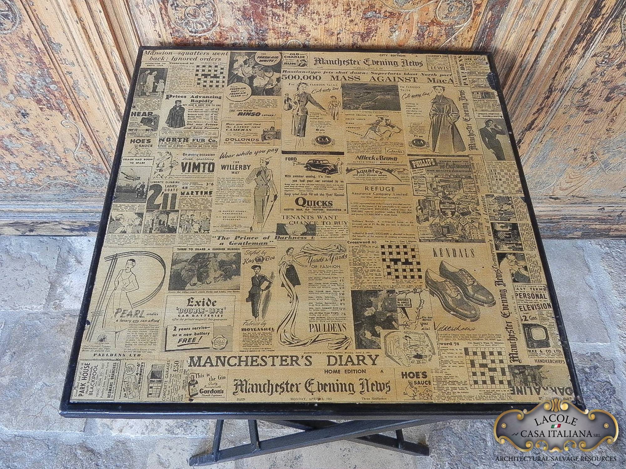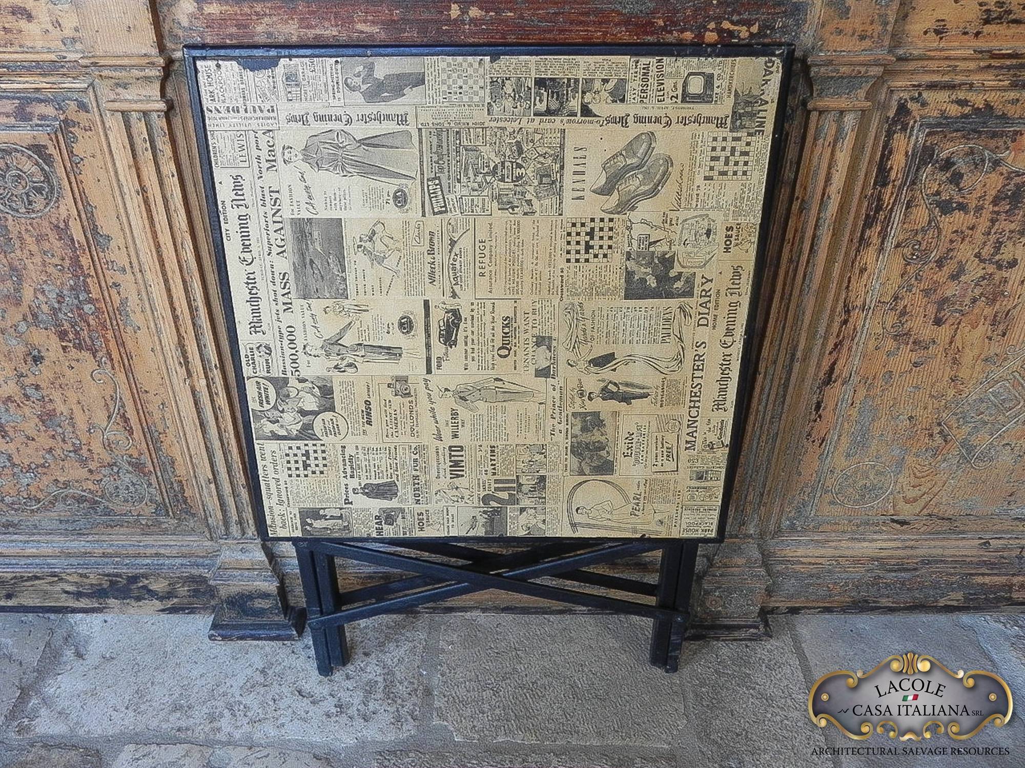 Antico tavolino da bar, pieghevole, realizzato in legno ebanizzato nero. Il piano è realizzato in legno e decoupage con articoli di giornale vecchi. Epoca primi 1900.