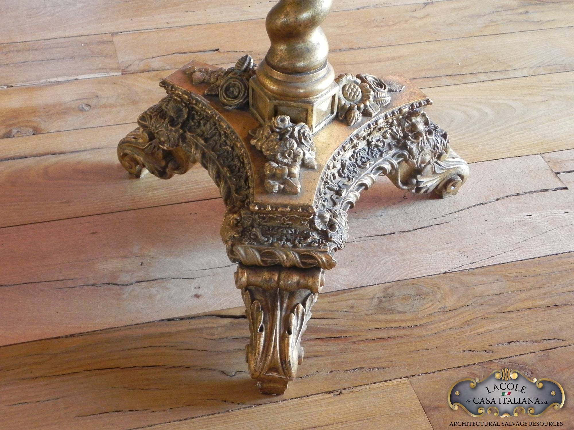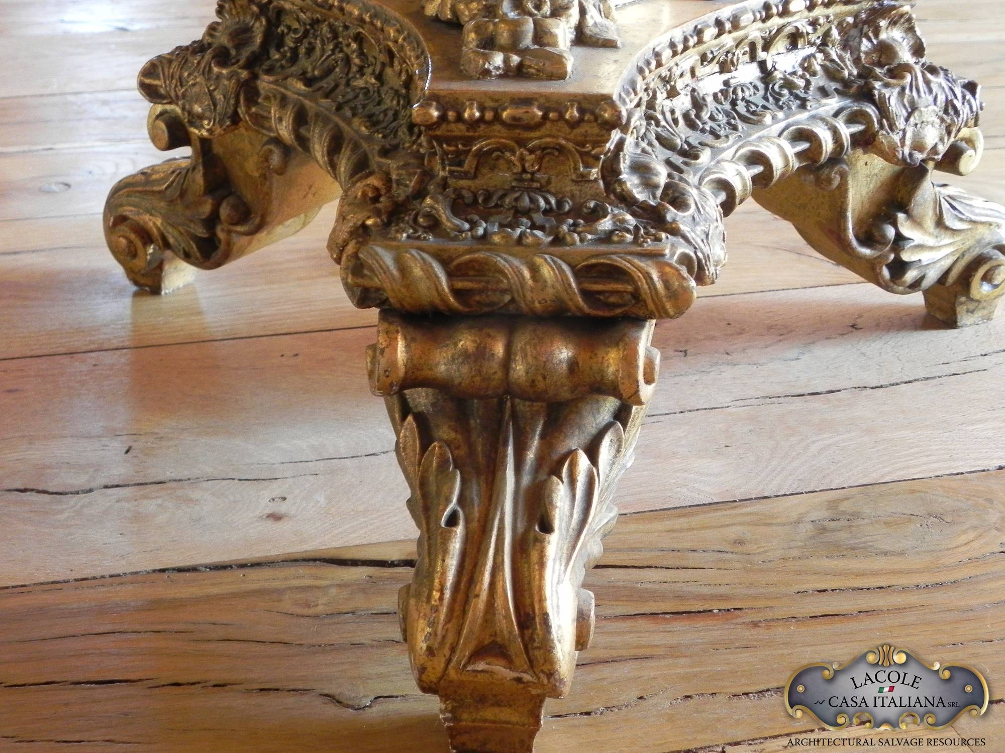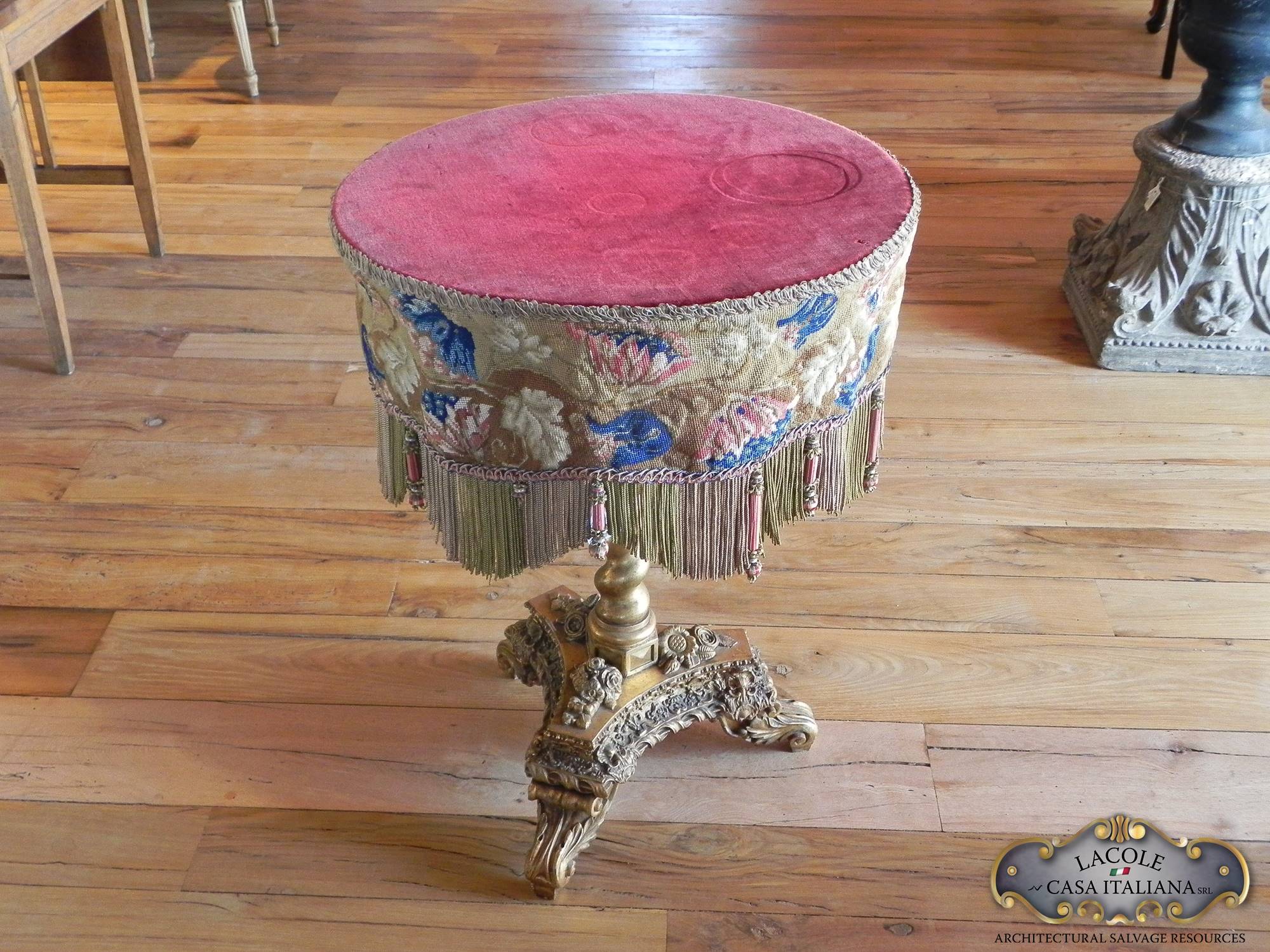 Tavolino antico con piano in velluto, base in legno dorato con oro in foglia, finemente intagliato a motivi floreali e vegetali. Il tavolino risale al 1800.