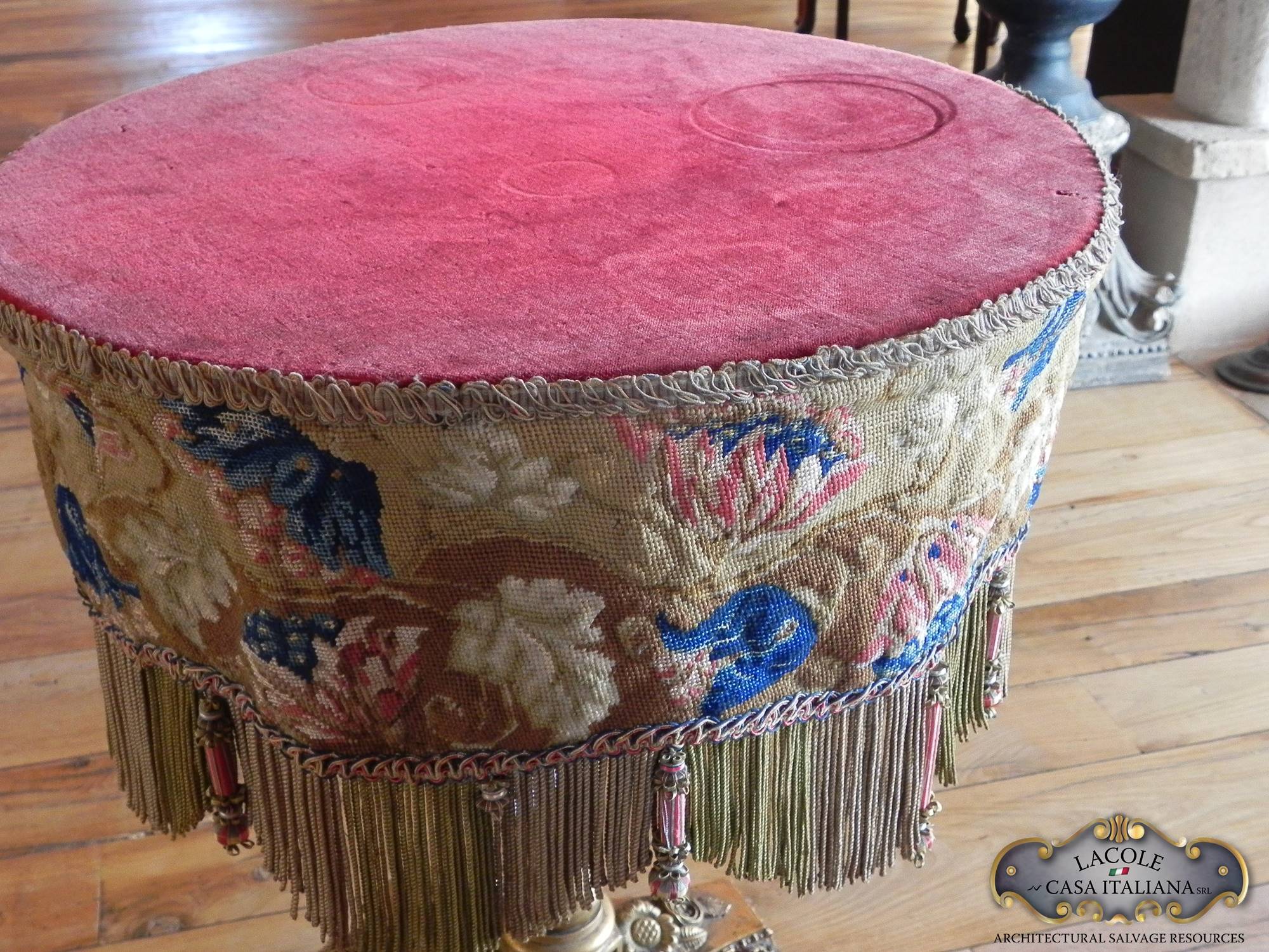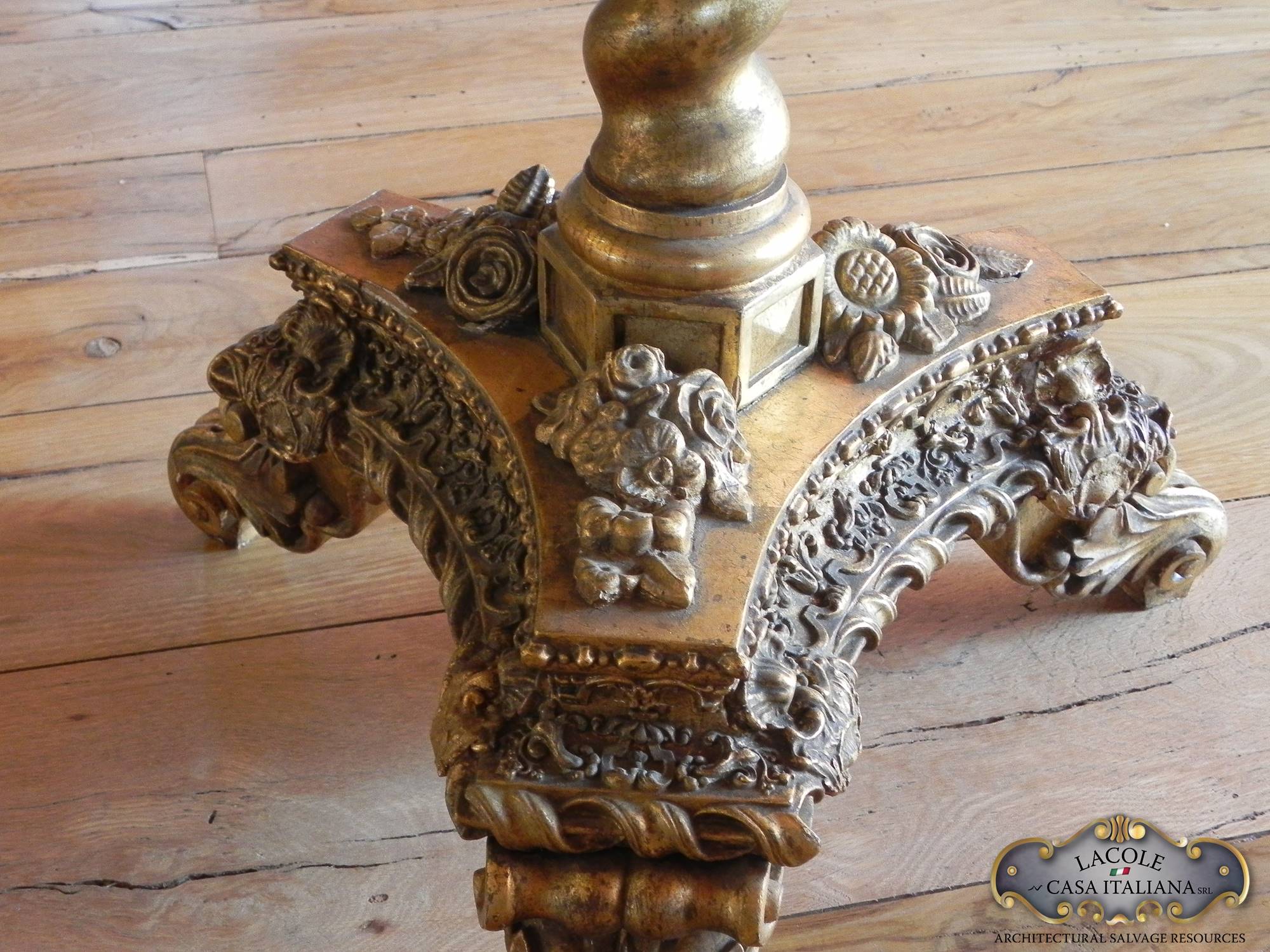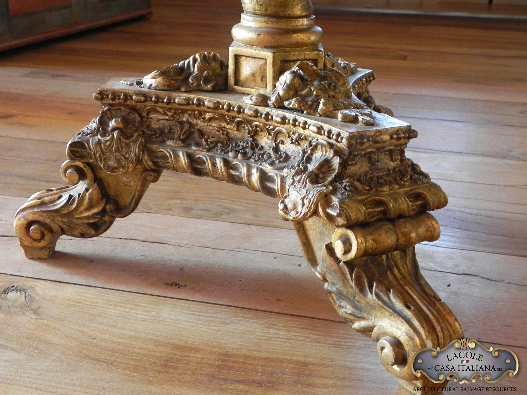 Tavolino antico con piano in velluto, base in legno dorato con oro in foglia, finemente intagliato a motivi floreali e vegetali. Il tavolino risale al 1800.
