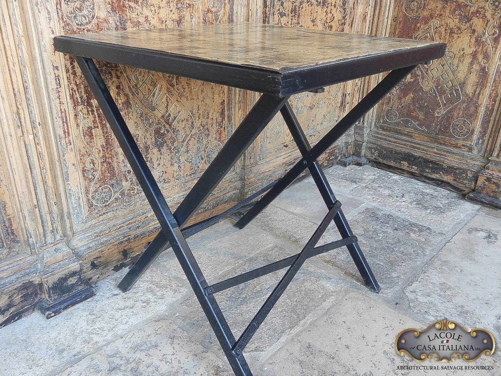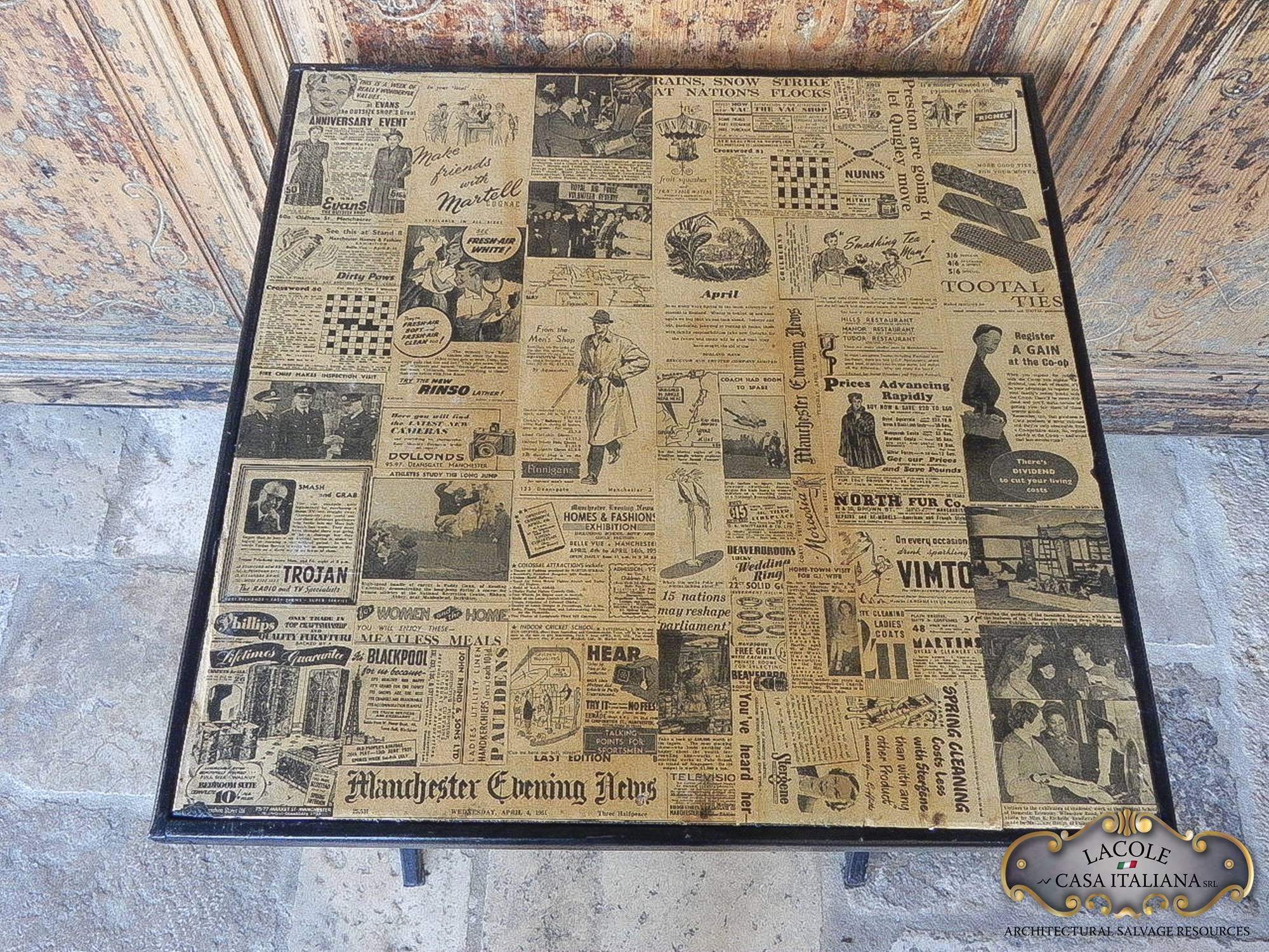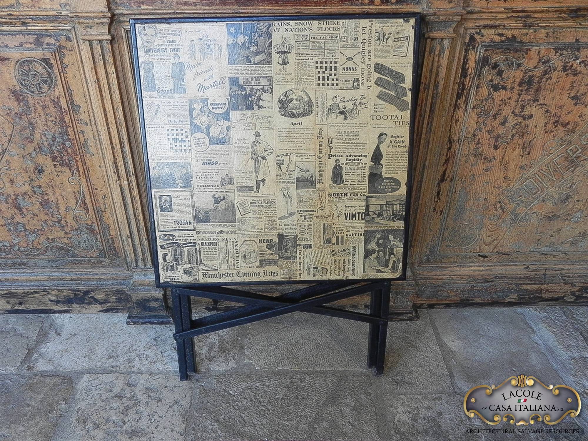 Tavolino da bistrot antico, richiudibile, realizzato in legno ebanizzato nero. Il piano è in legno e decoupage di vecchi articoli di giornale. Epoca primi 1900.