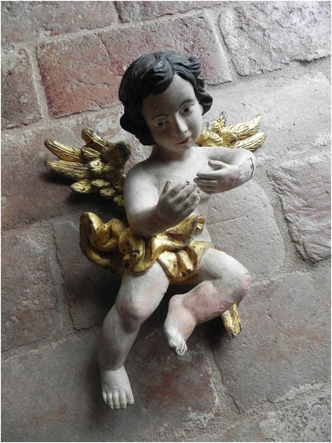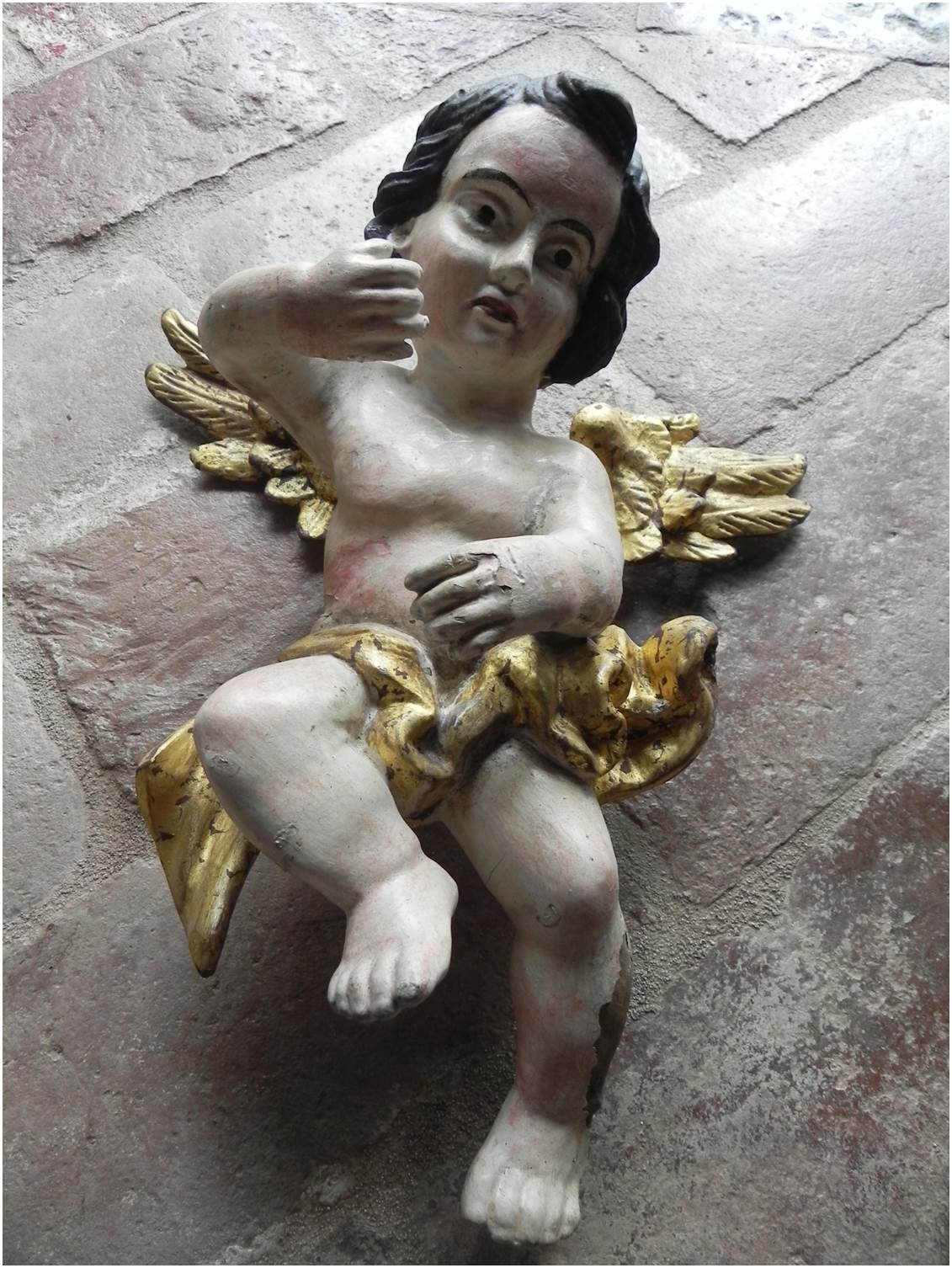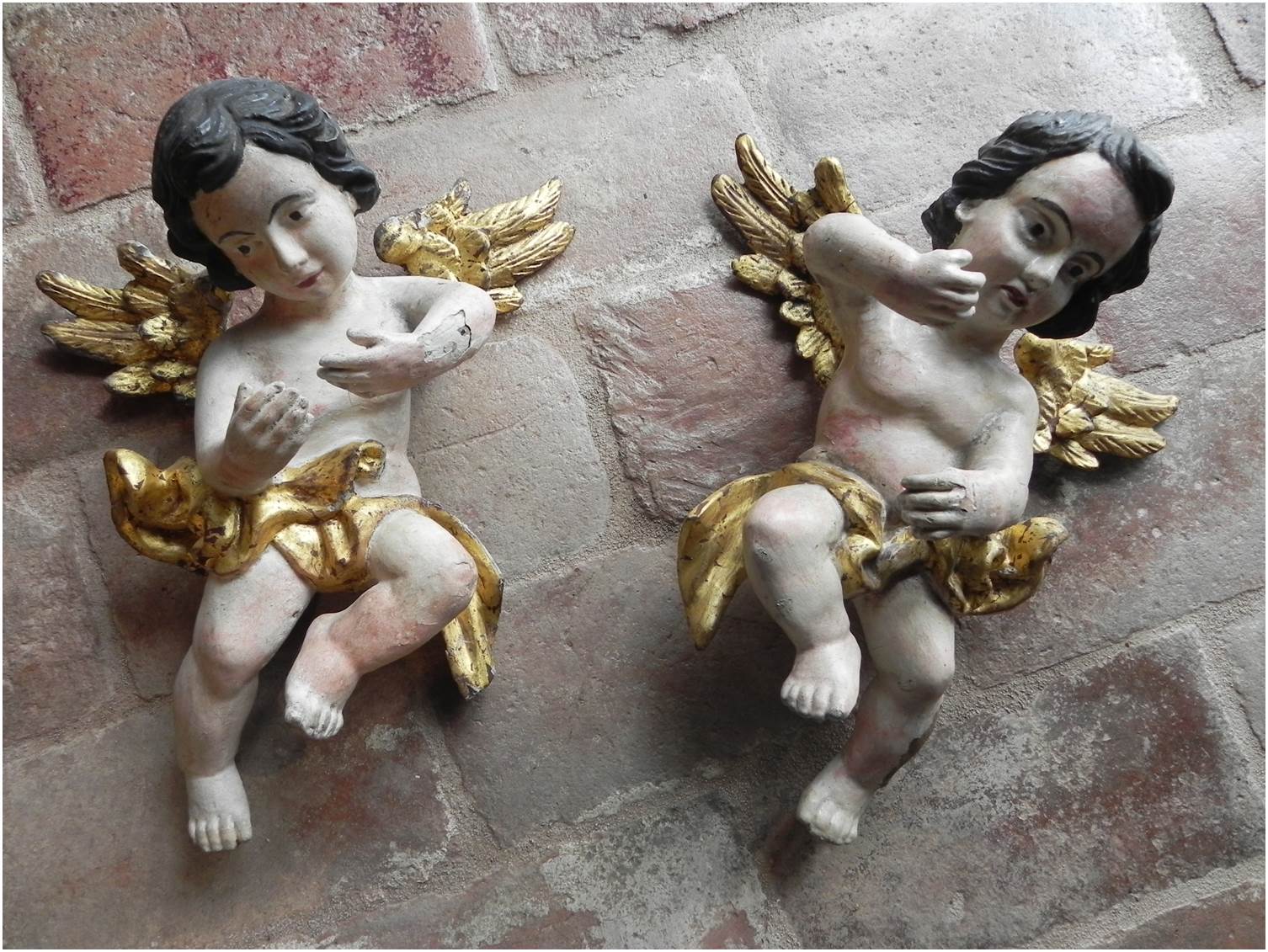 Antica coppia di angeli in legno laccato e dorato, epoca presunta 1700