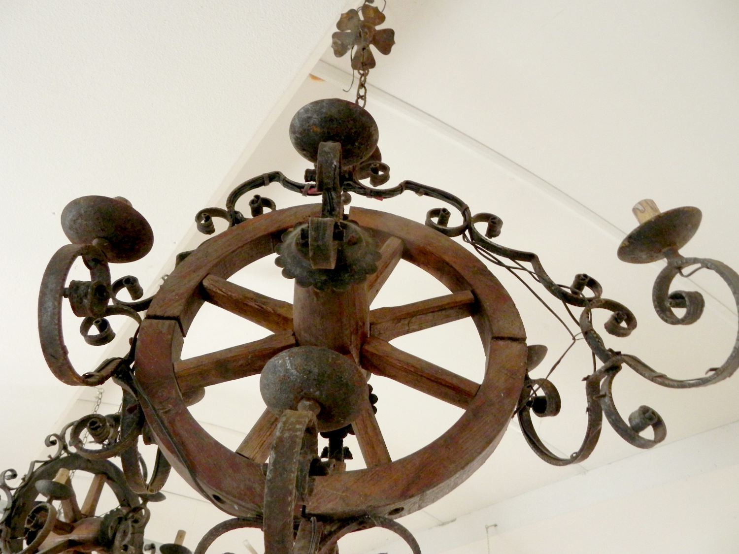 Lampadario realizzato utilizzando una vecchia ruota di carro.