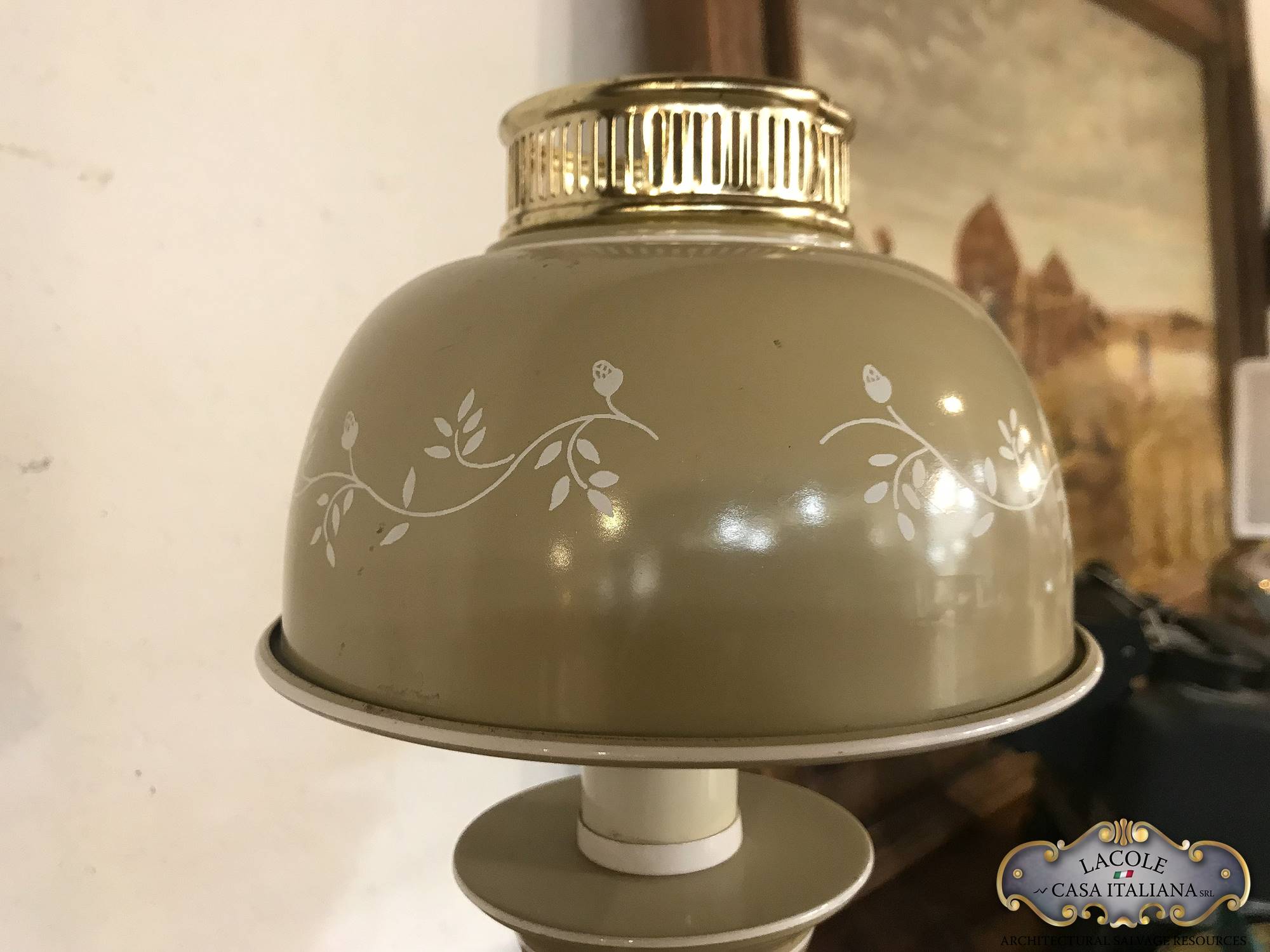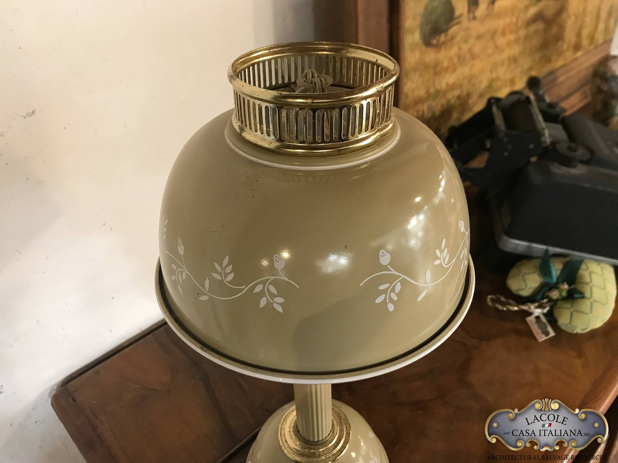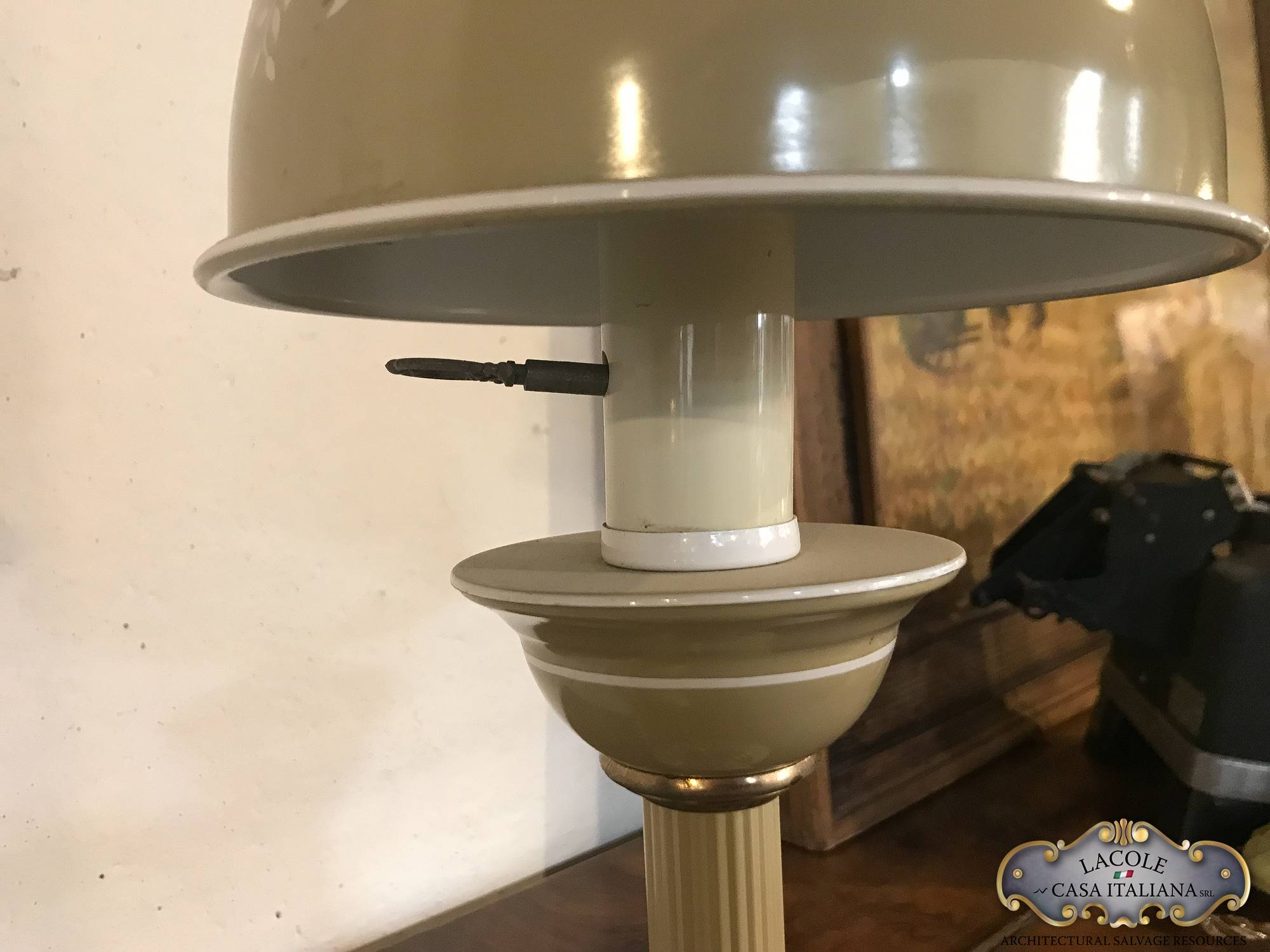 Lampada da studio in metallo laccato e decorato, inserti in ottone, Anni ’60.