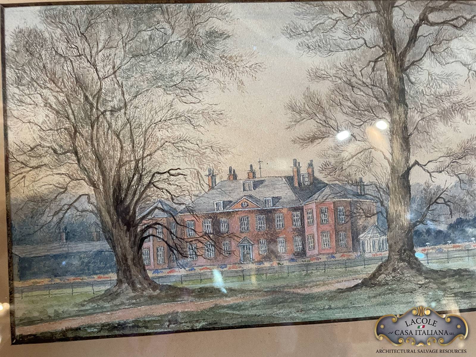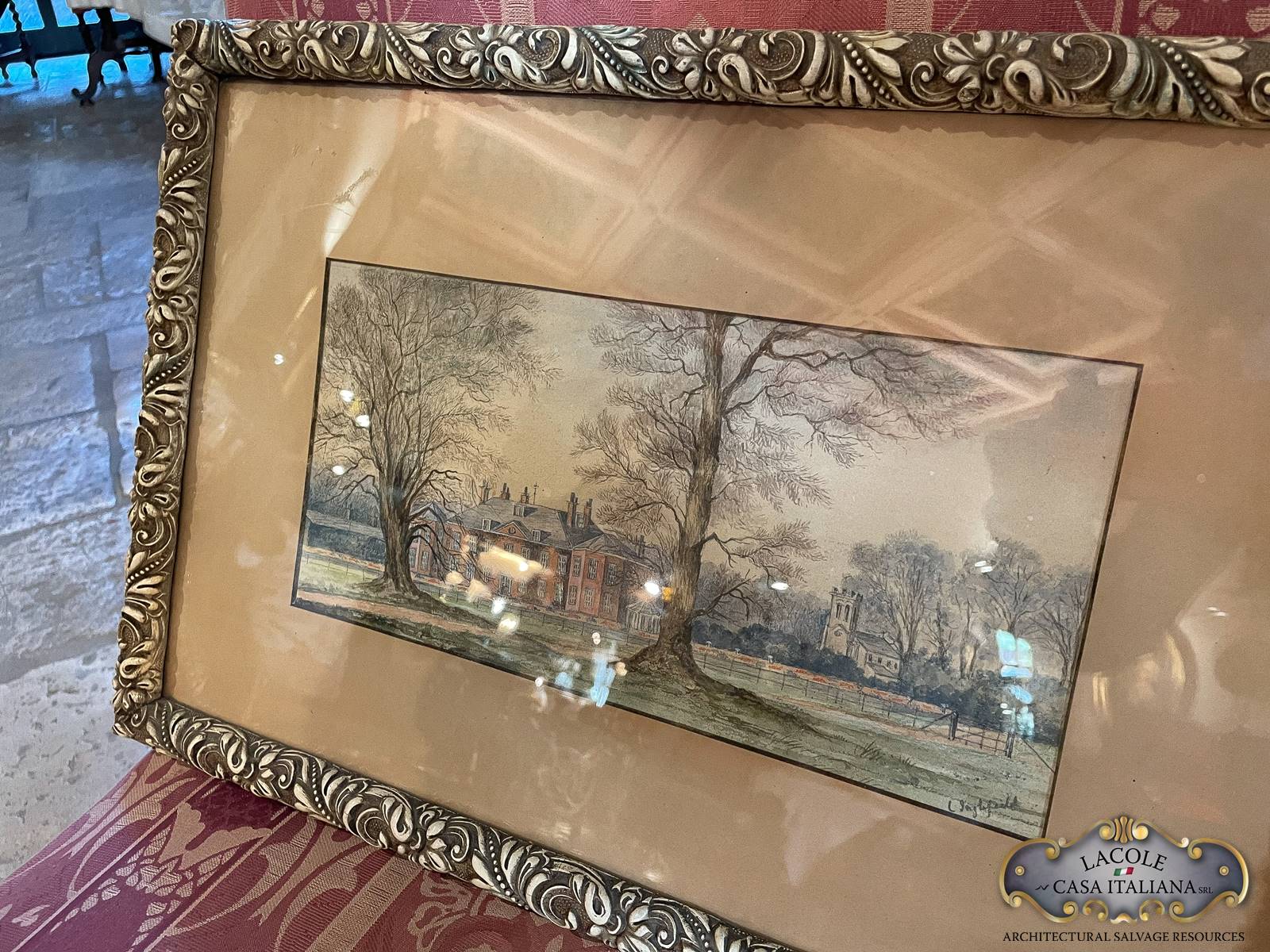 Quadro con stampa antica acquarellata, cornice in legno intagliato e decapato a pittura in argento.