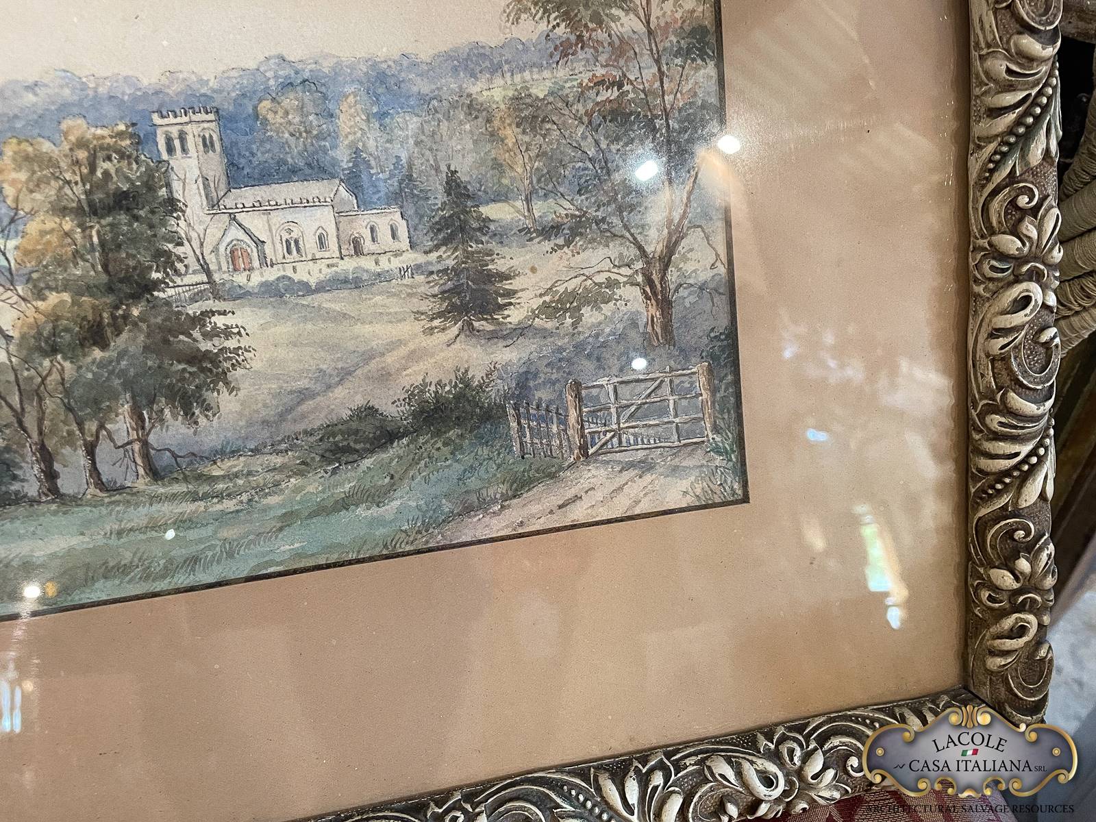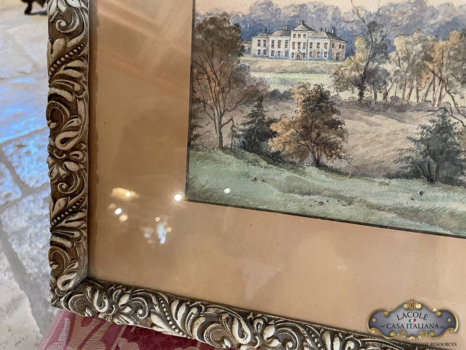 Quadro con stampa antica acquarellata; la cornice è in legno intagliato e decapato a pittura in argento.