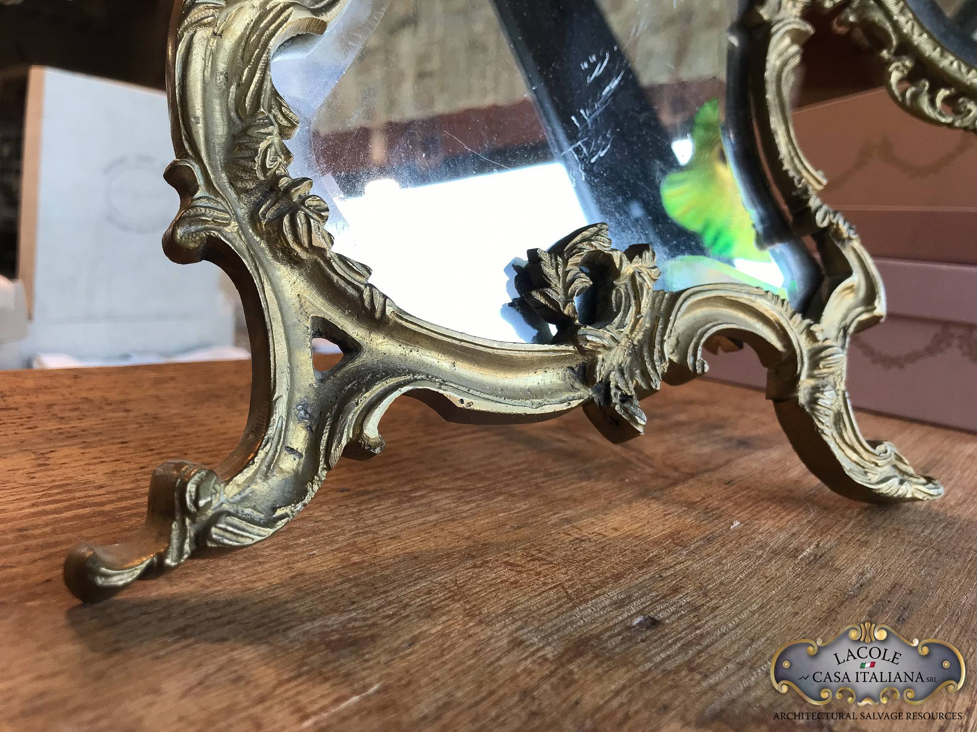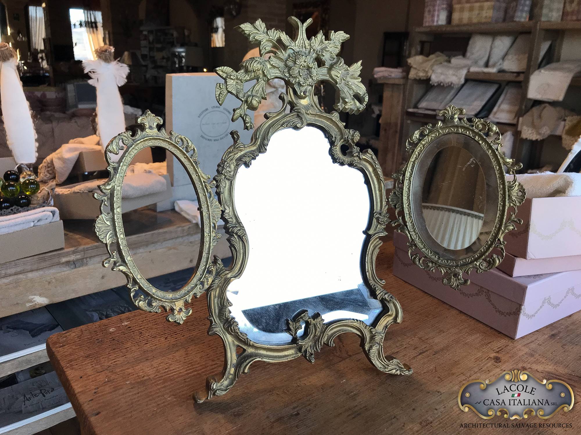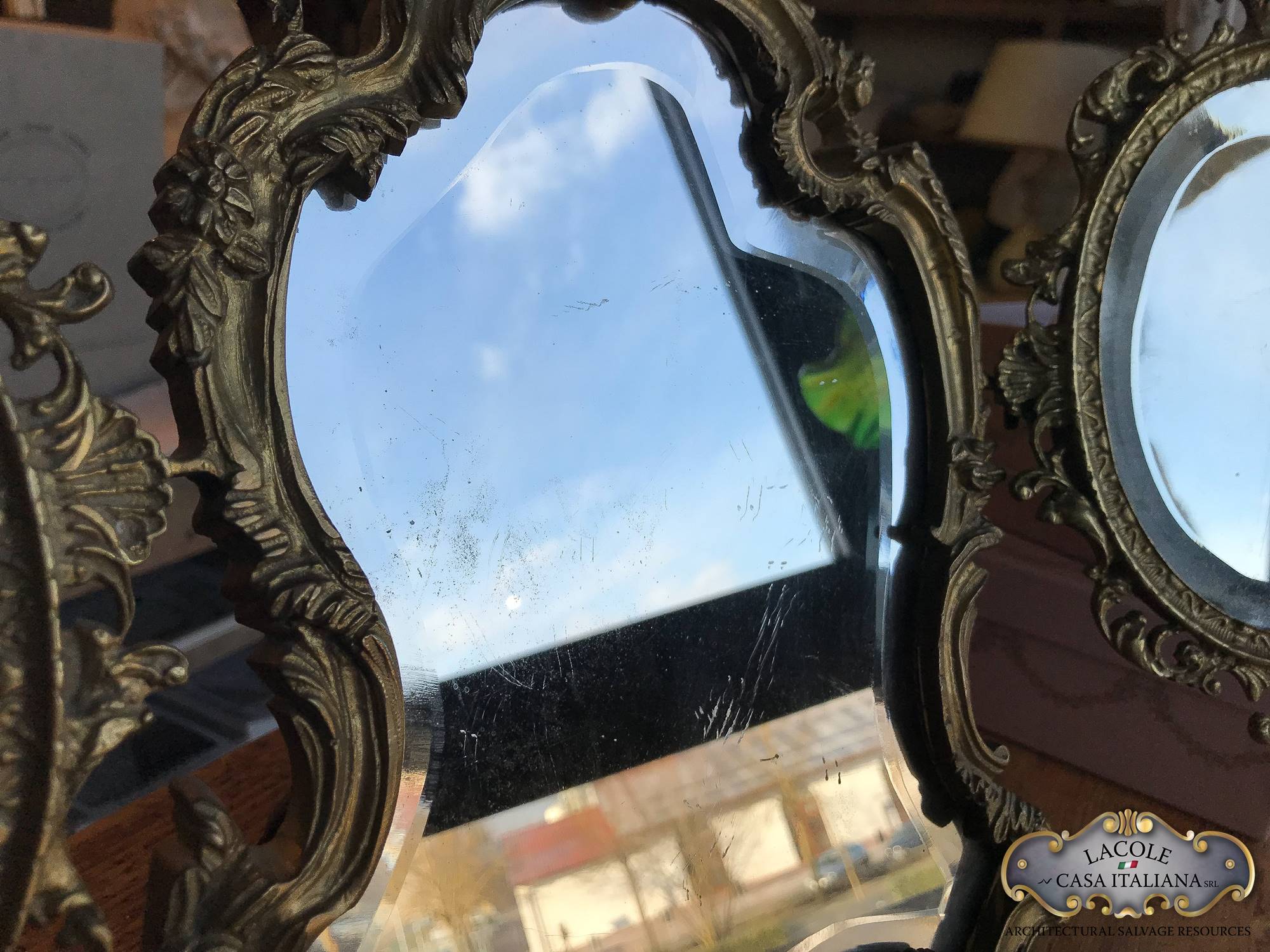Specchio da tavolo in fusione ottone e metallo. Gli specchi sono molati. Epoca prima metà 1900.