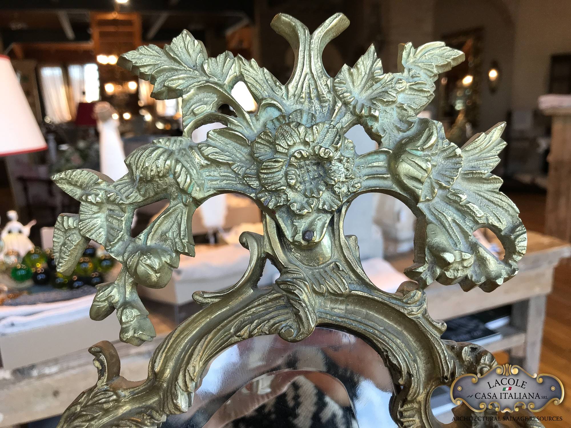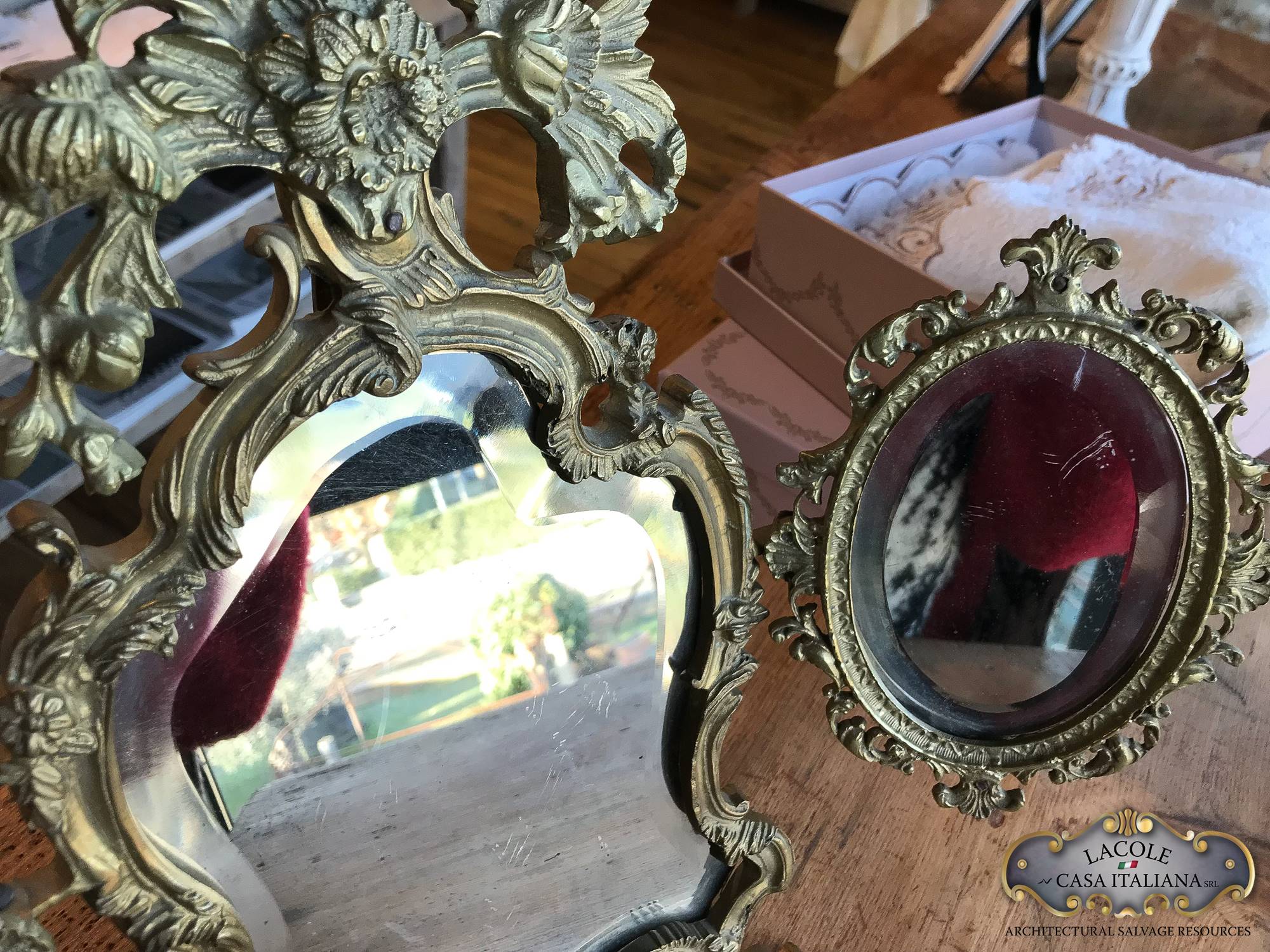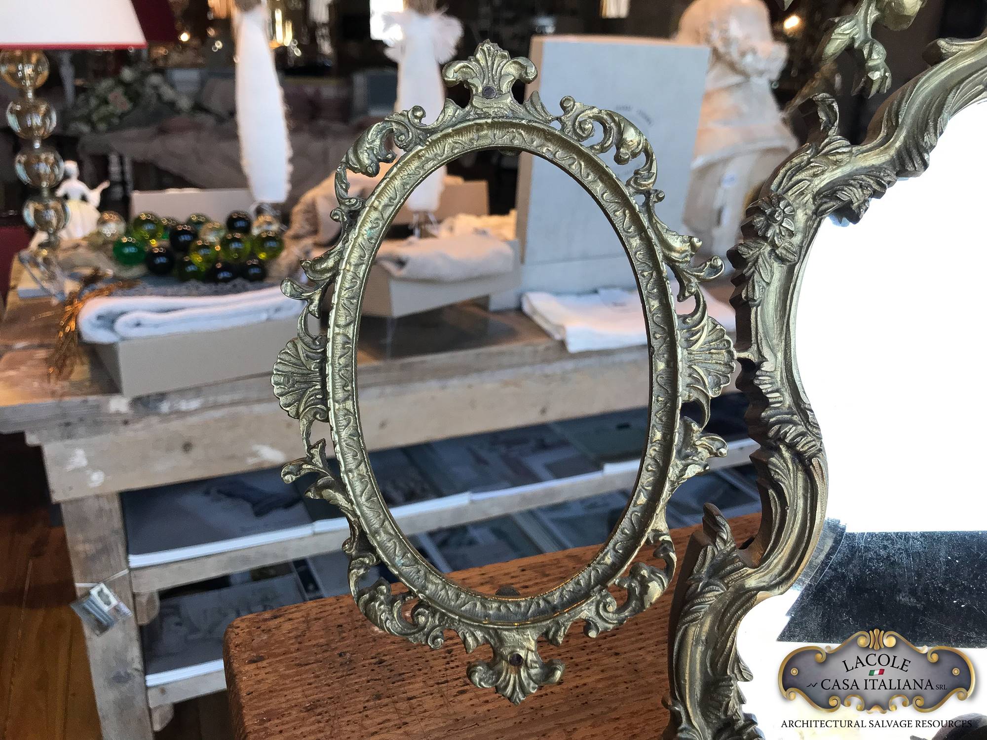 Specchio da tavolo in fusione ottone e metallo. Gli specchi sono molati. Epoca prima metà 1900.