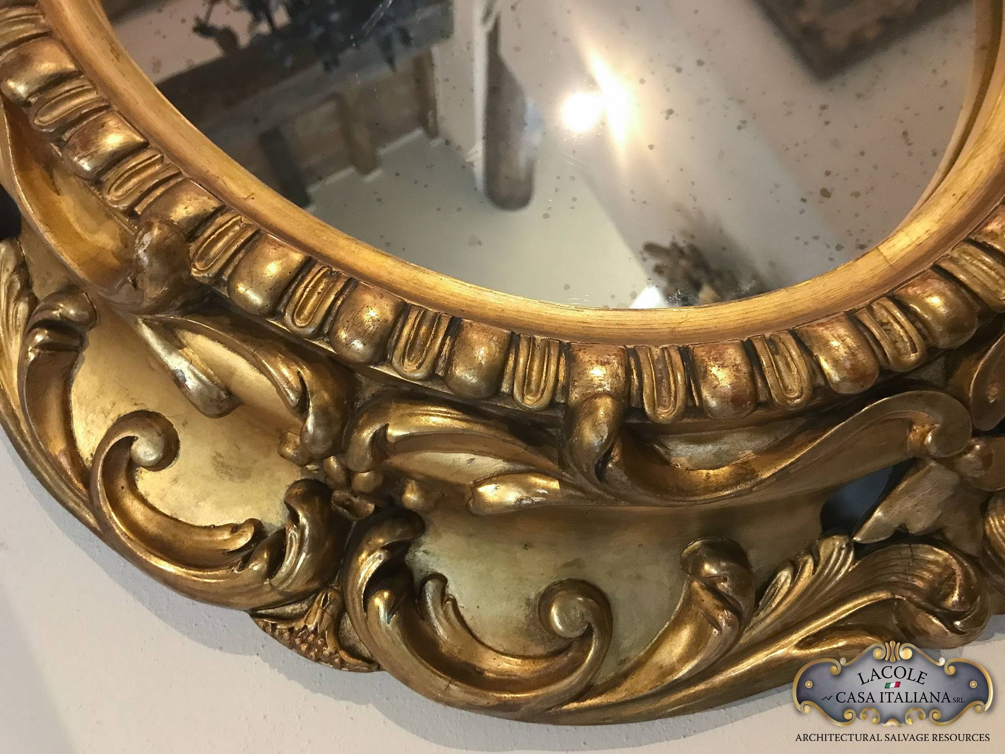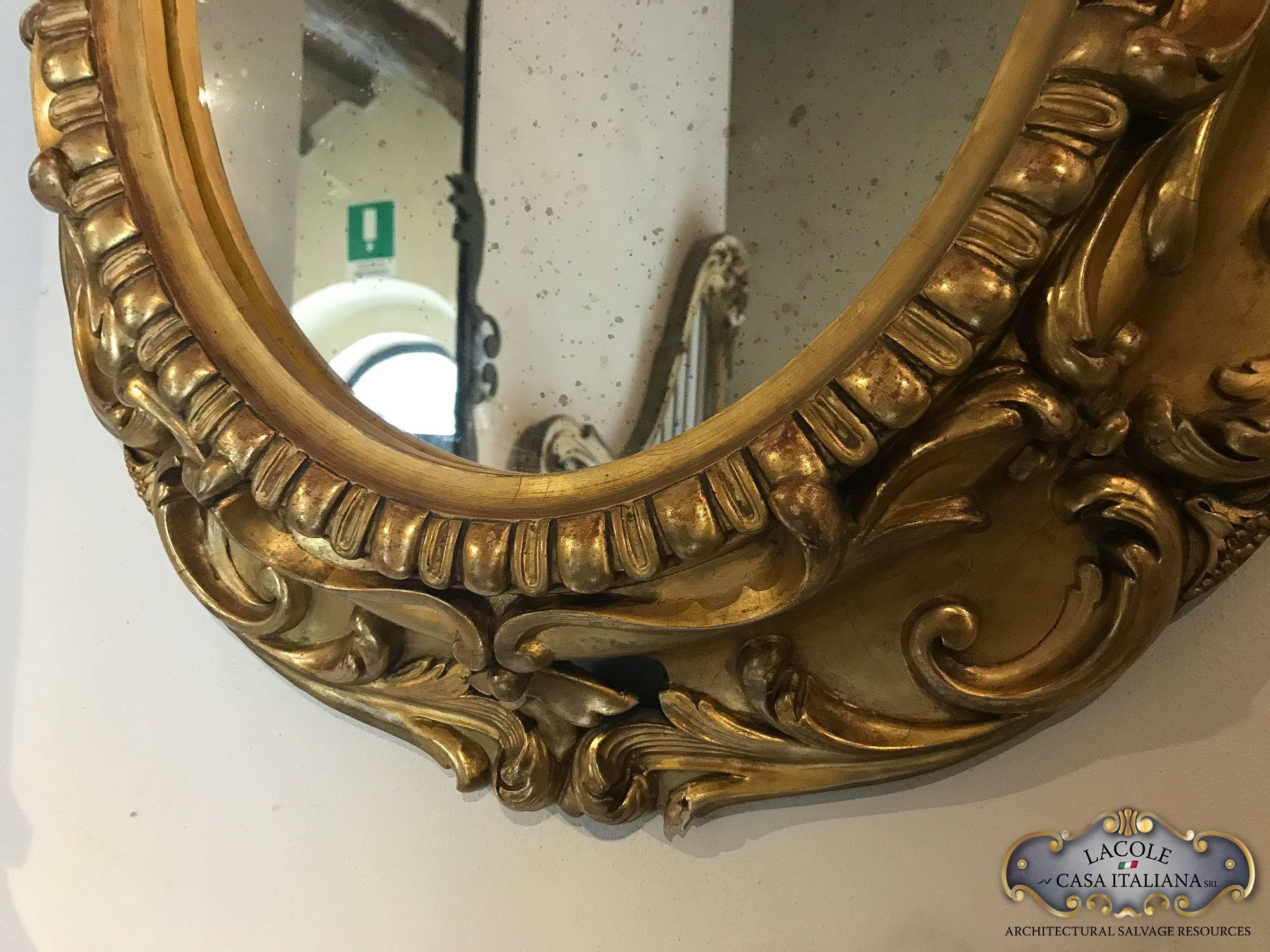 Antica specchiera finemente intagliata e dorata a foglia oro, Specchio anticato. Stile Barocco, Epoca 1700. Restaurata.