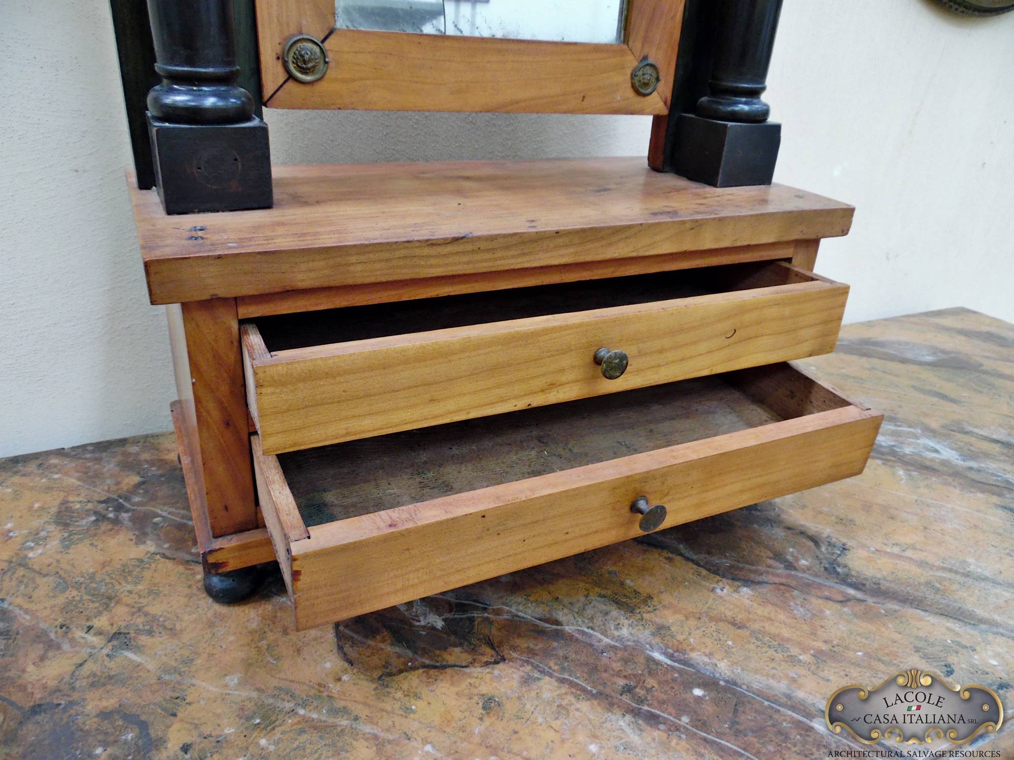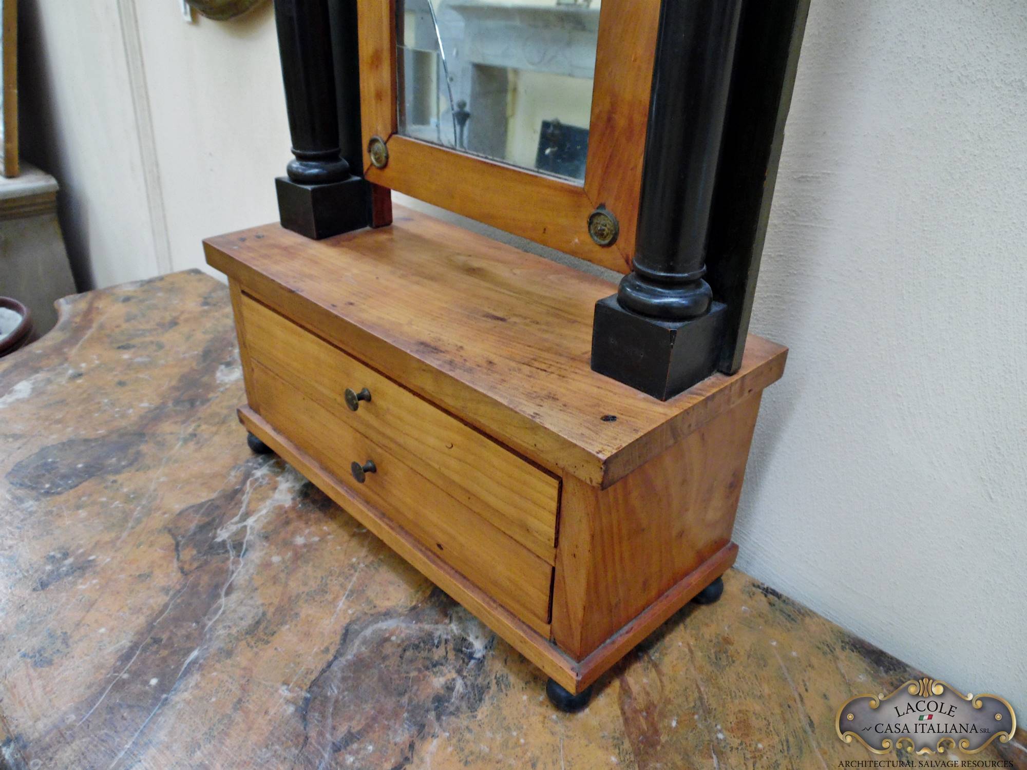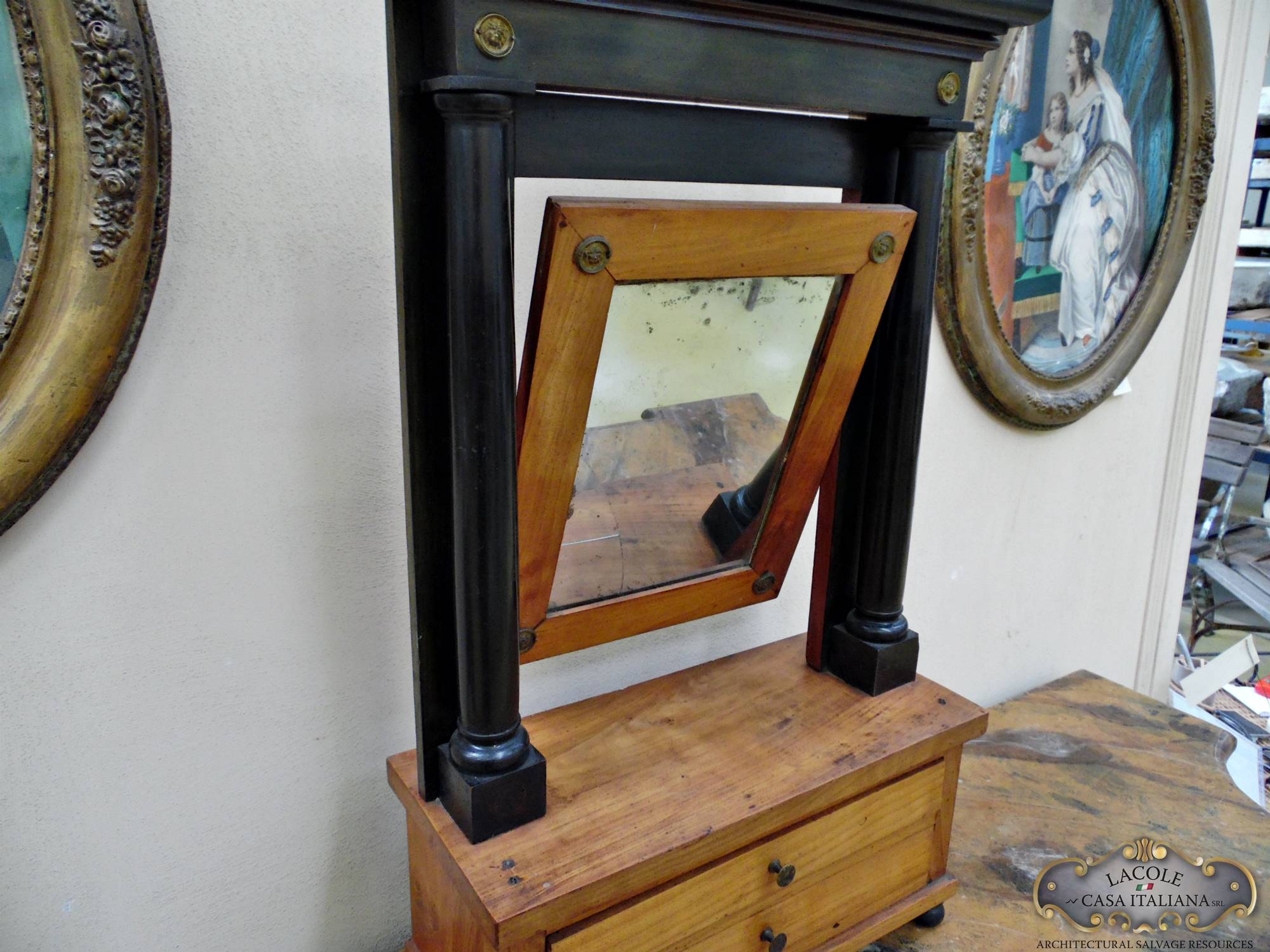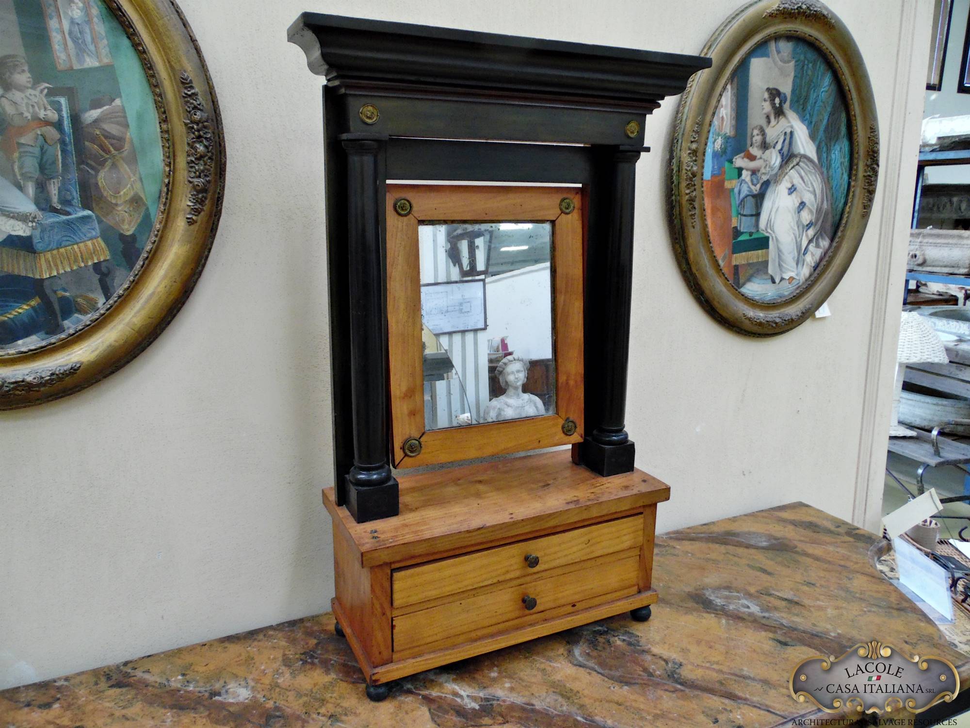 Specchiera antica in stile Impero, realizzata in legno. Detta anche Psiche, la specchiera presenta due cassetti frontali.