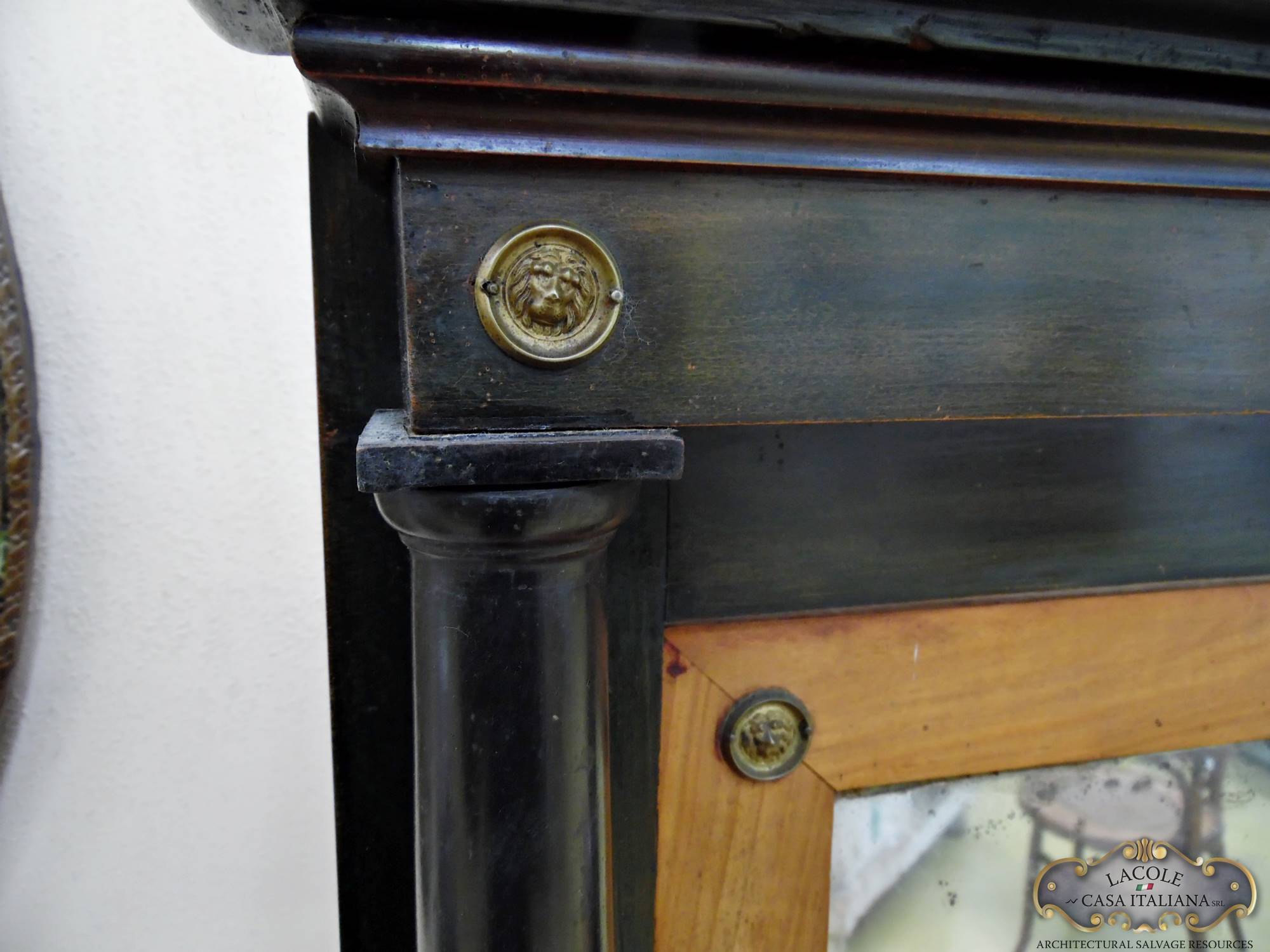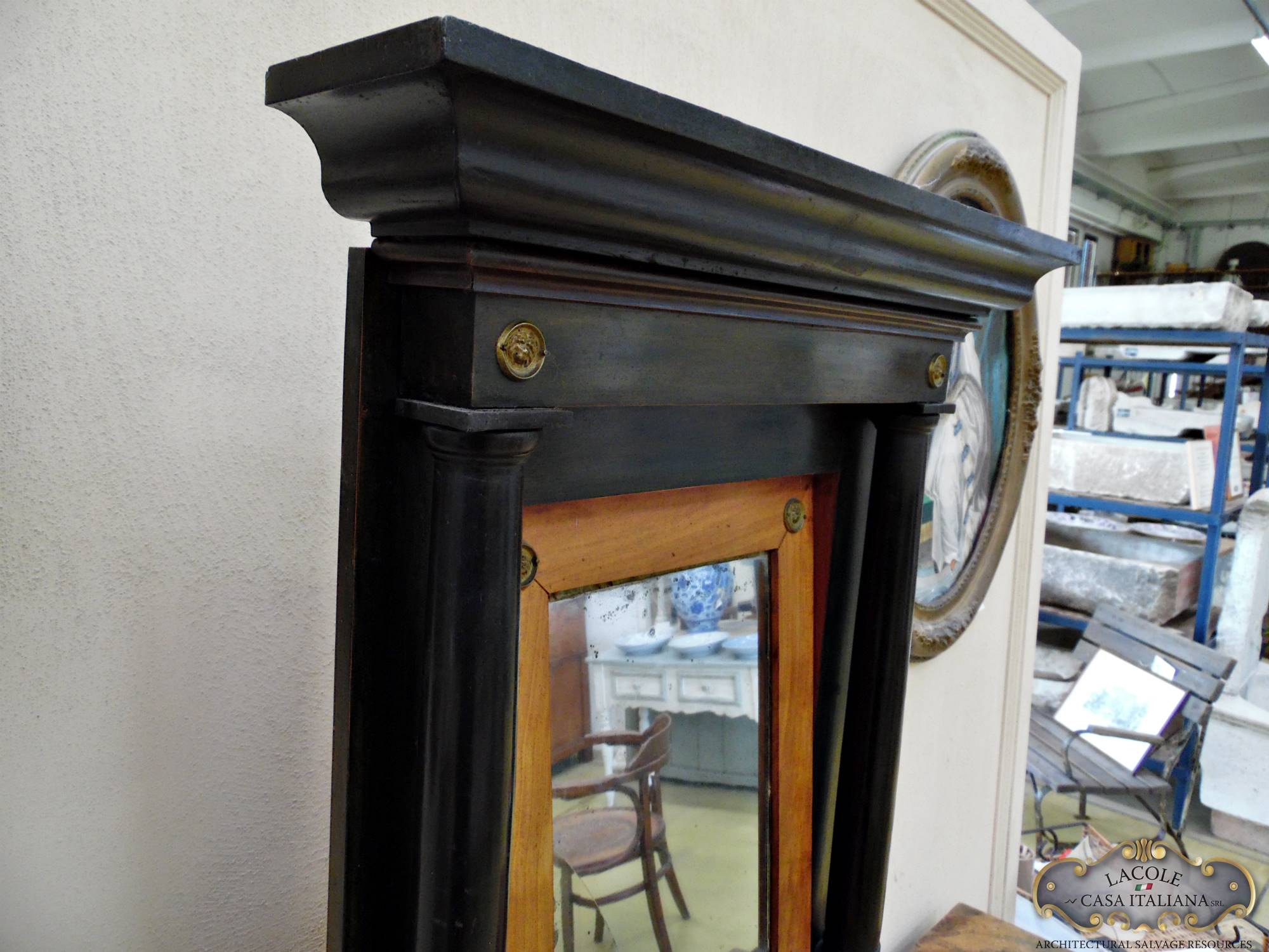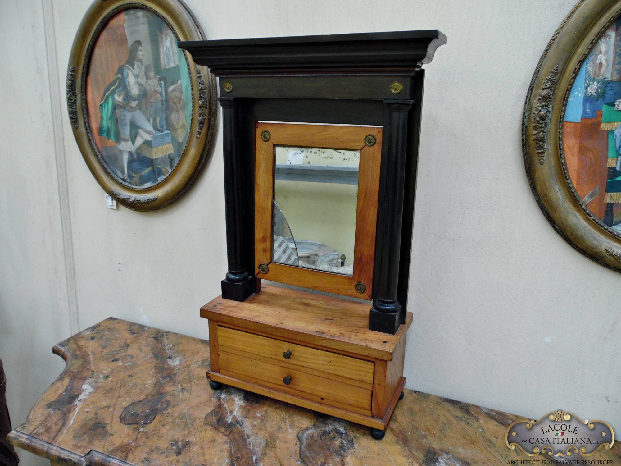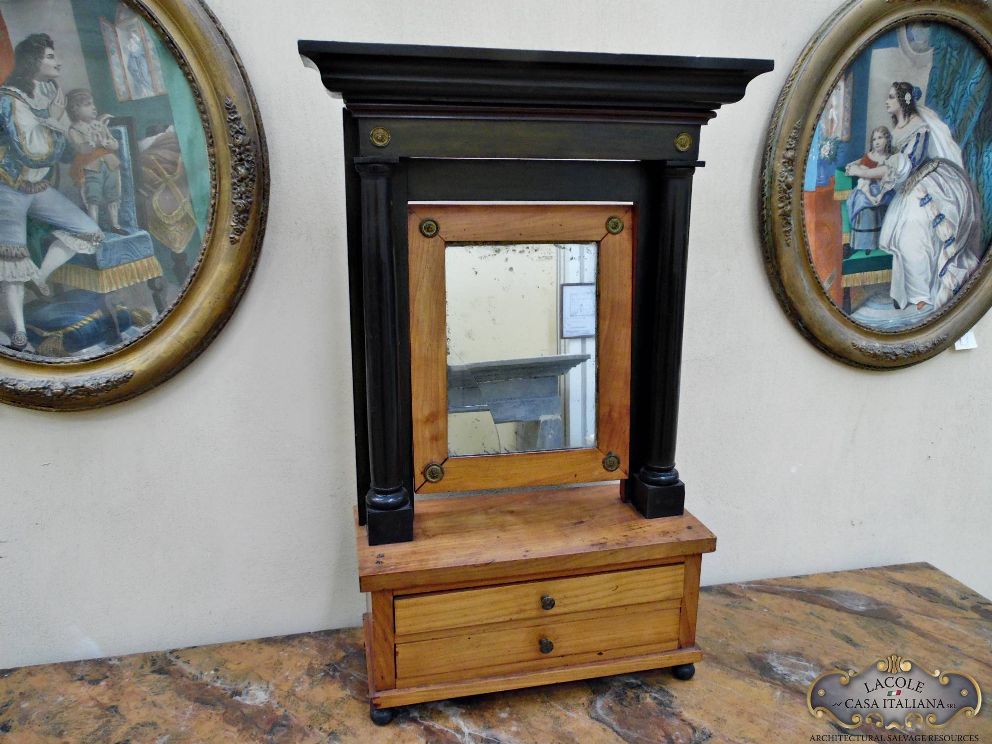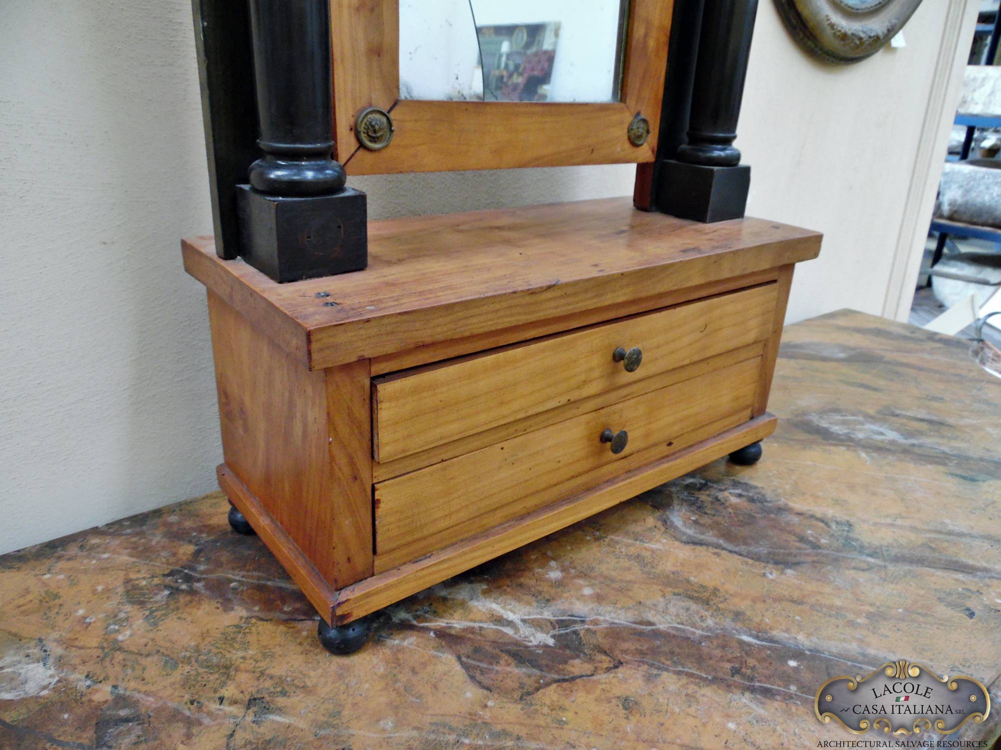 Specchiera antica in stile Impero, realizzata in legno. Detta anche Psiche, la specchiera presenta due cassetti frontali.