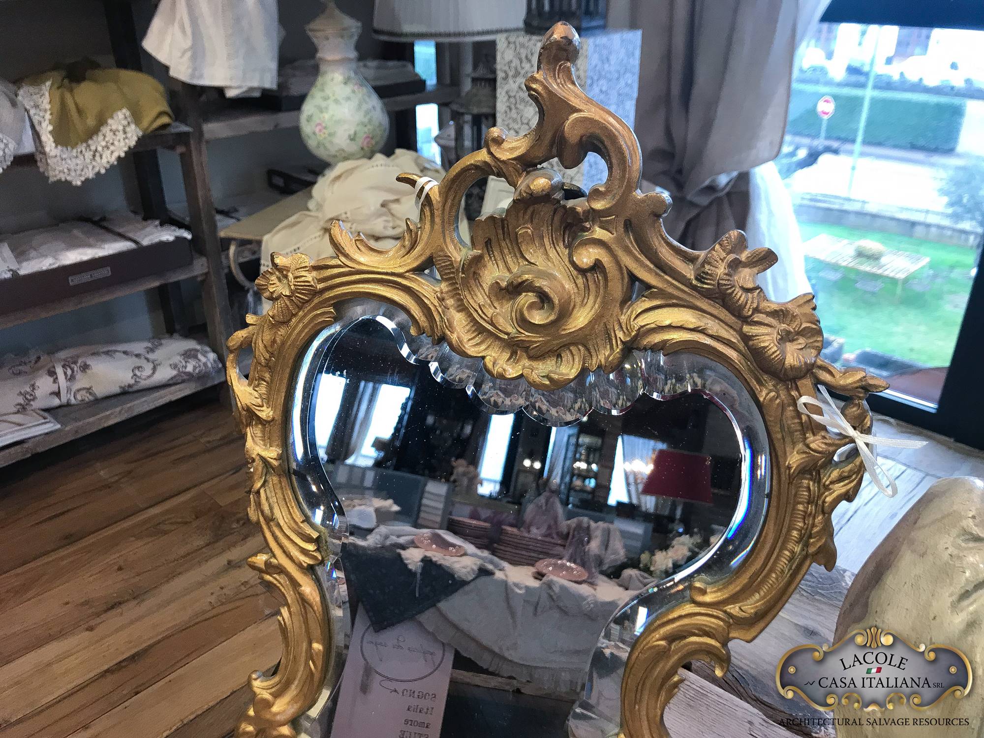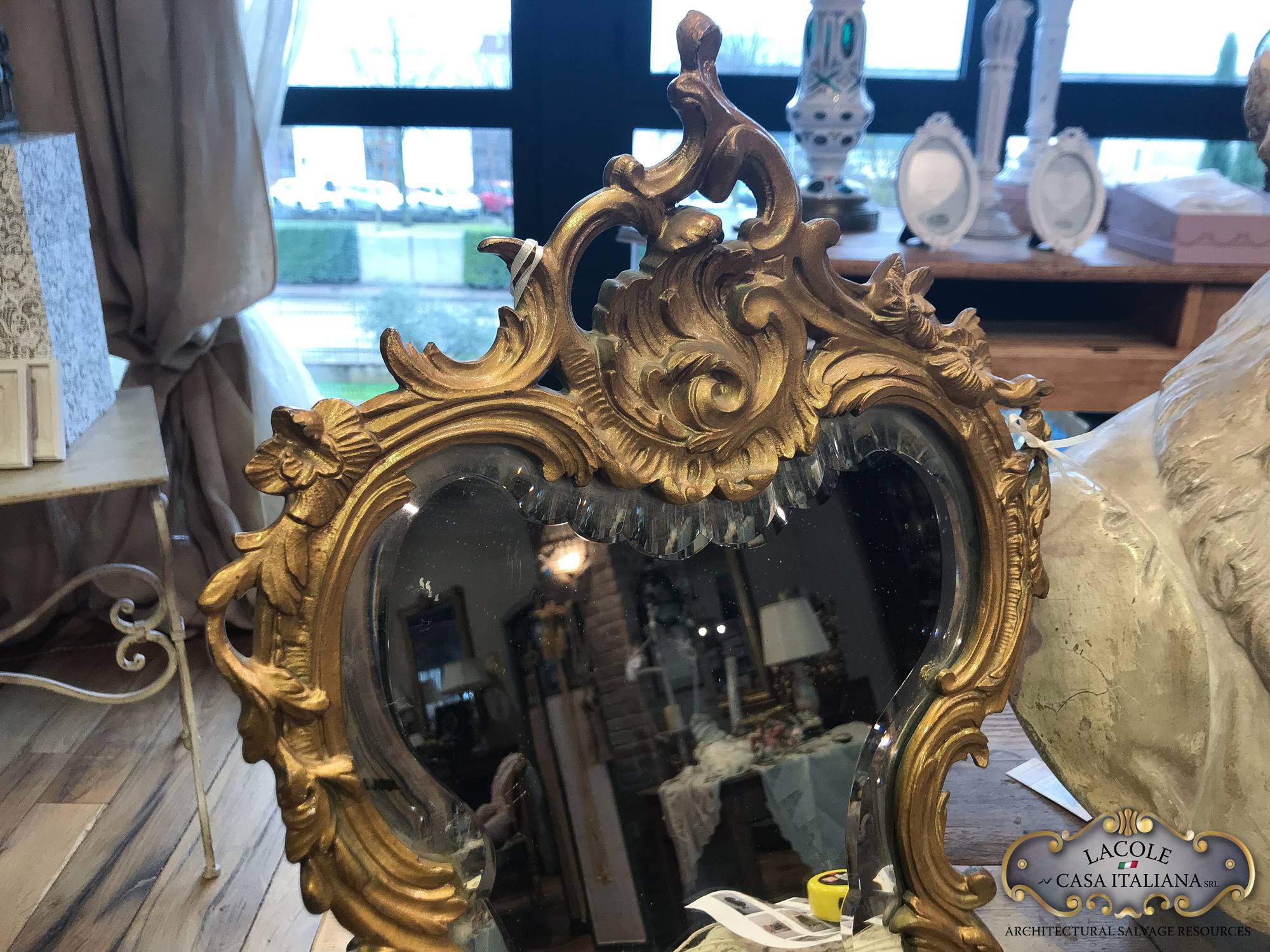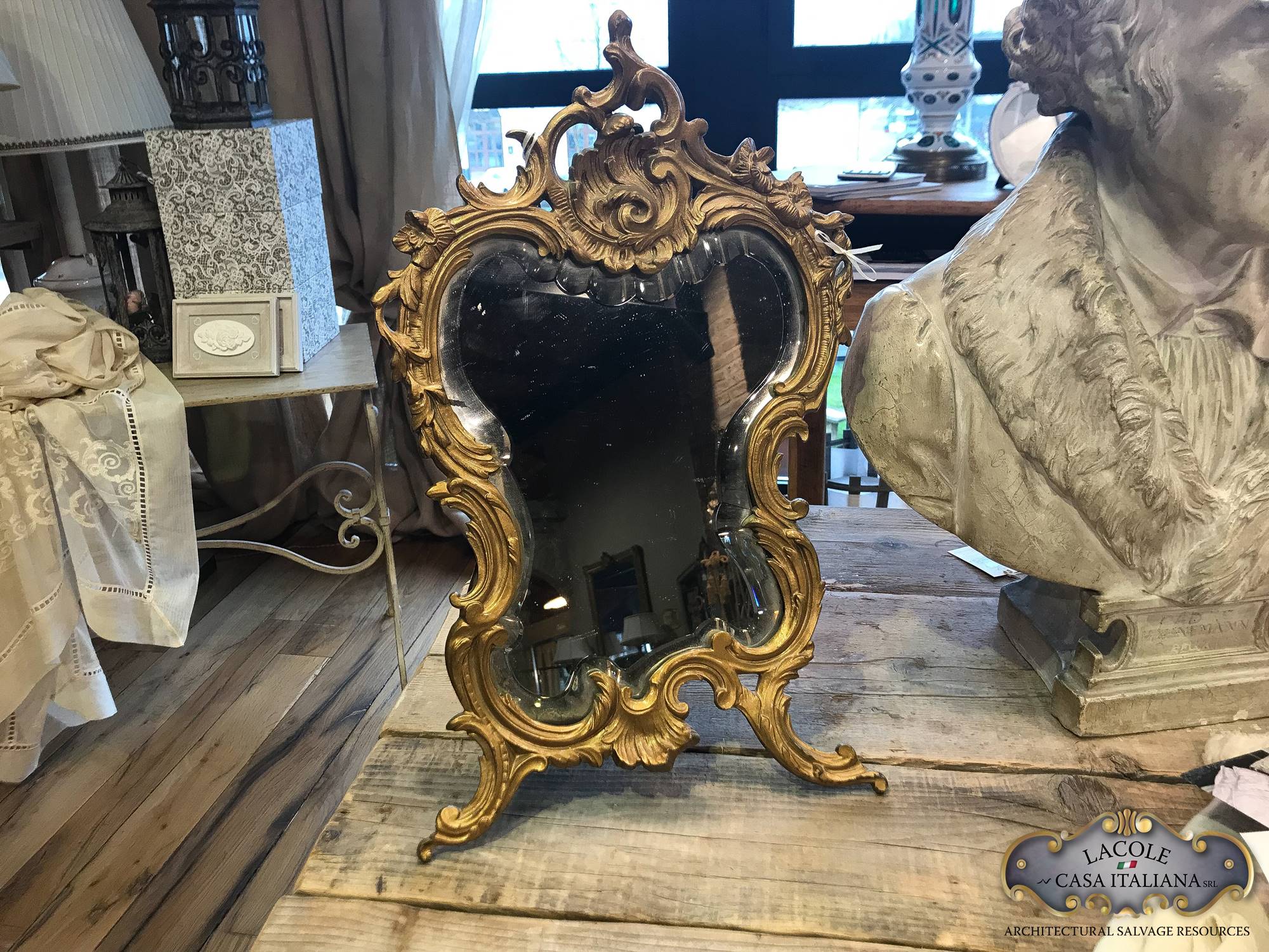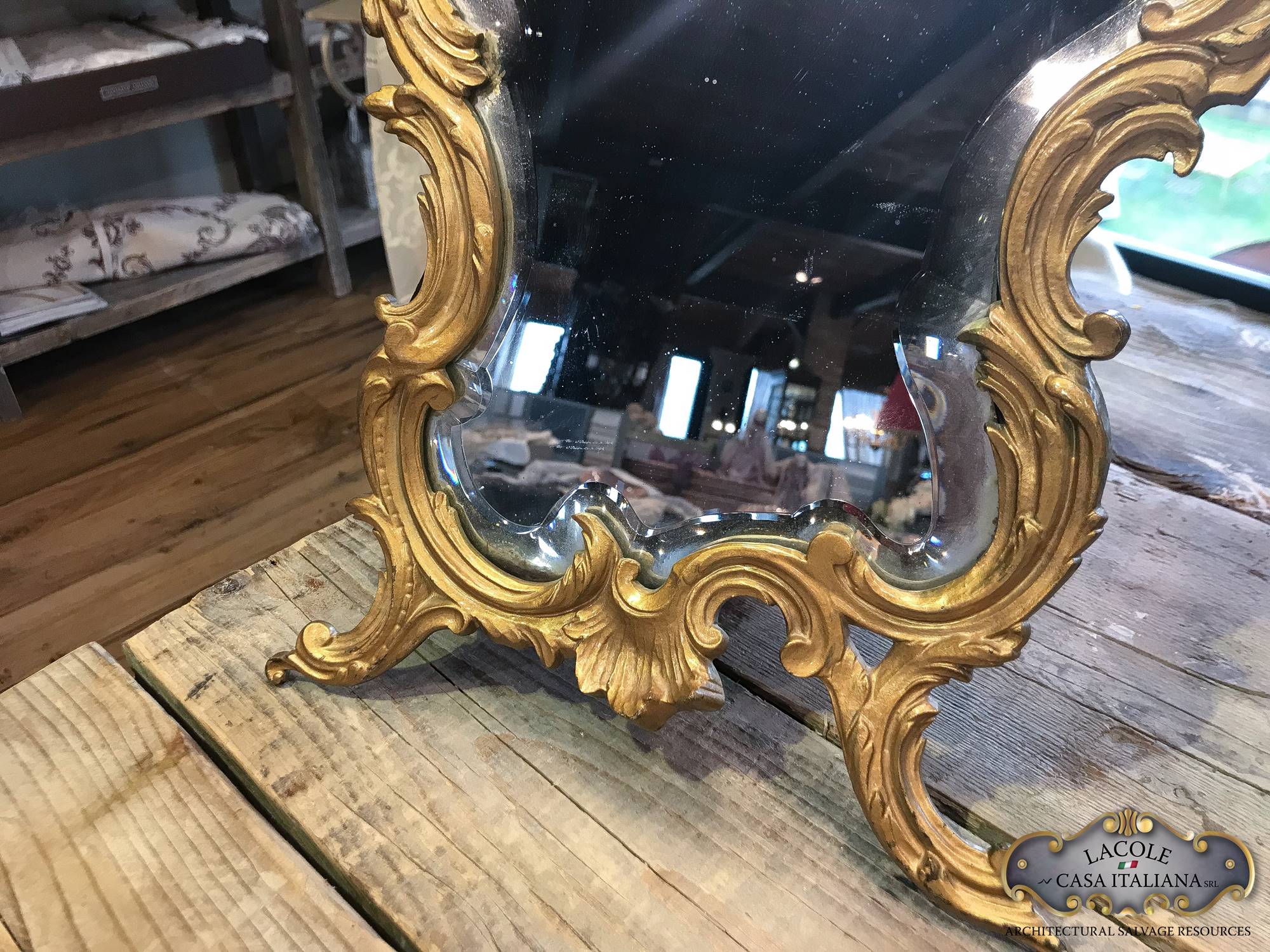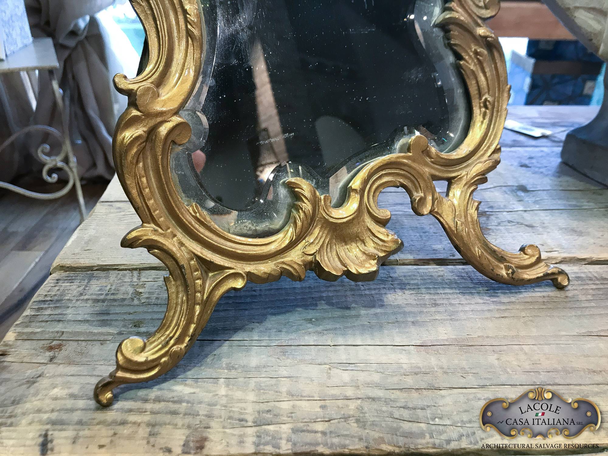 Specchiera da tavolo realizzato in metallo dorato. Specchio molato.