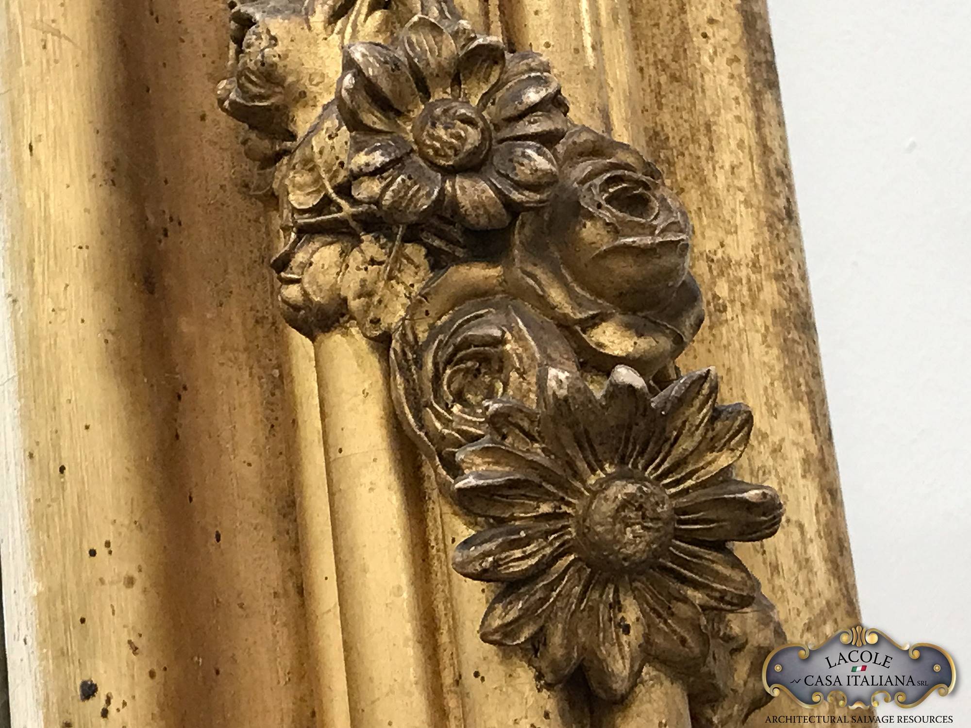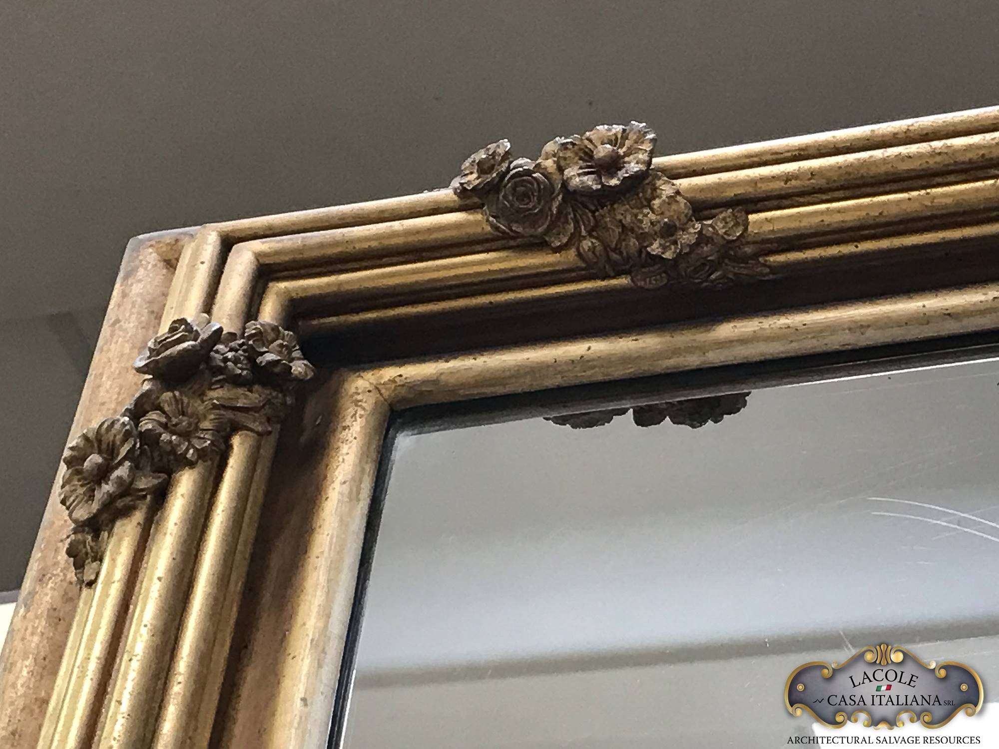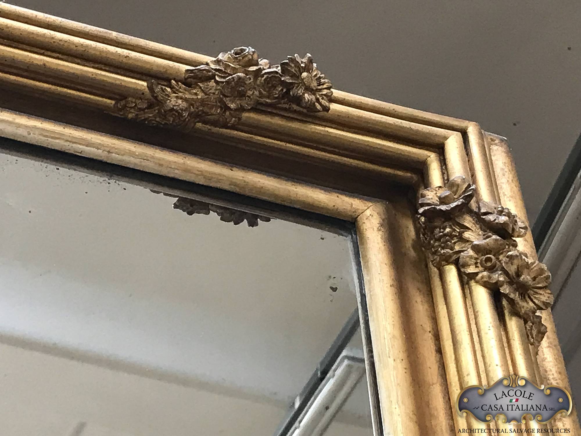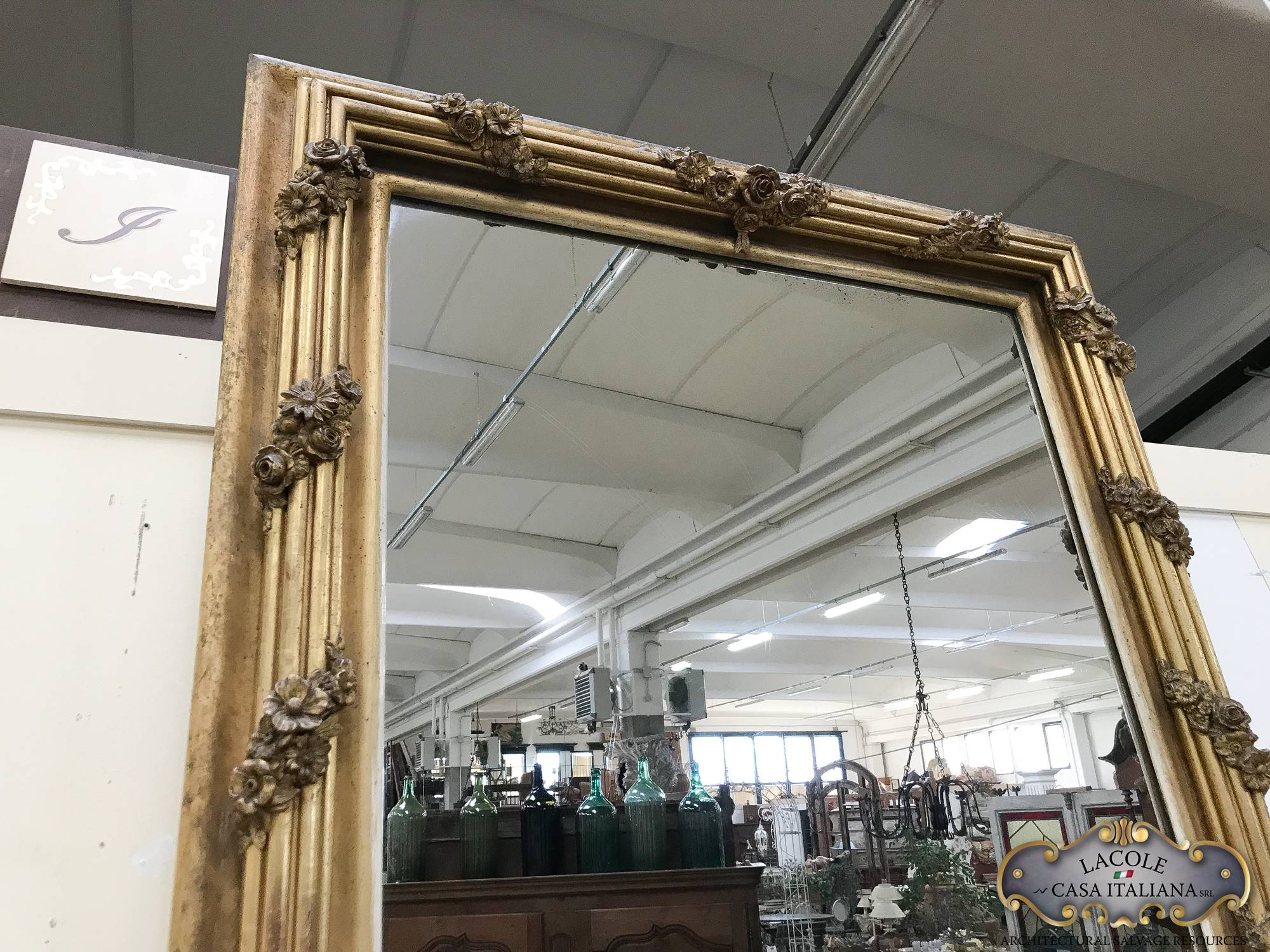 Antica specchiera in legno e stucchi dorati a foglia oro. La cornice è decorata a motivi floreali. Epoca 1800.