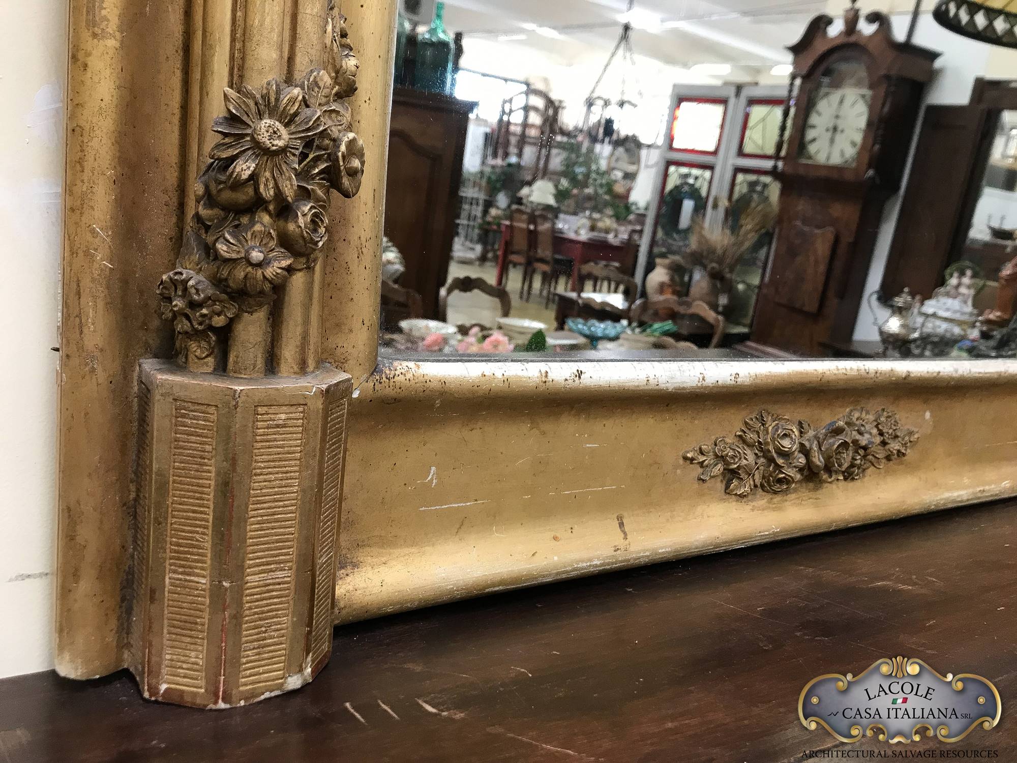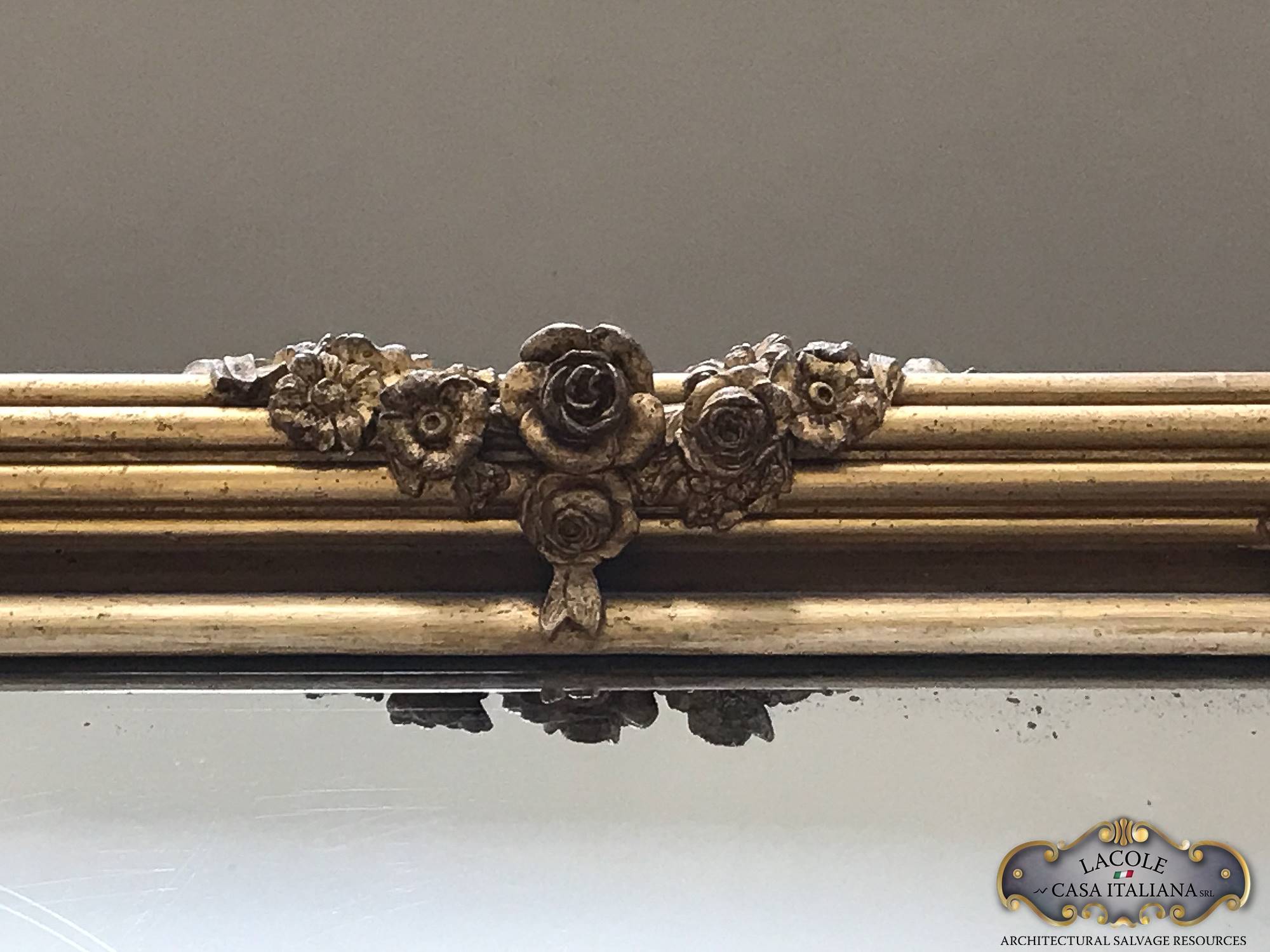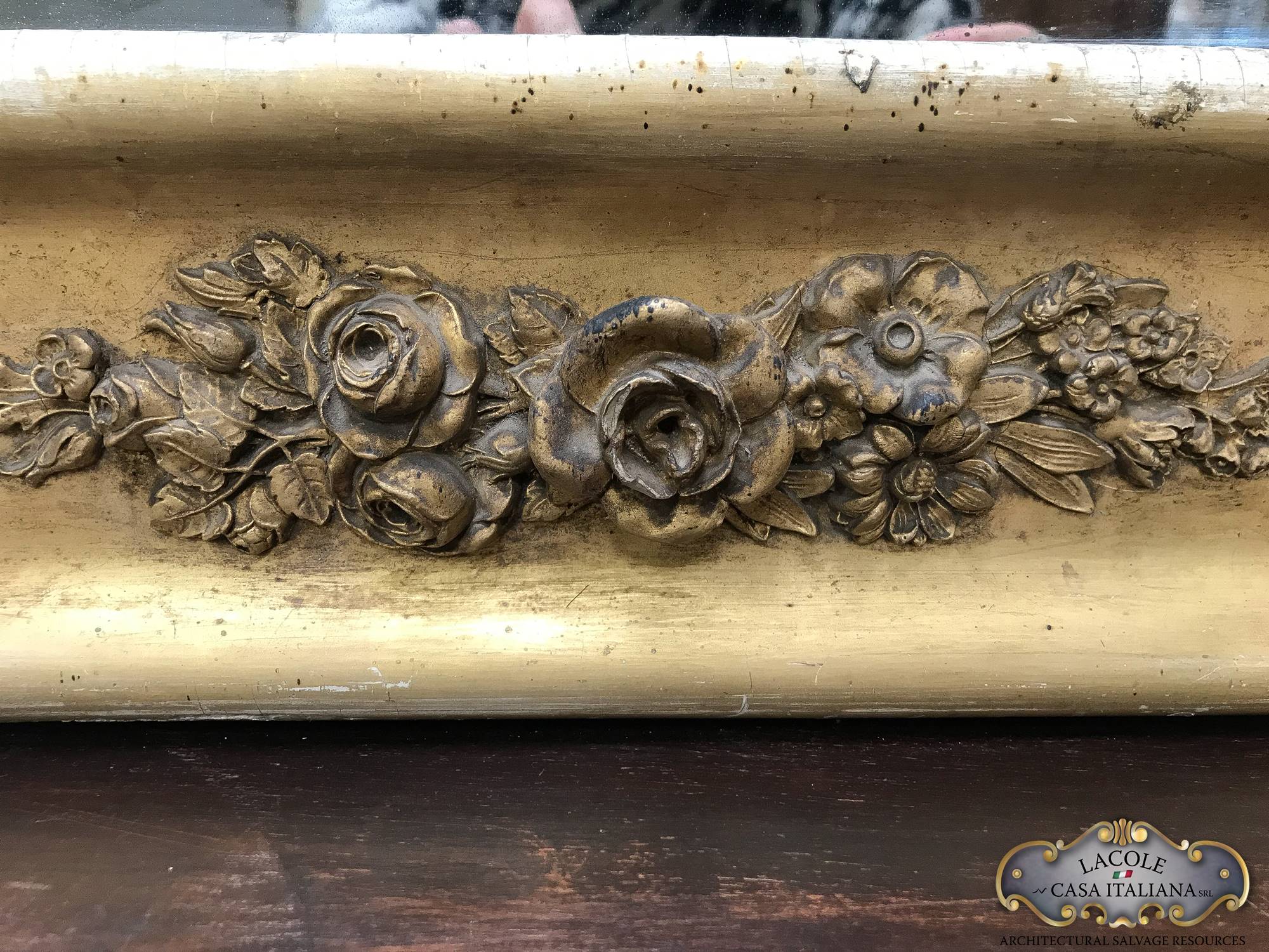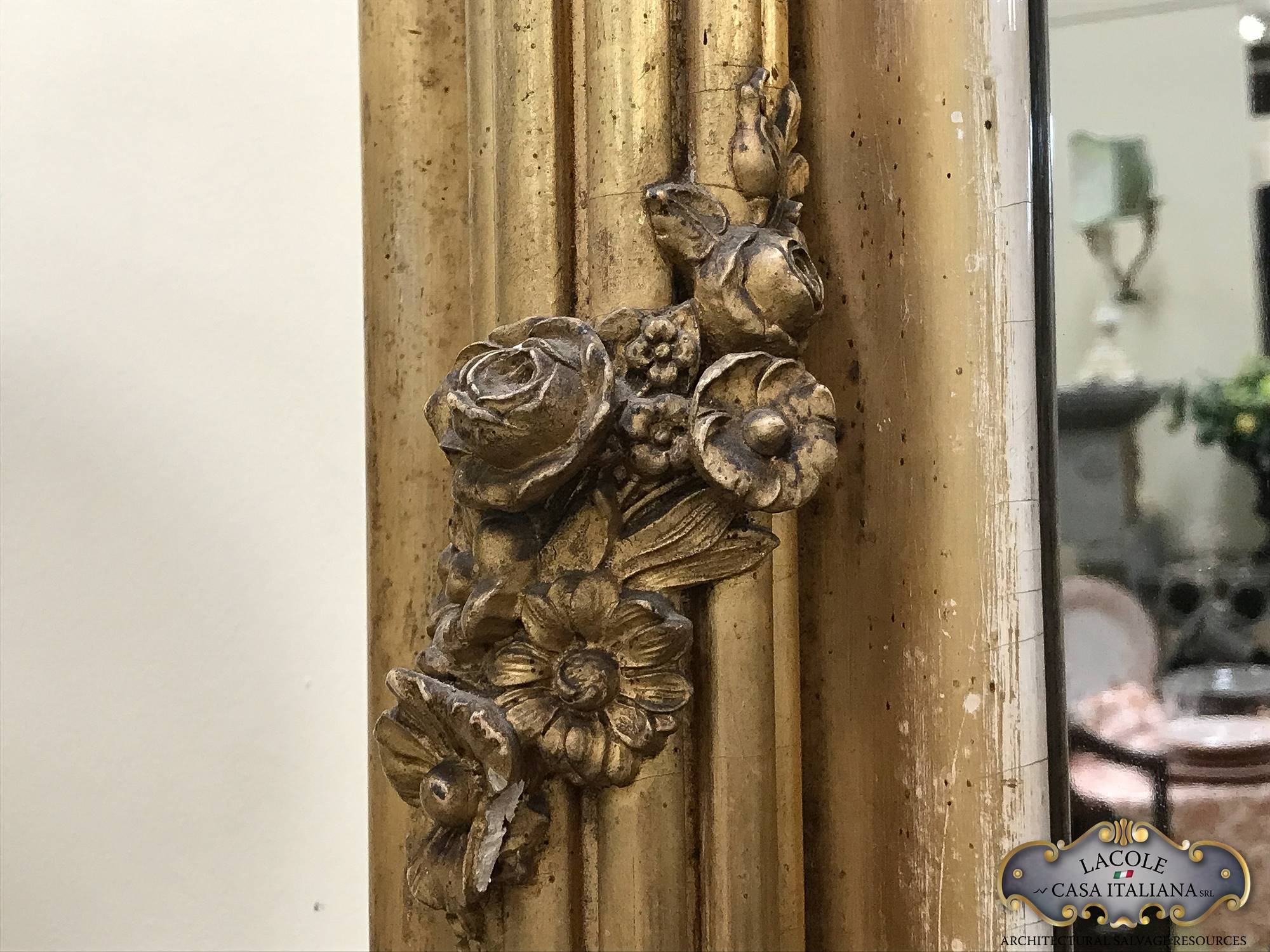 Antica specchiera in legno e stucchi dorati a foglia oro. La cornice è decorata a motivi floreali. Epoca 1800.