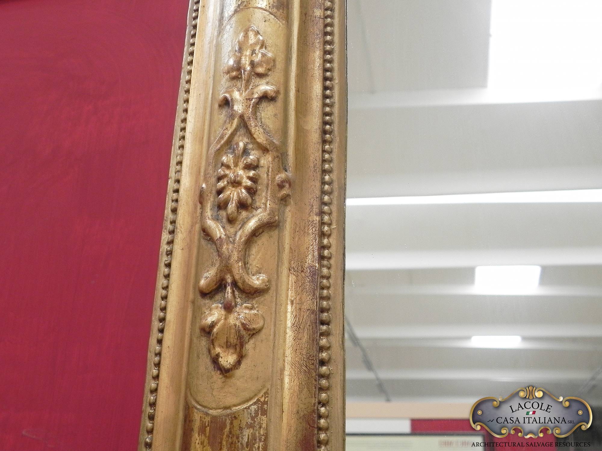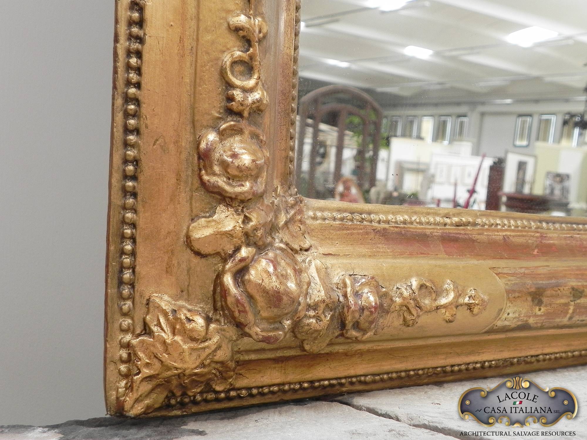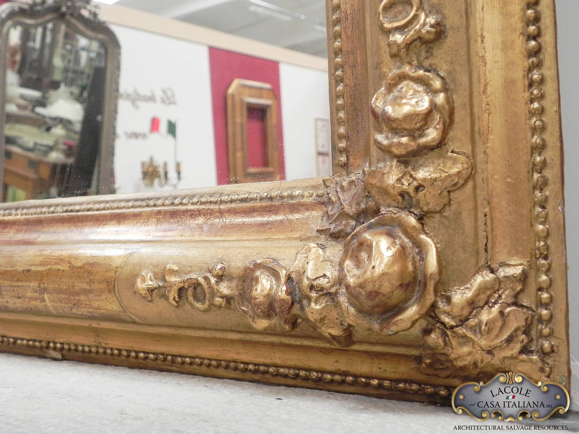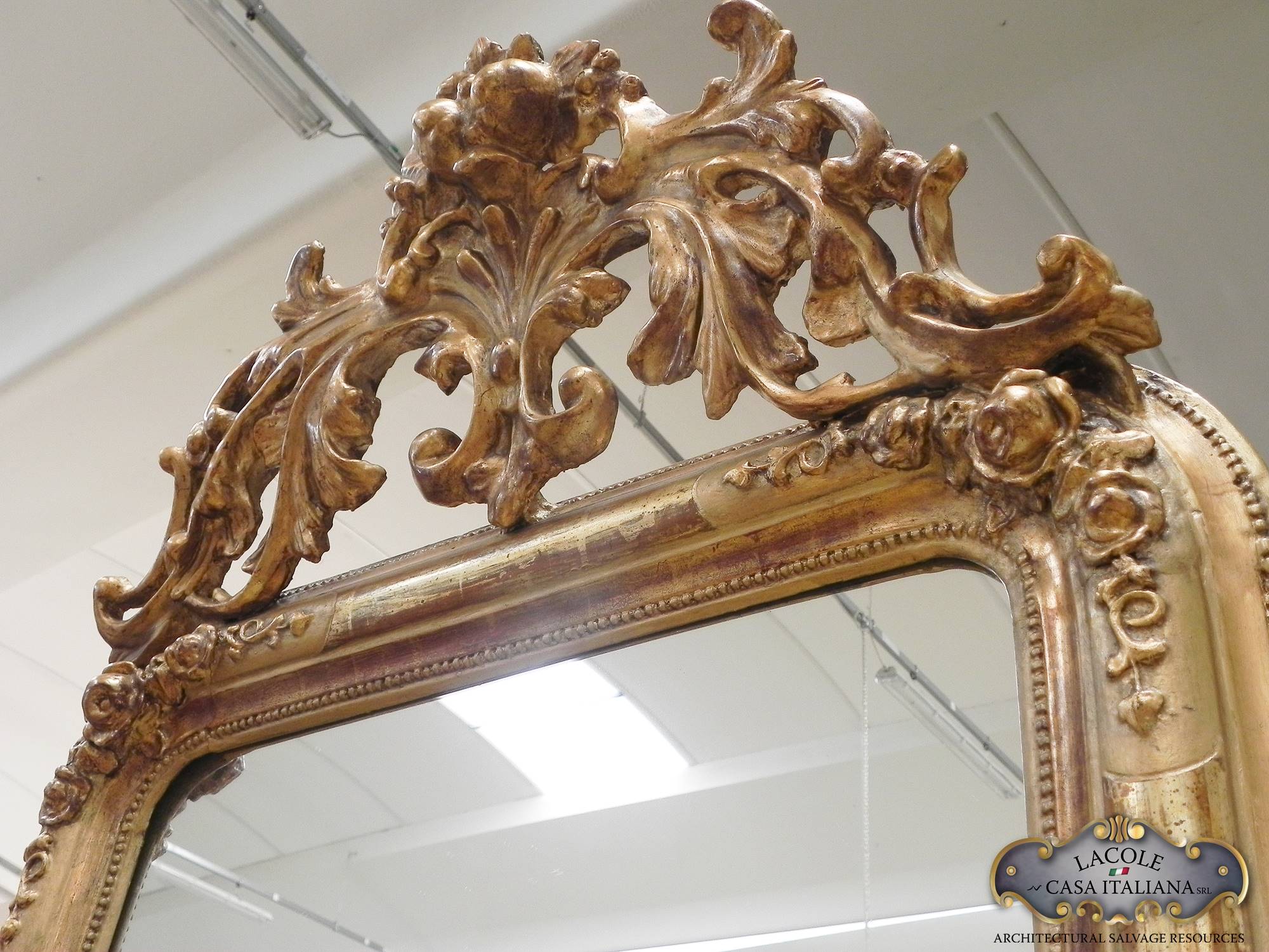 Antica specchiera Italiana, in legno e pastiglia, rifinita in oro. La specchiera antica è di epoca Ottocentesca. Bellissima ed importante la cimasa intagliata a motivi vegetali.