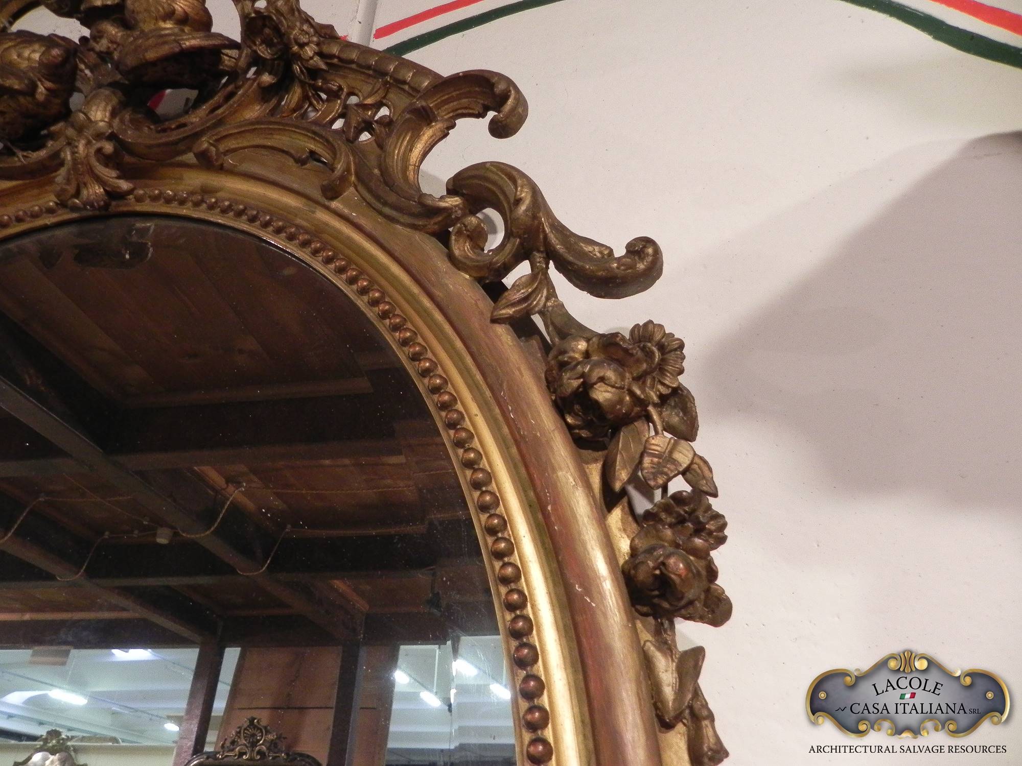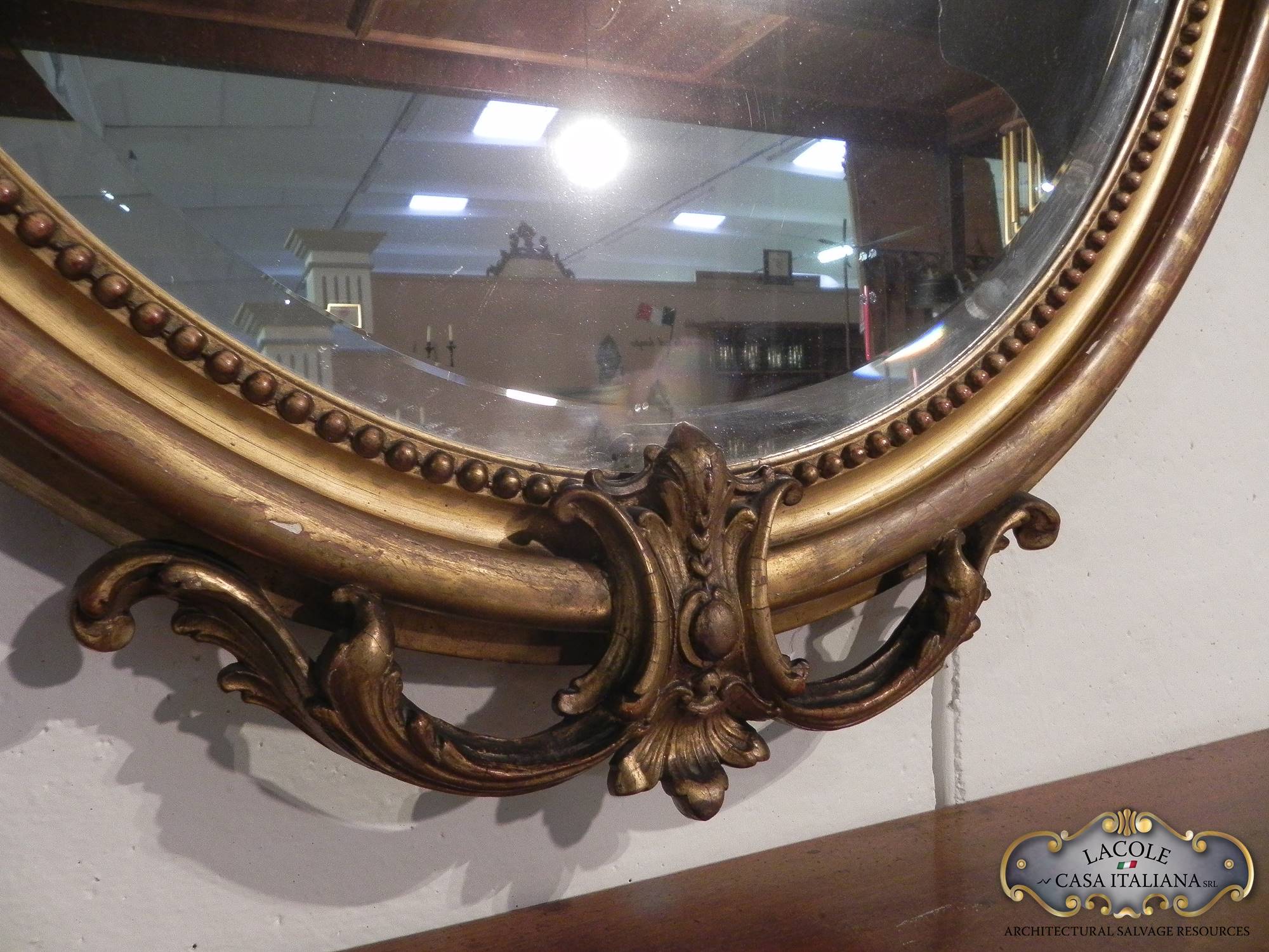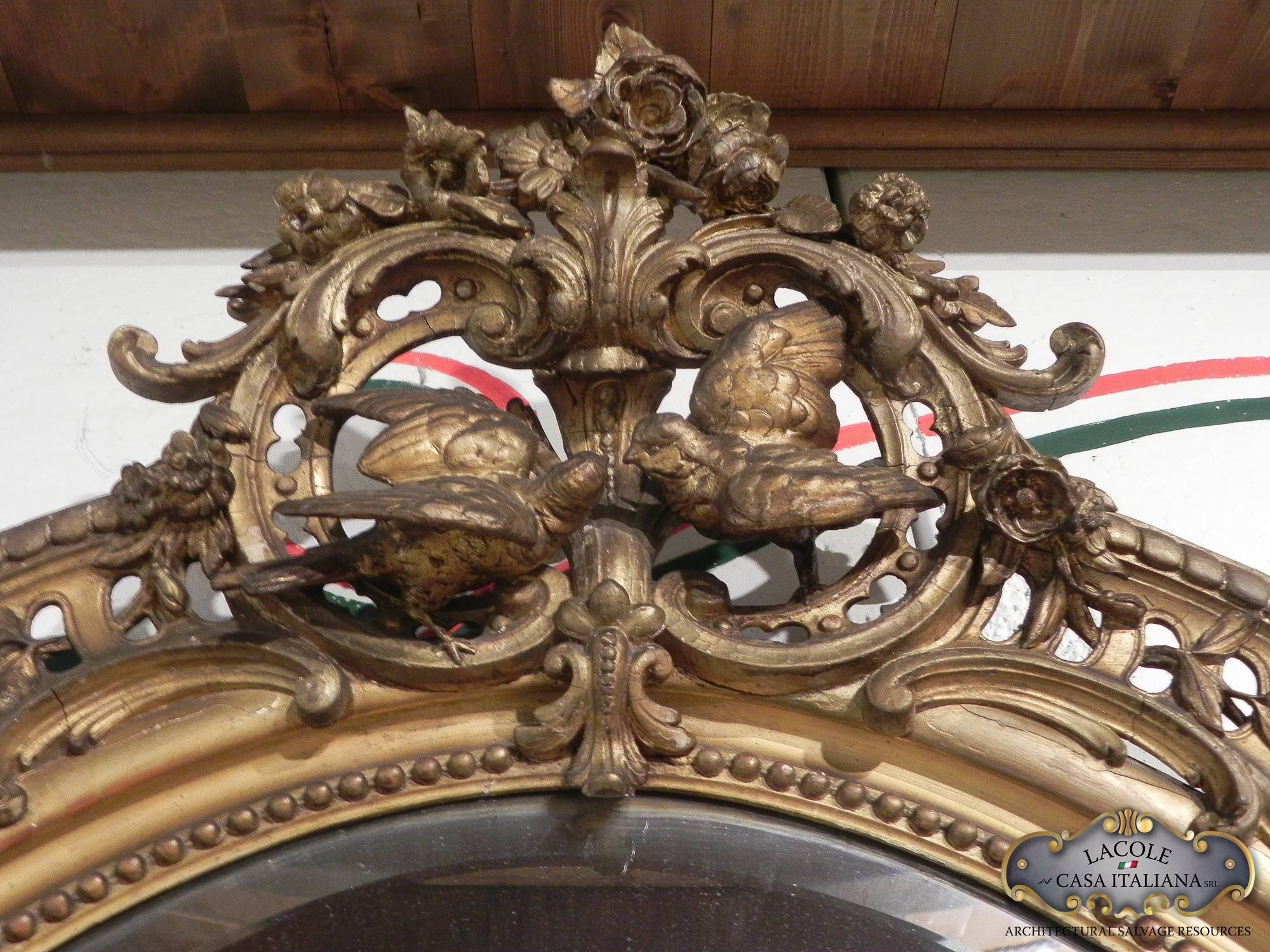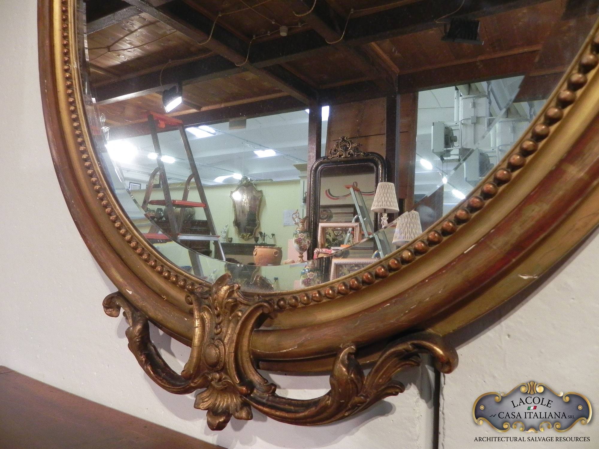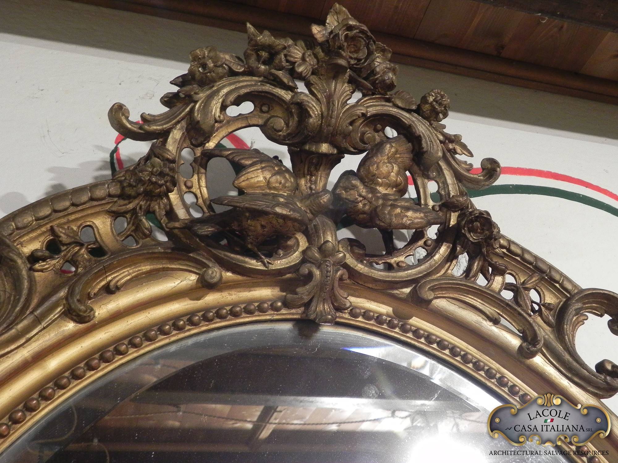 Specchiera ovale antica in legno, oro e stucchi. Specchio molato.